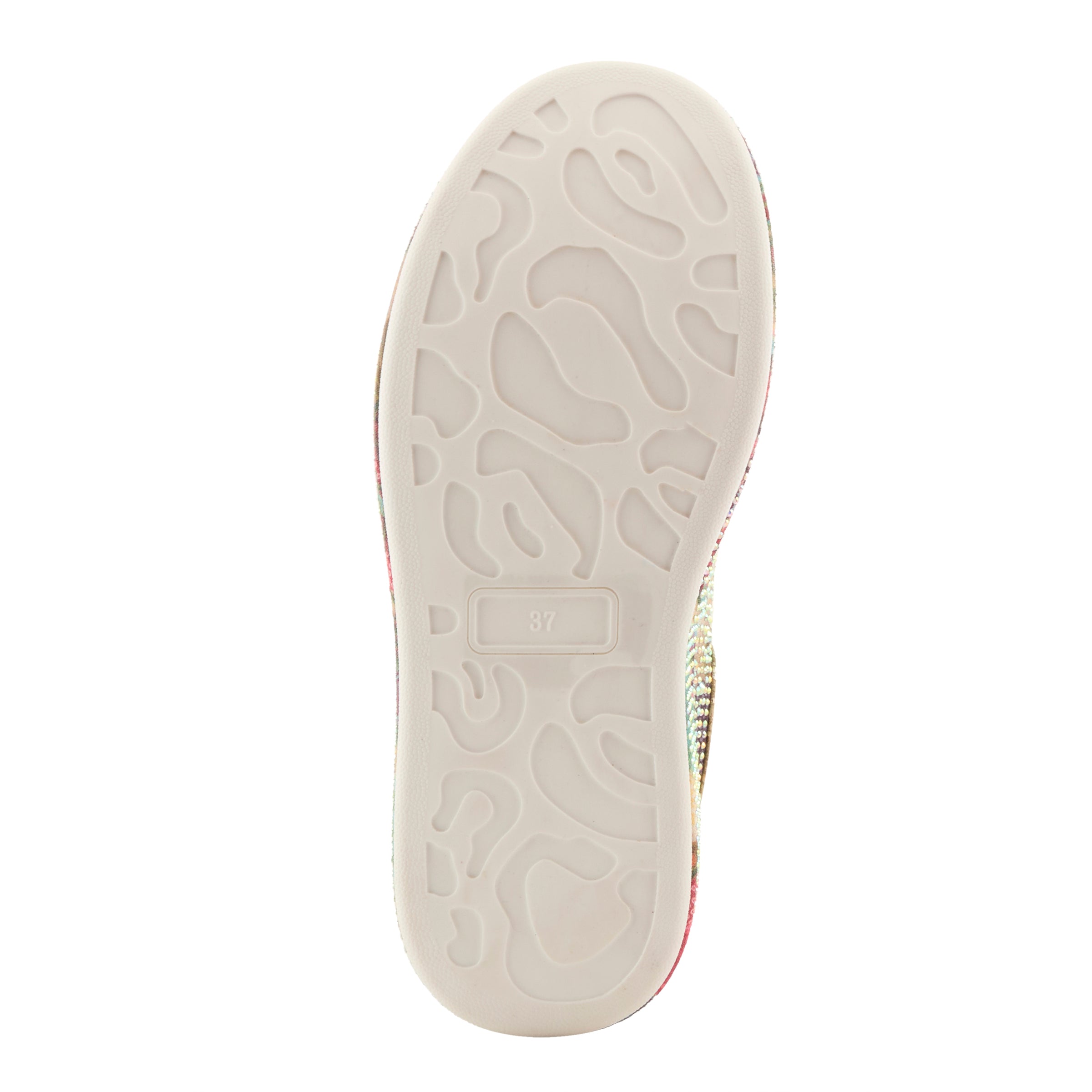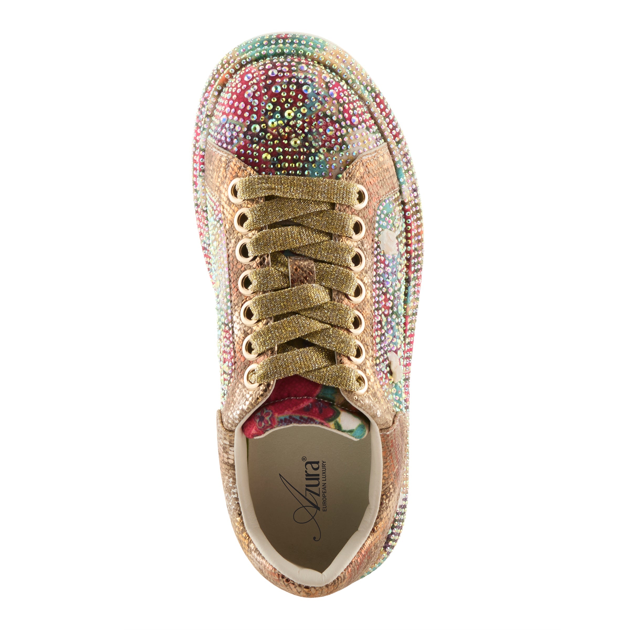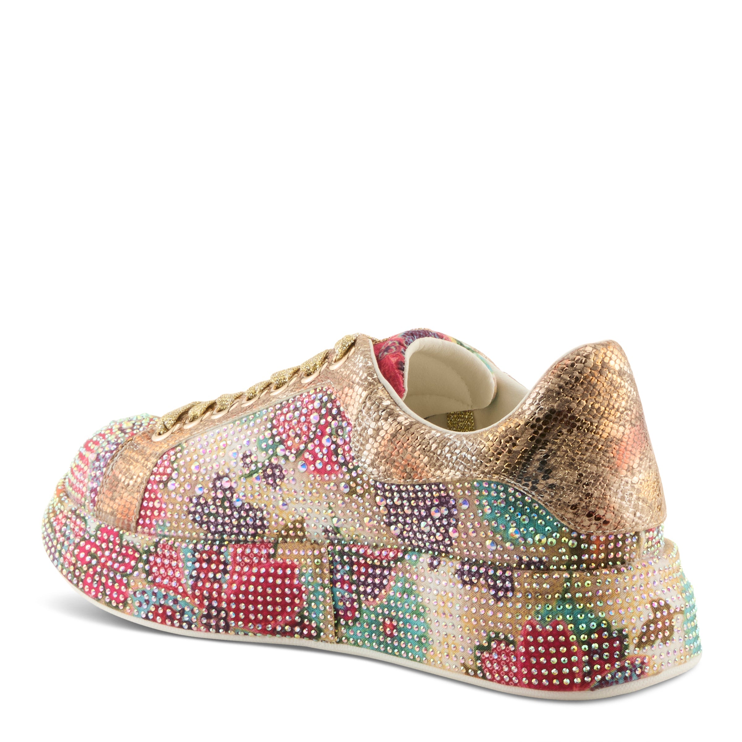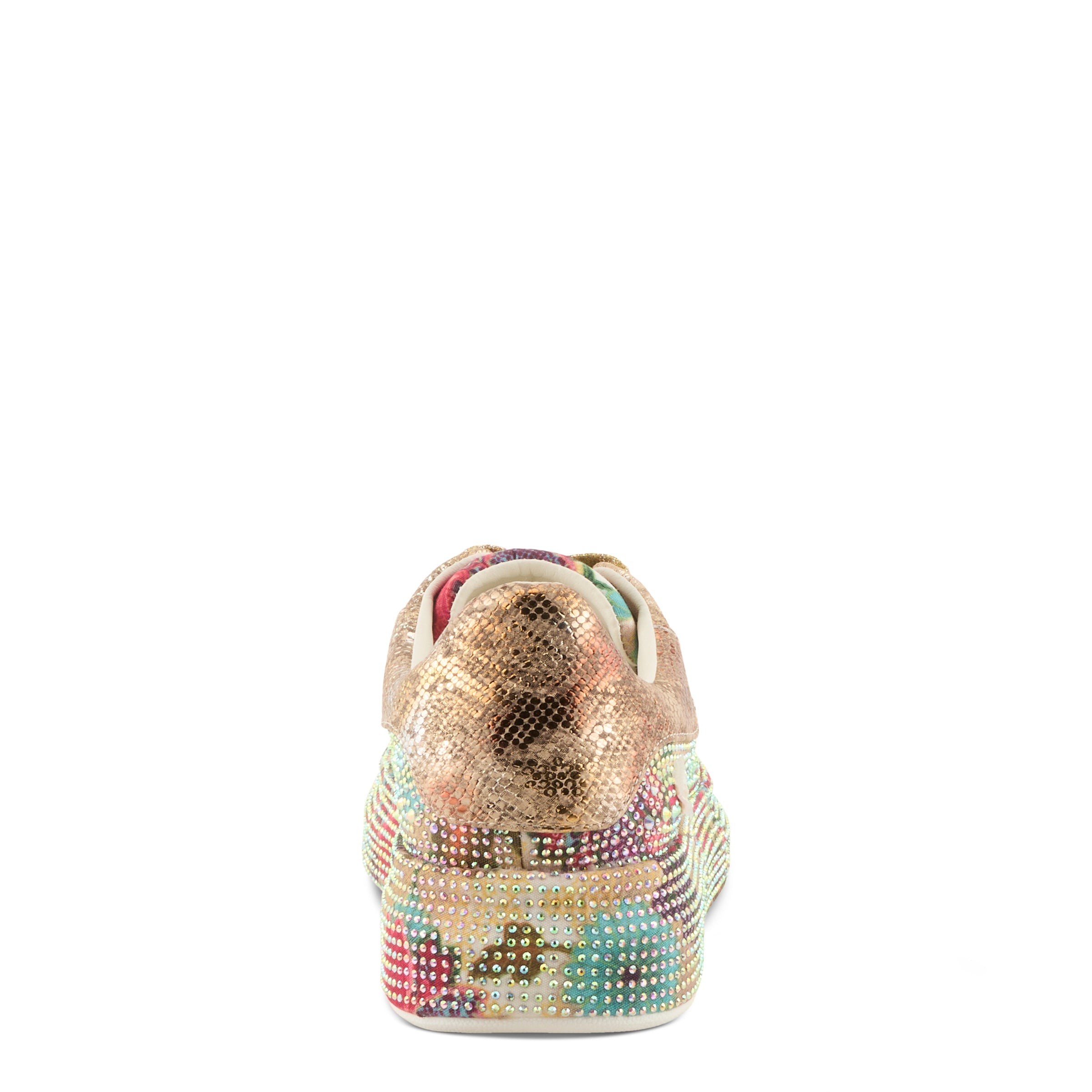 Stop the press—this is the sneaker that defines showstopping. Bold, glamorous, and unlike anything else, this design takes everyday casual and transforms it into a work of art. The upper features a vibrant floral print motif, drenched in an explosion of sparkle with all-over clear crystals in varying shapes and sizes, extending beyond the upper to cover the outsole for full-on brilliance, and trimmed in multi color snake metallic for the perfect and richest accent.