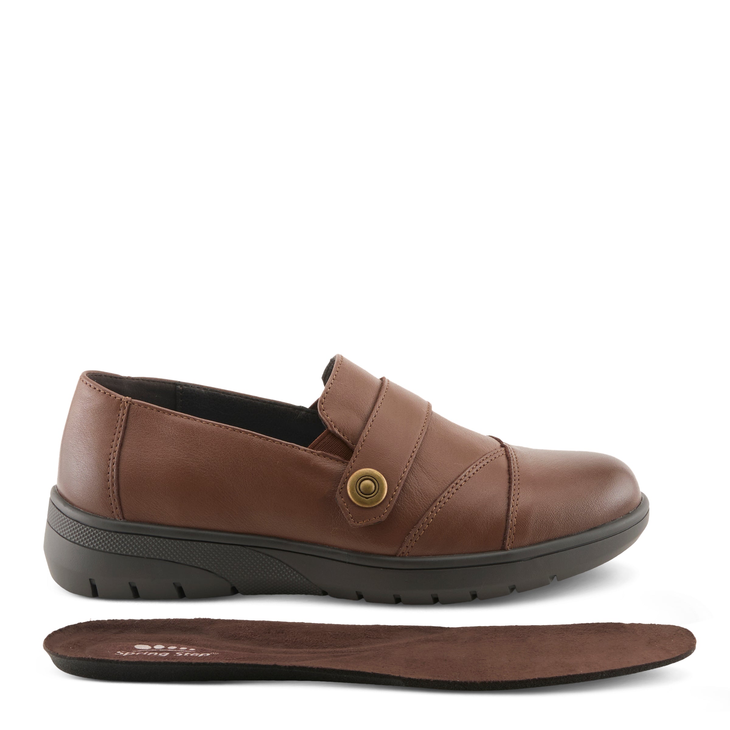 Designed for all-day ease, this sleek and versatile slip-on shoe blends comfort with a touch of elegance. Crafted from premium leather, it features double side goring for a flexible, customized fit and a decorative side hardware button that adds a subtle, sophisticated detail. The cushioned insole and lightweight outsole provide superior support, making this the perfect everyday shoe for work, errands, or casual outings.