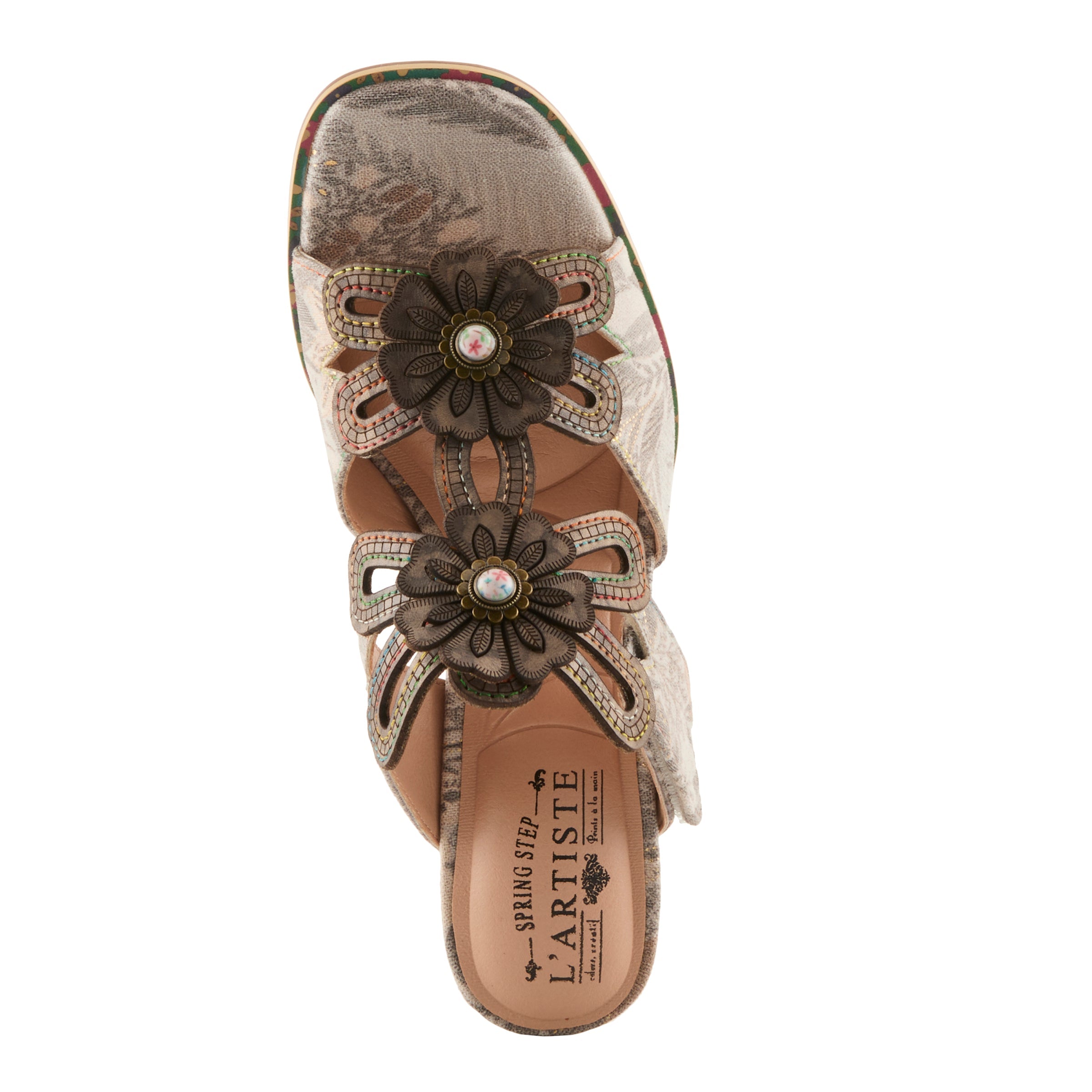 Step into a little piece of wearable art. This French-inspired slide blooms with three hand-finished leather blossoms—each one sculpted with petal cutouts and kissed with an antiqued cabochon center. Two soft bands and a graceful “vine” of flowers cradle the foot, while our artisans’ hand-painted finishes and color-washed edges bring the romance of L’Artiste to life.