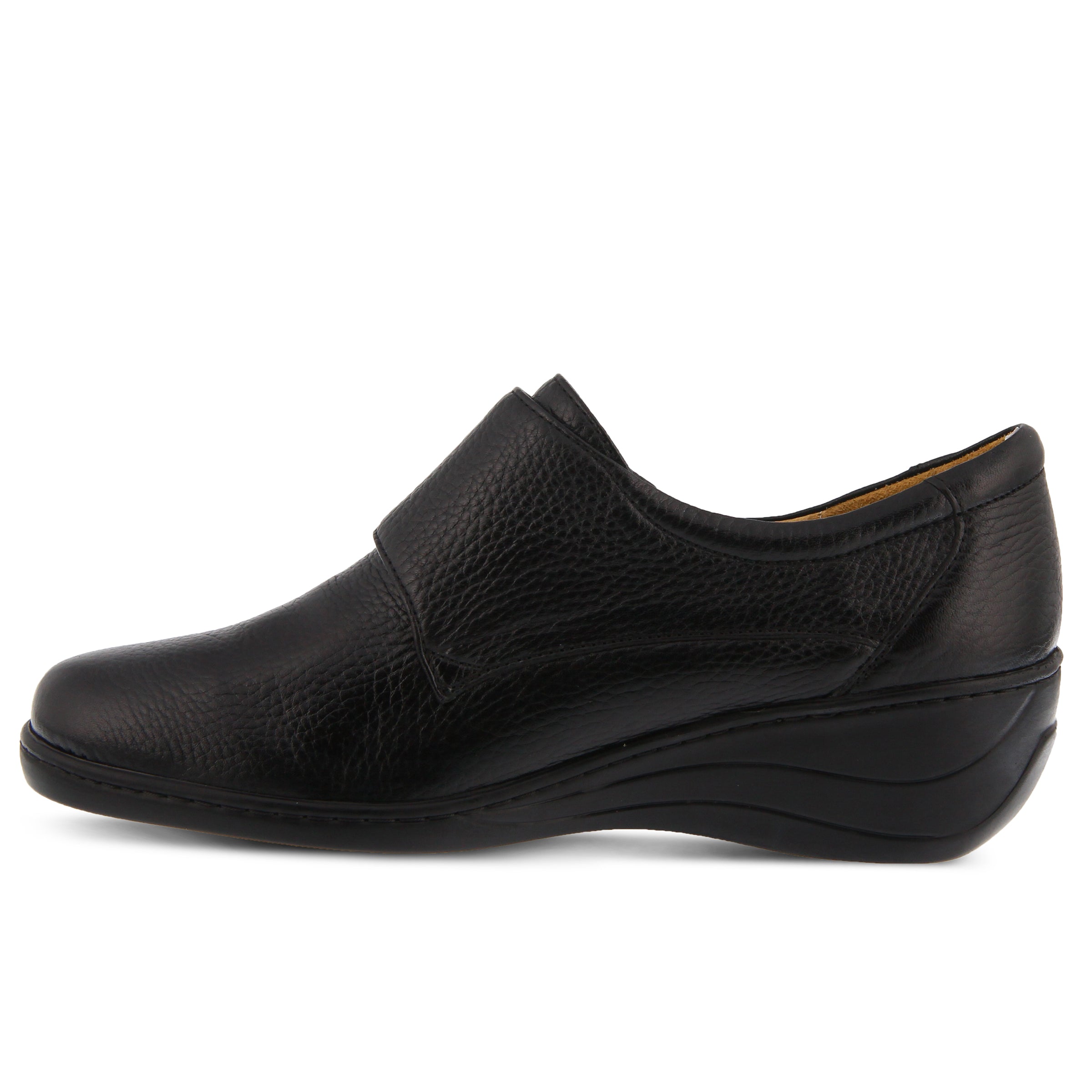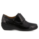 Snake embossed leather slip-on loafer with adjustable strap and padded heel collar.