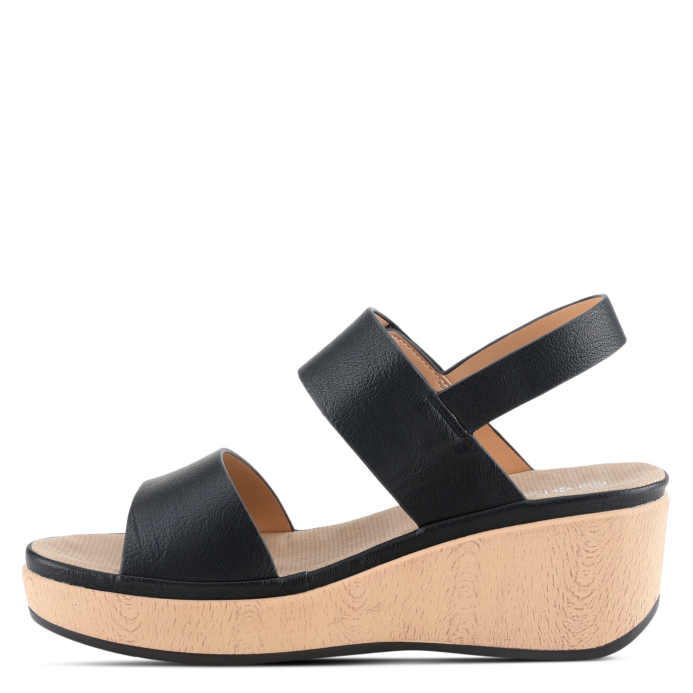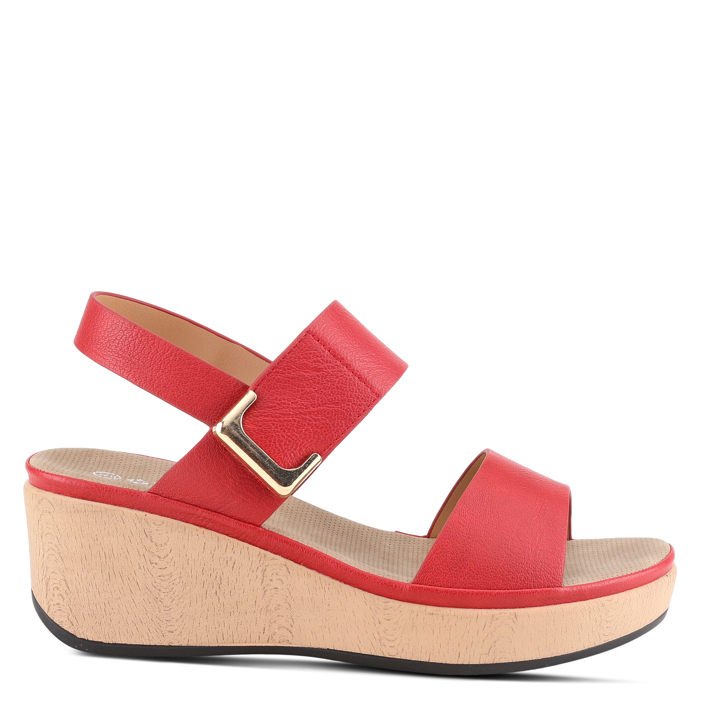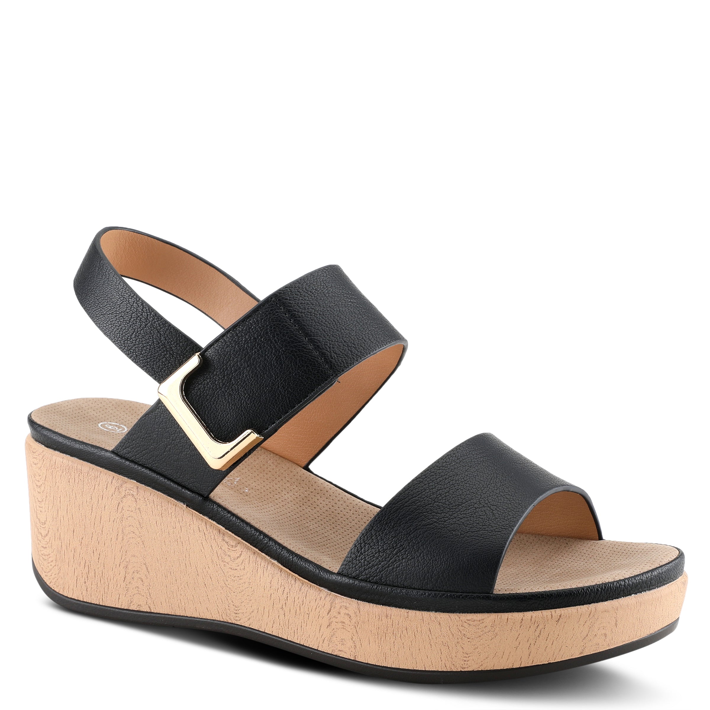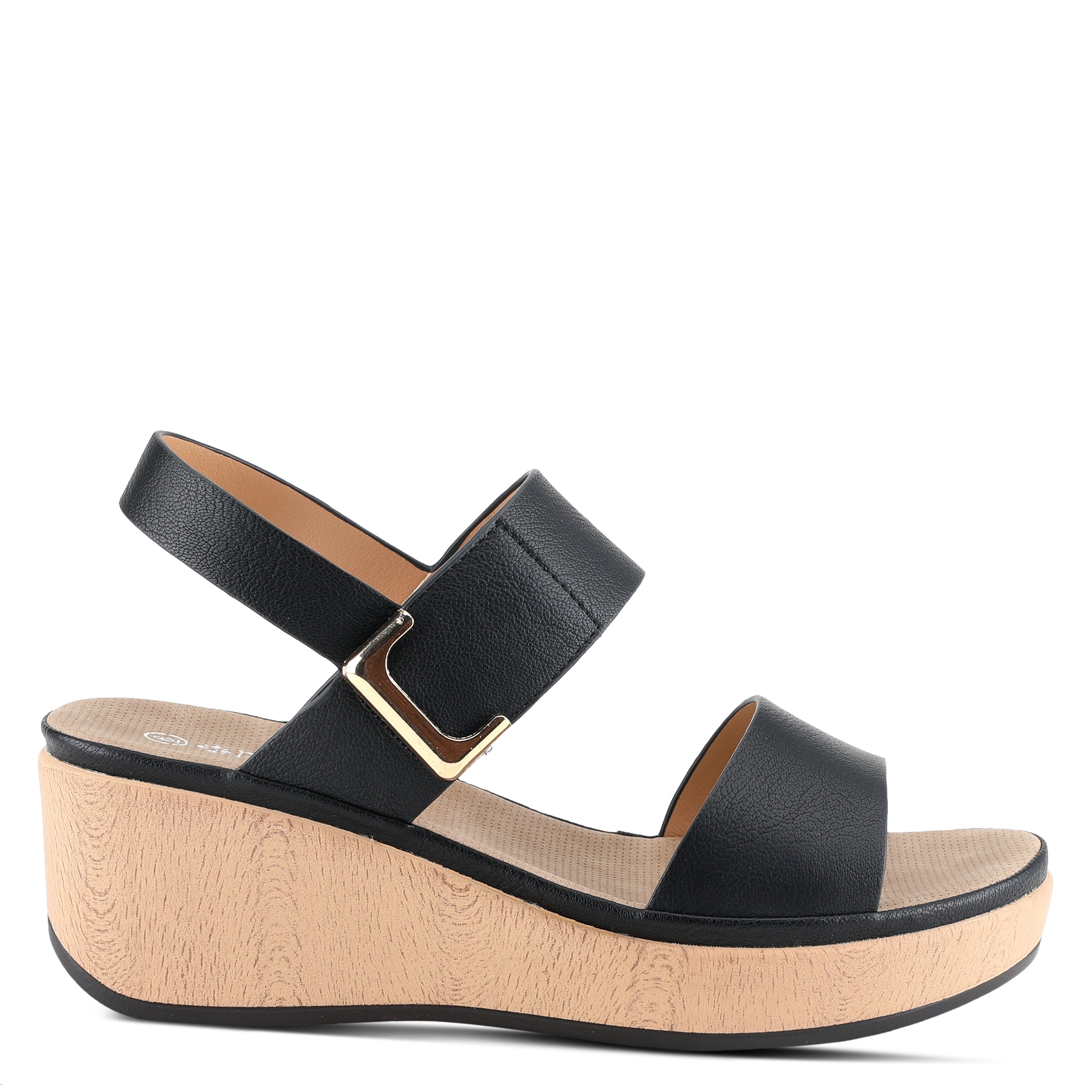 Featherweight two bands wedge sandal with hook and loop closure and high shine gold ornament on a wood like wrapped wedge with a platform.