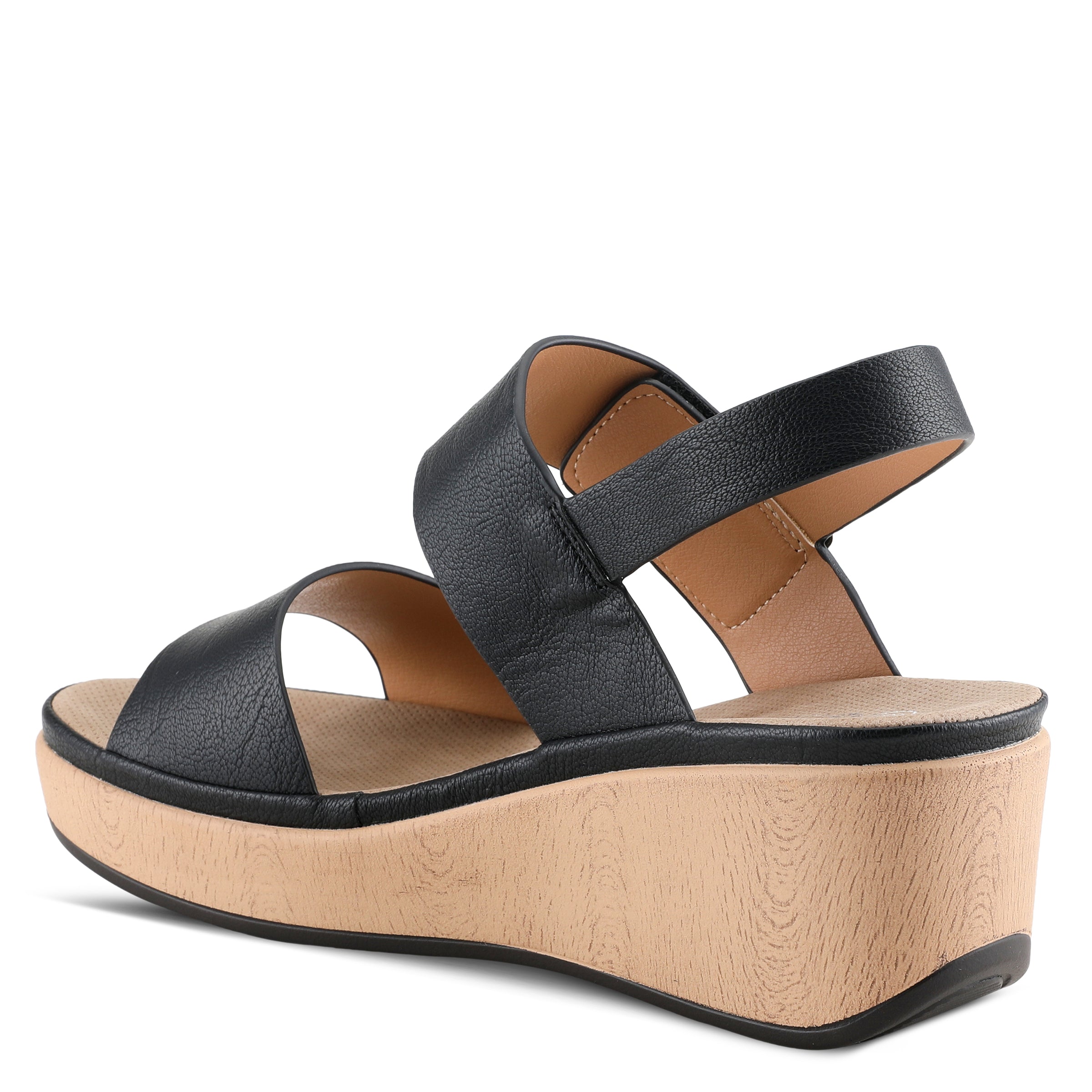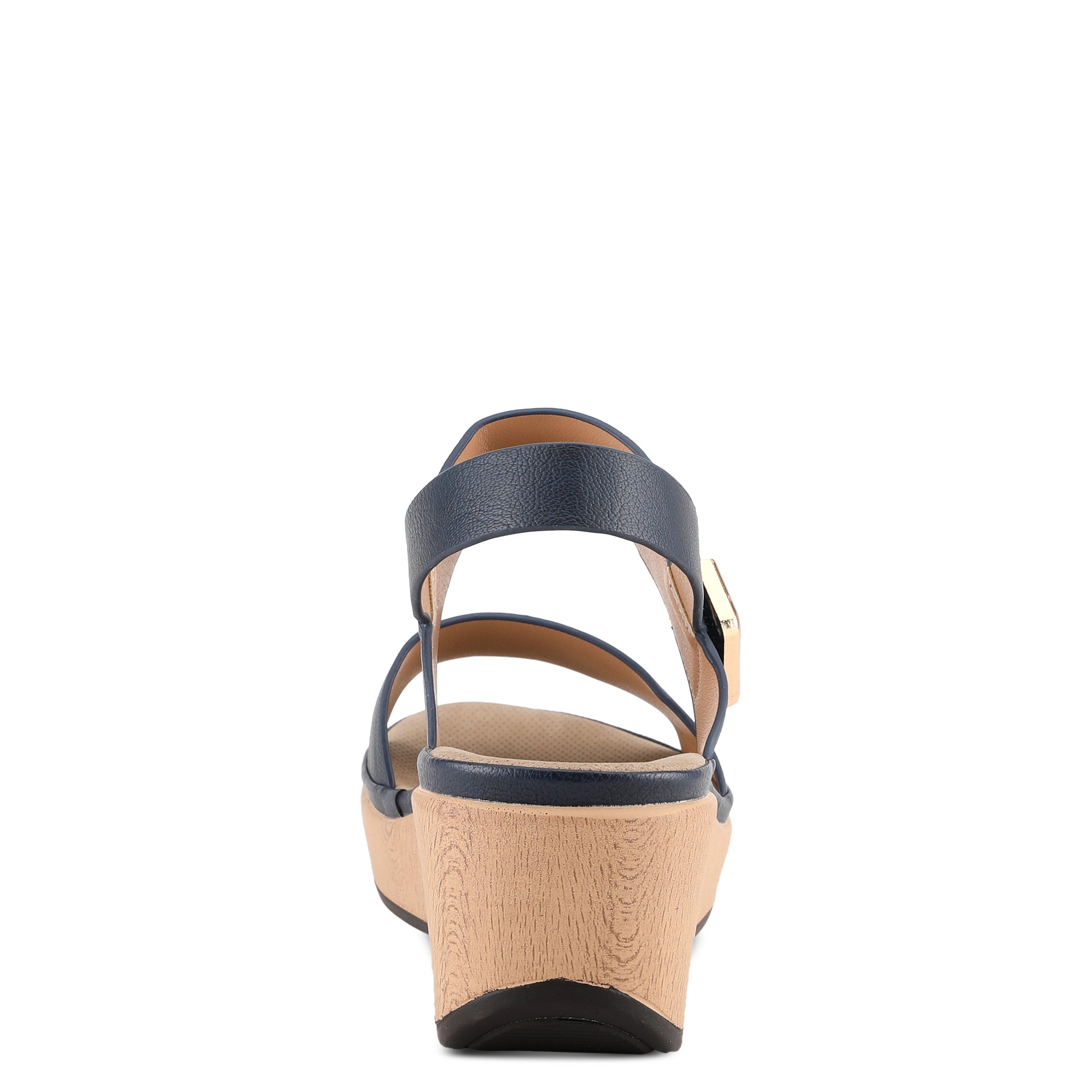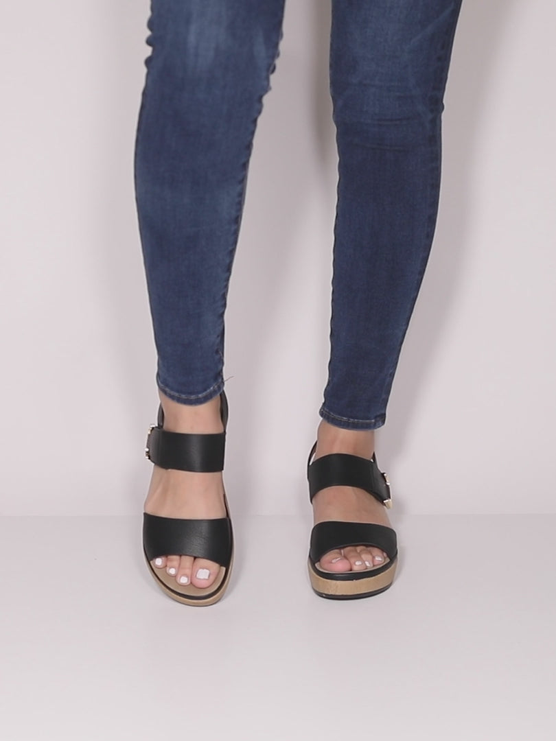 Featherweight two bands wedge sandal with hook and loop closure and high shine gold ornament on a wood like wrapped wedge with a platform.
