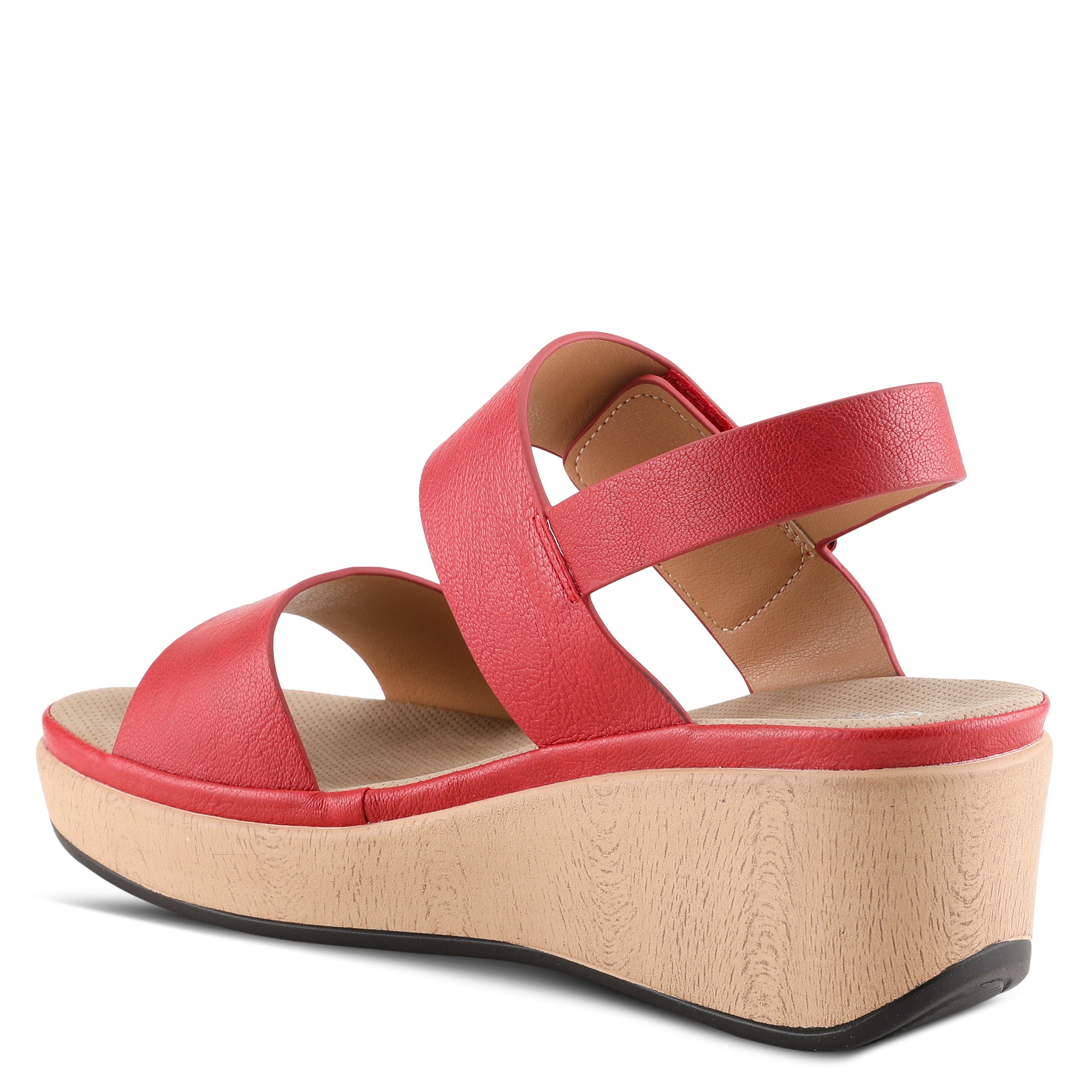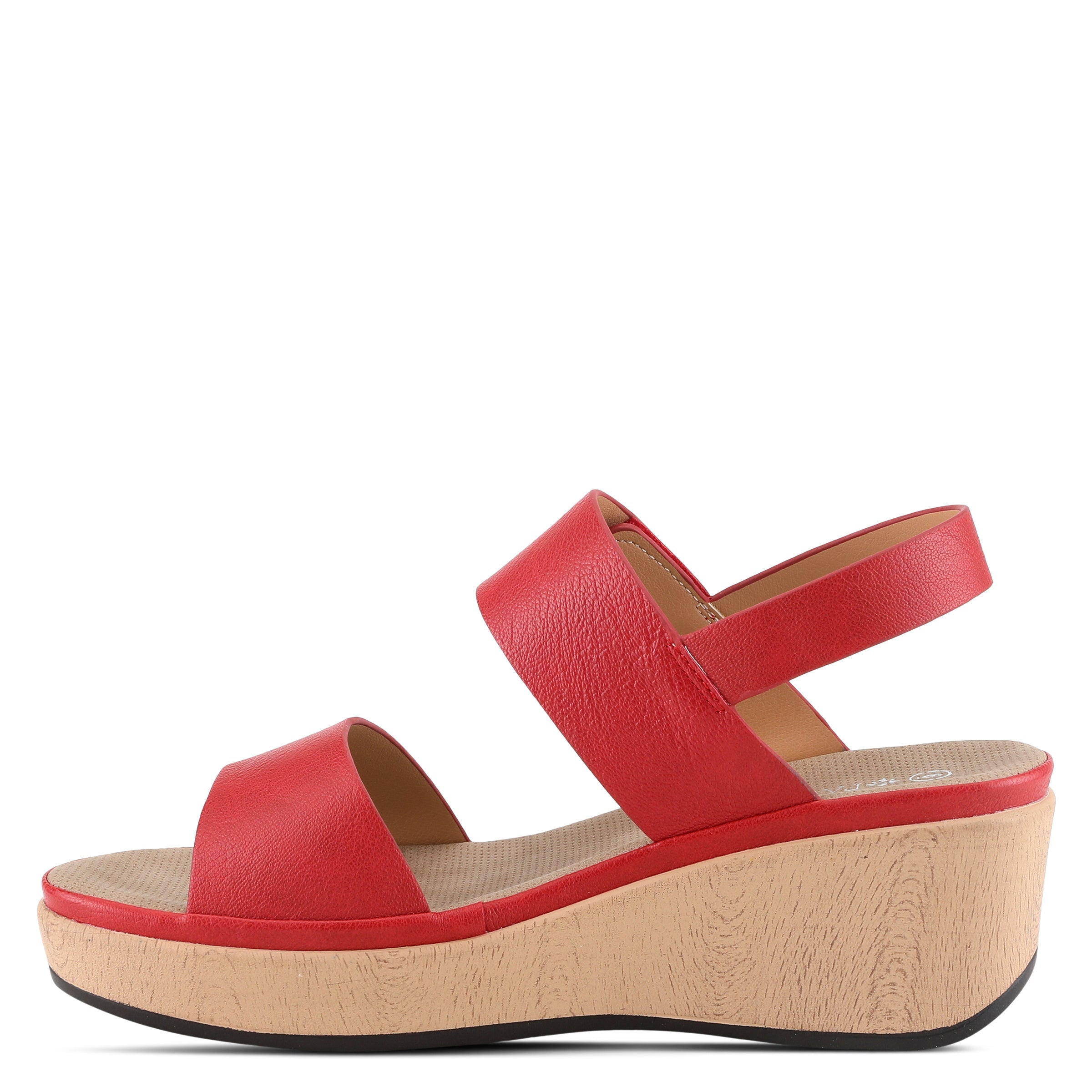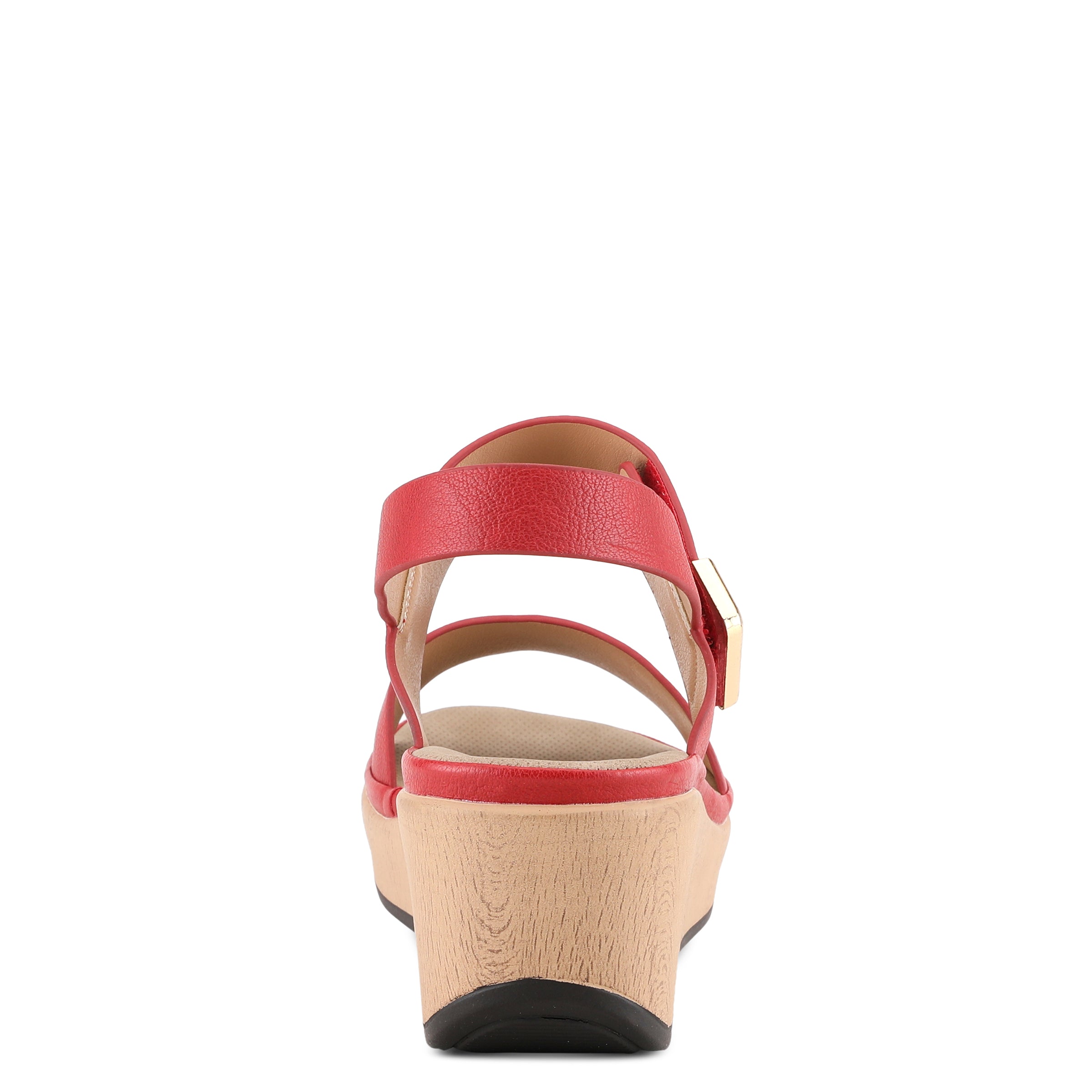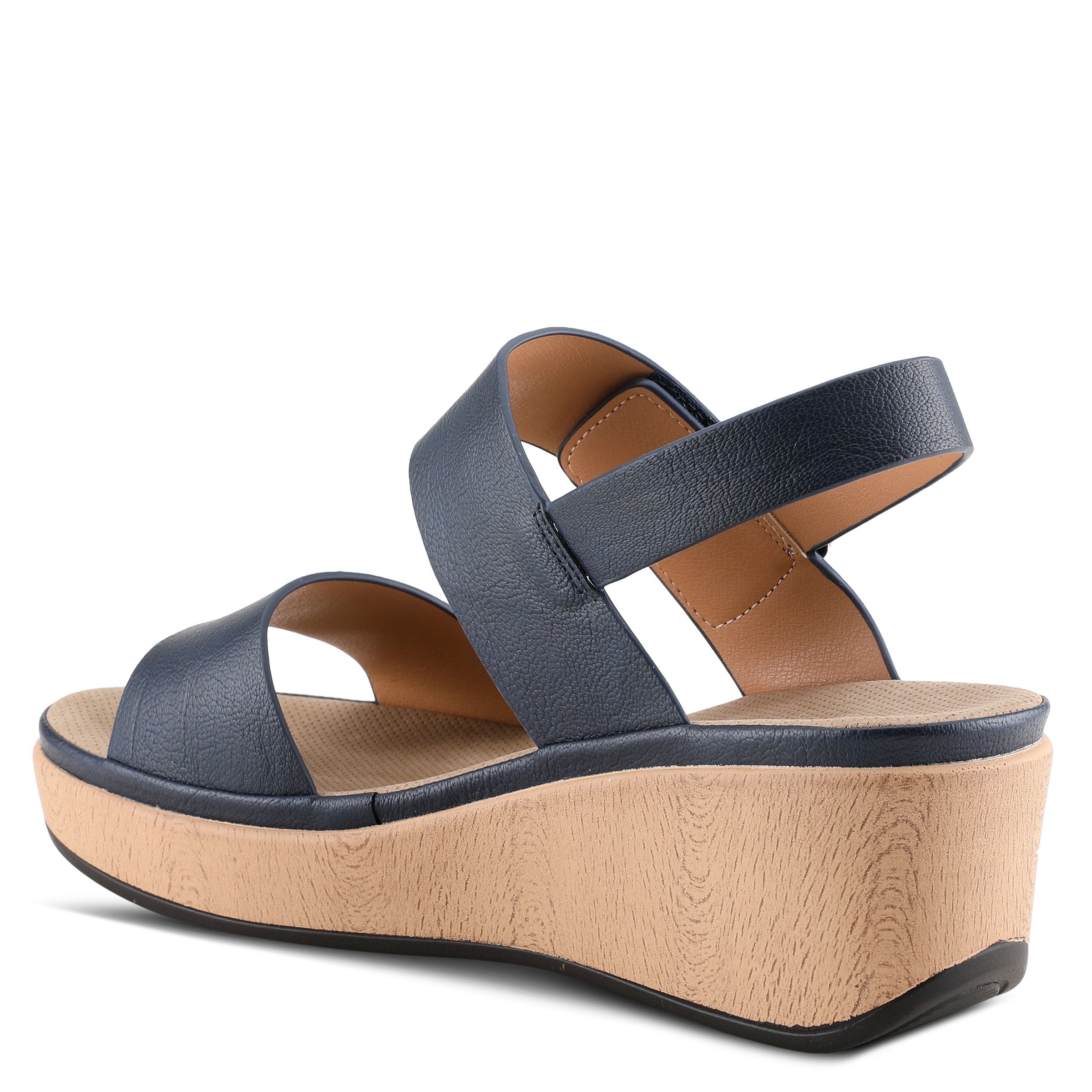 Featherweight two bands wedge sandal with hook and loop closure and high shine gold ornament on a wood like wrapped wedge with a platform.