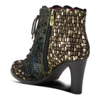 French-inspired metallic patterned leather boot with beautiful floral printed microfiber, vibrant rainbow stitching detail and 5 antique eyelets with a wax cotton lace.