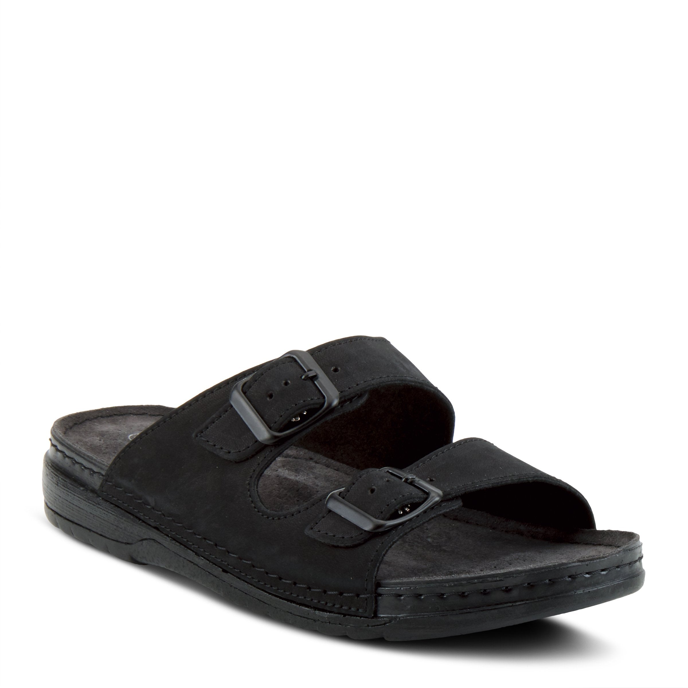 A stitch to sole construction nubuck leather slide sandal with dual buckle straps for adjustability and fit. The leather covered padded footbed adds to the comfort of this very soft and flexible sandal.