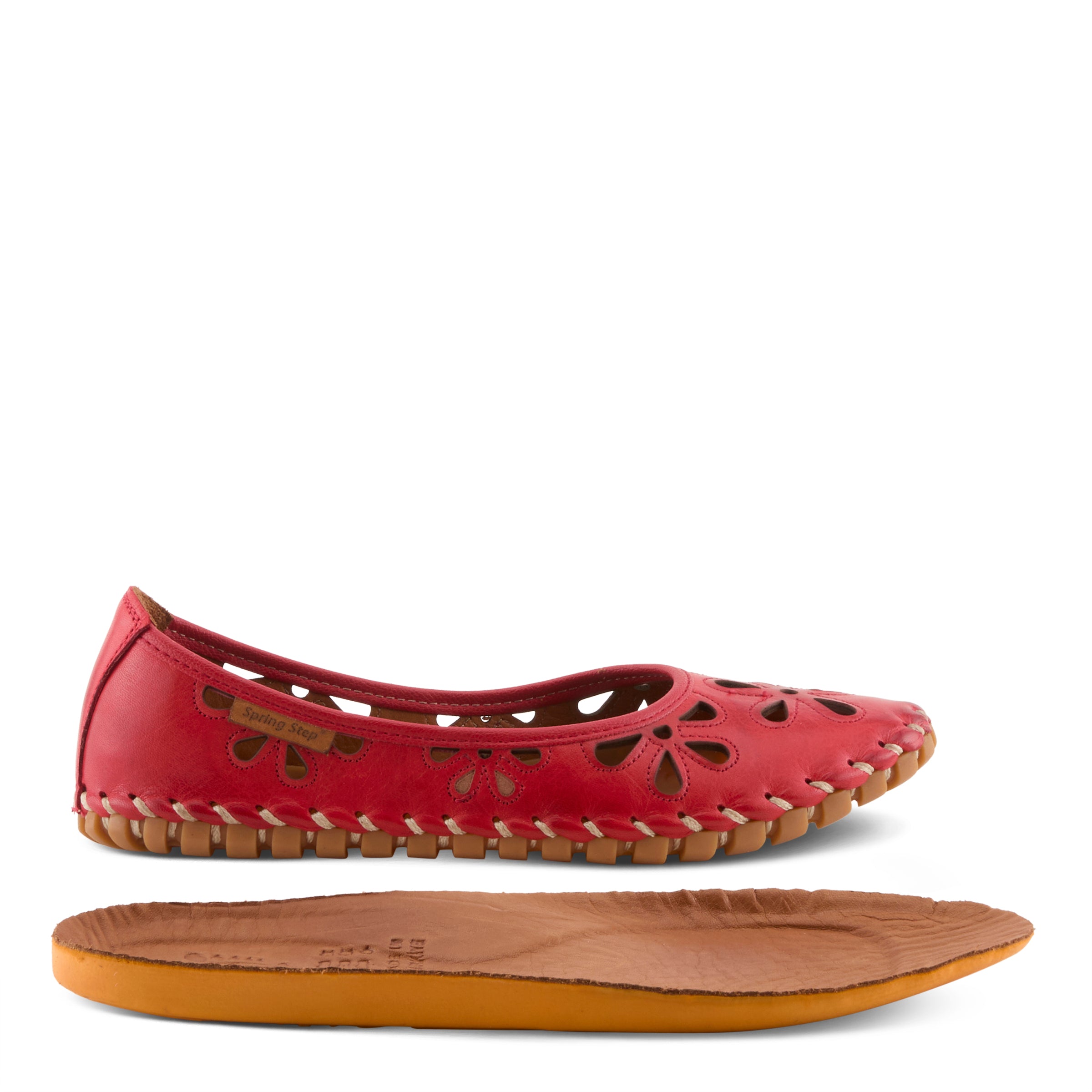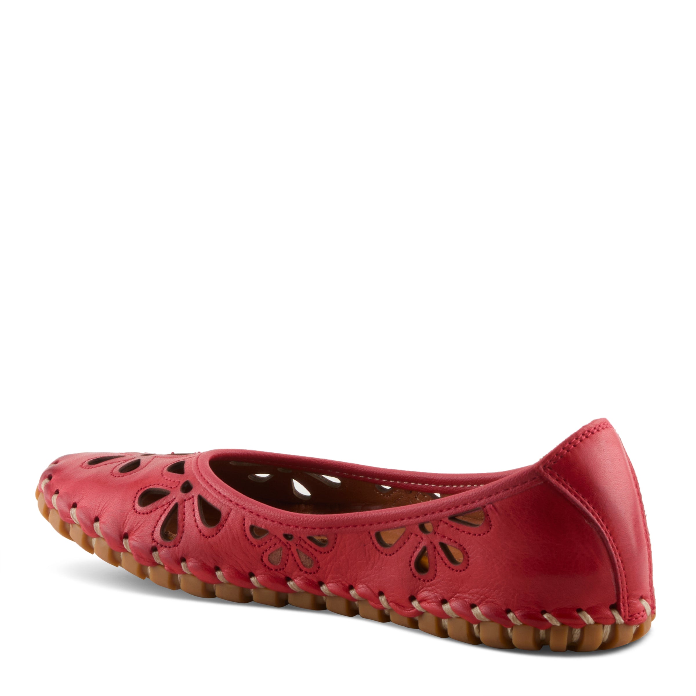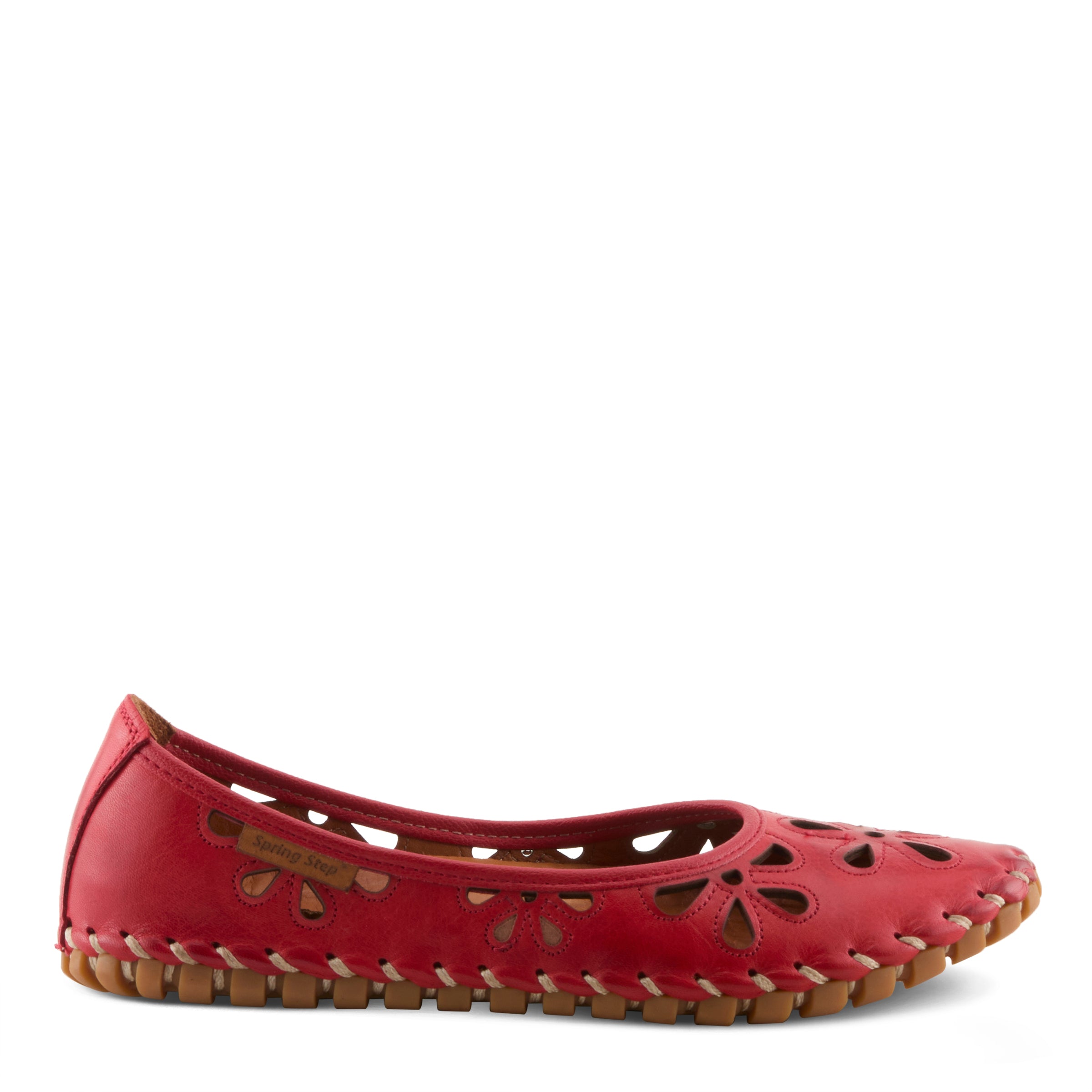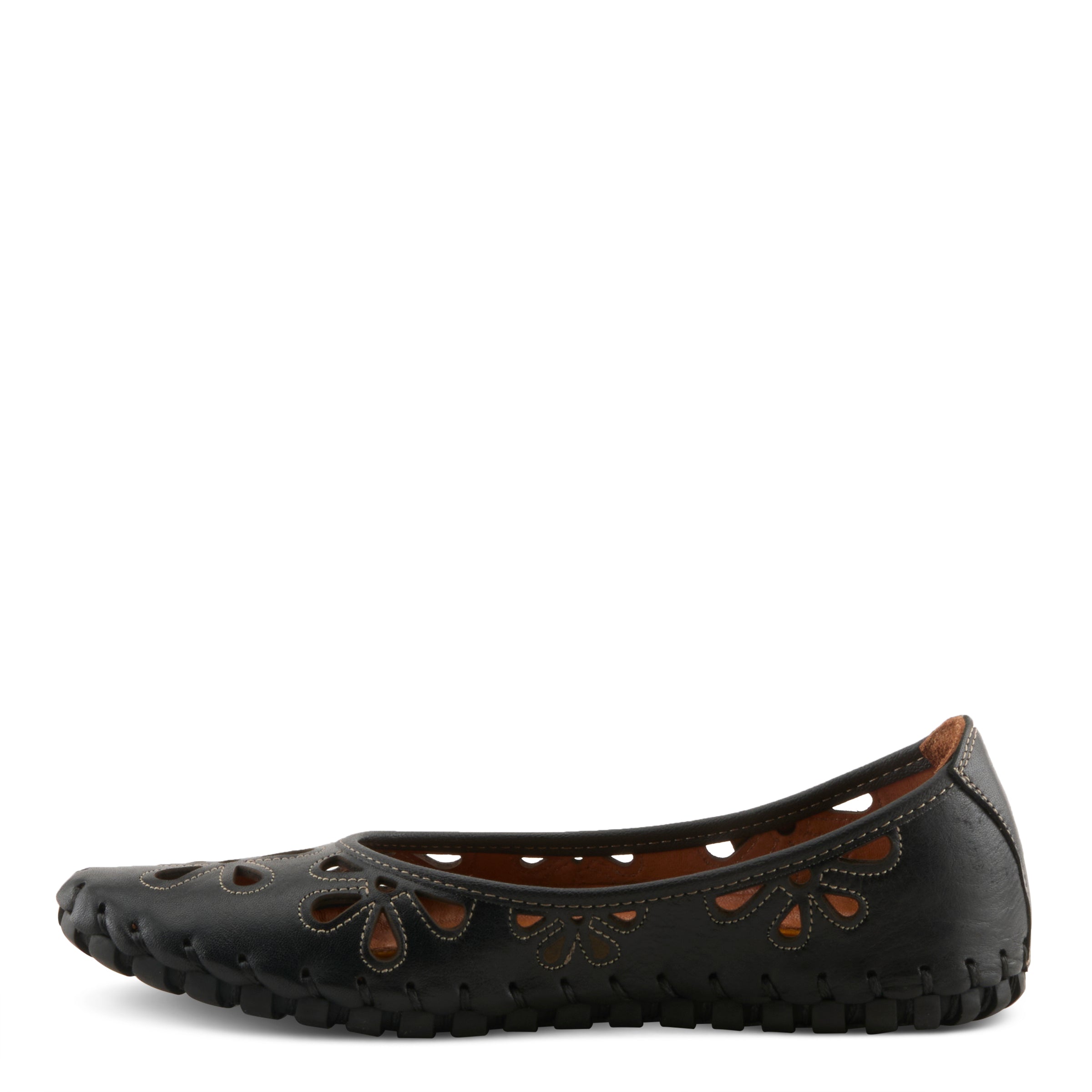 Show stopping leather slip-on ballerina flat is a European influenced design featuring floral shape laser cutouts and outlining stitch design for a unique modern appeal on an incredibly flexible and comfortable stitch to construction sole.