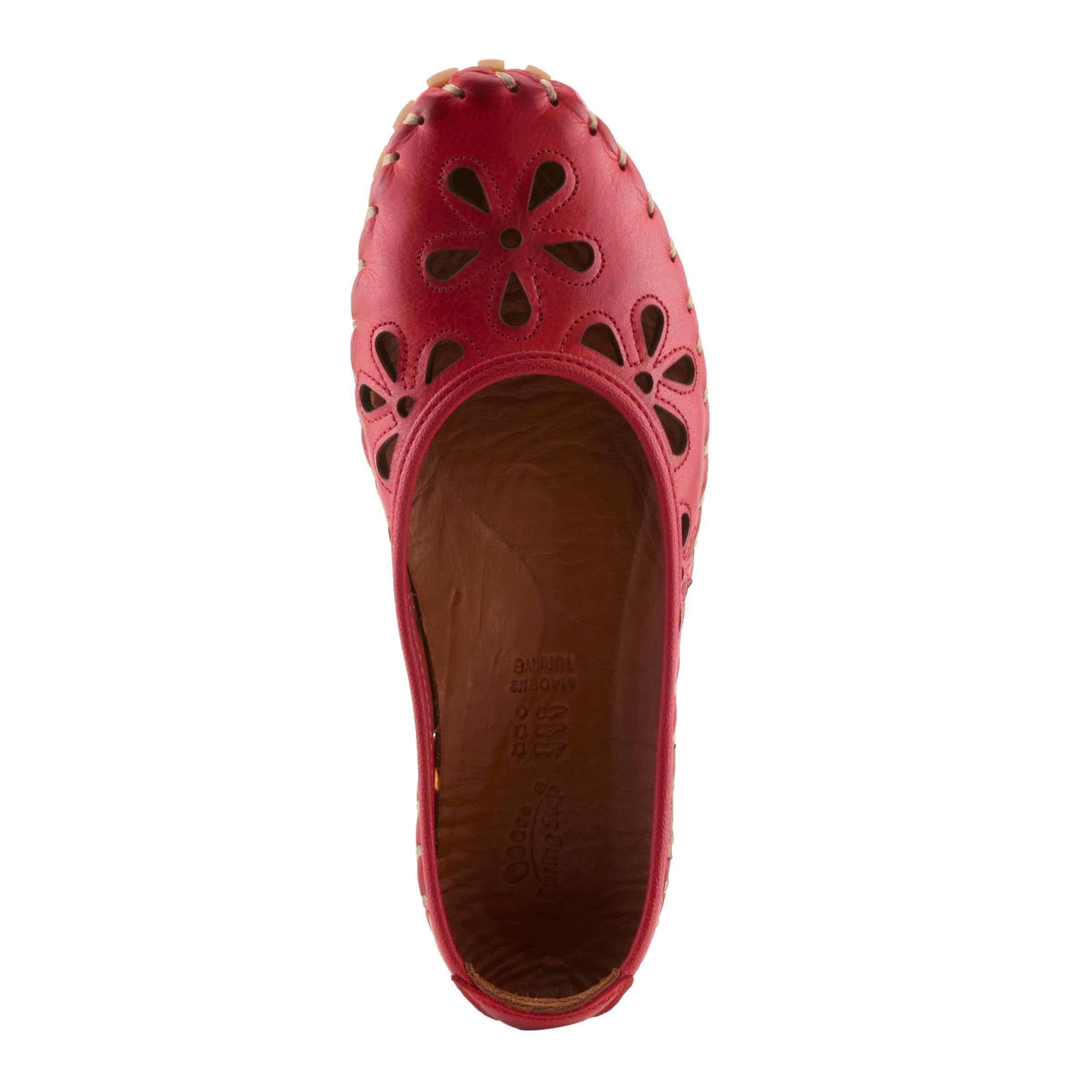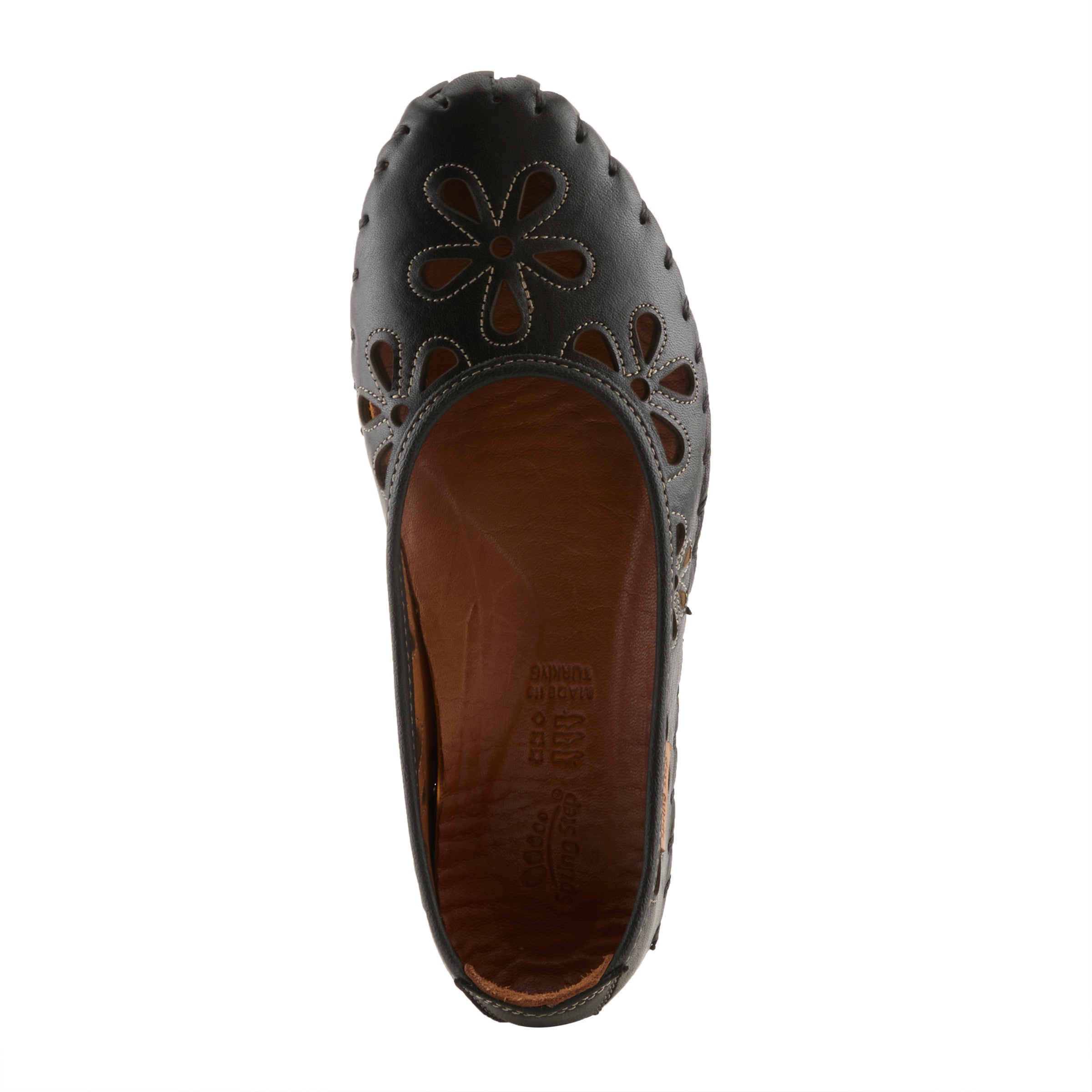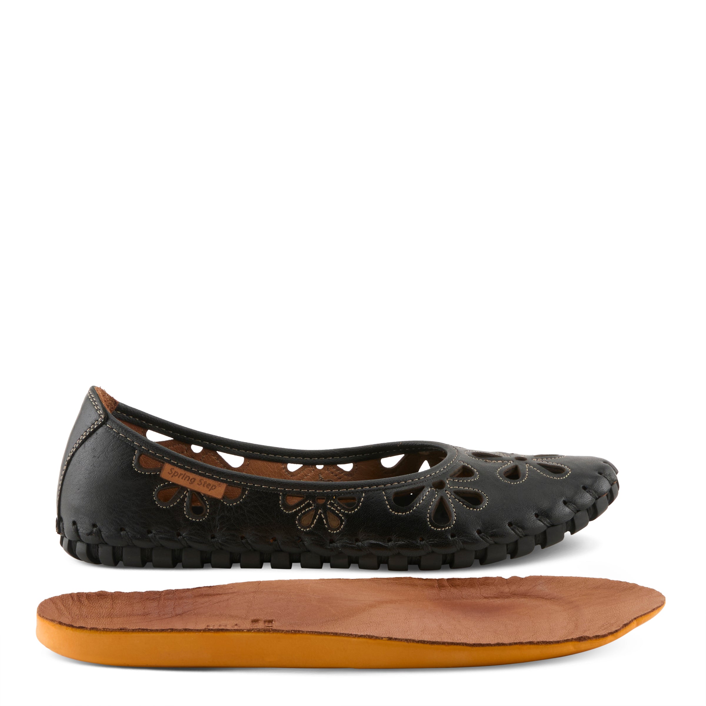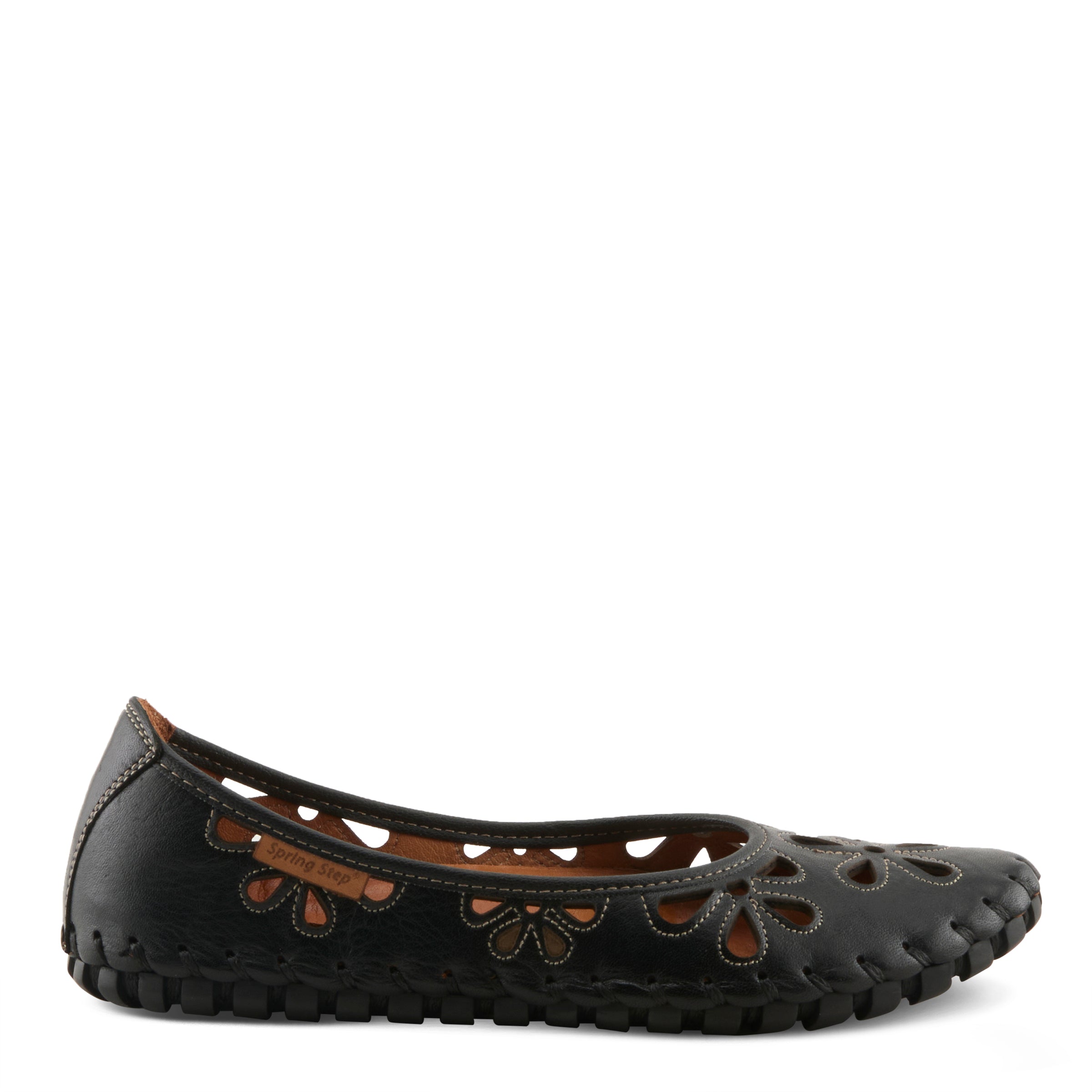 Show stopping leather slip-on ballerina flat is a European influenced design featuring floral shape laser cutouts and outlining stitch design for a unique modern appeal on an incredibly flexible and comfortable stitch to construction sole.
