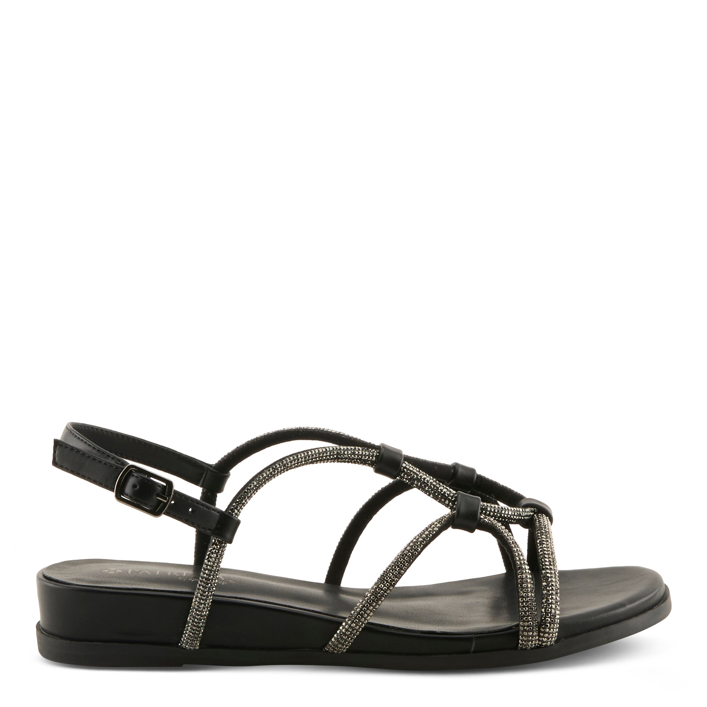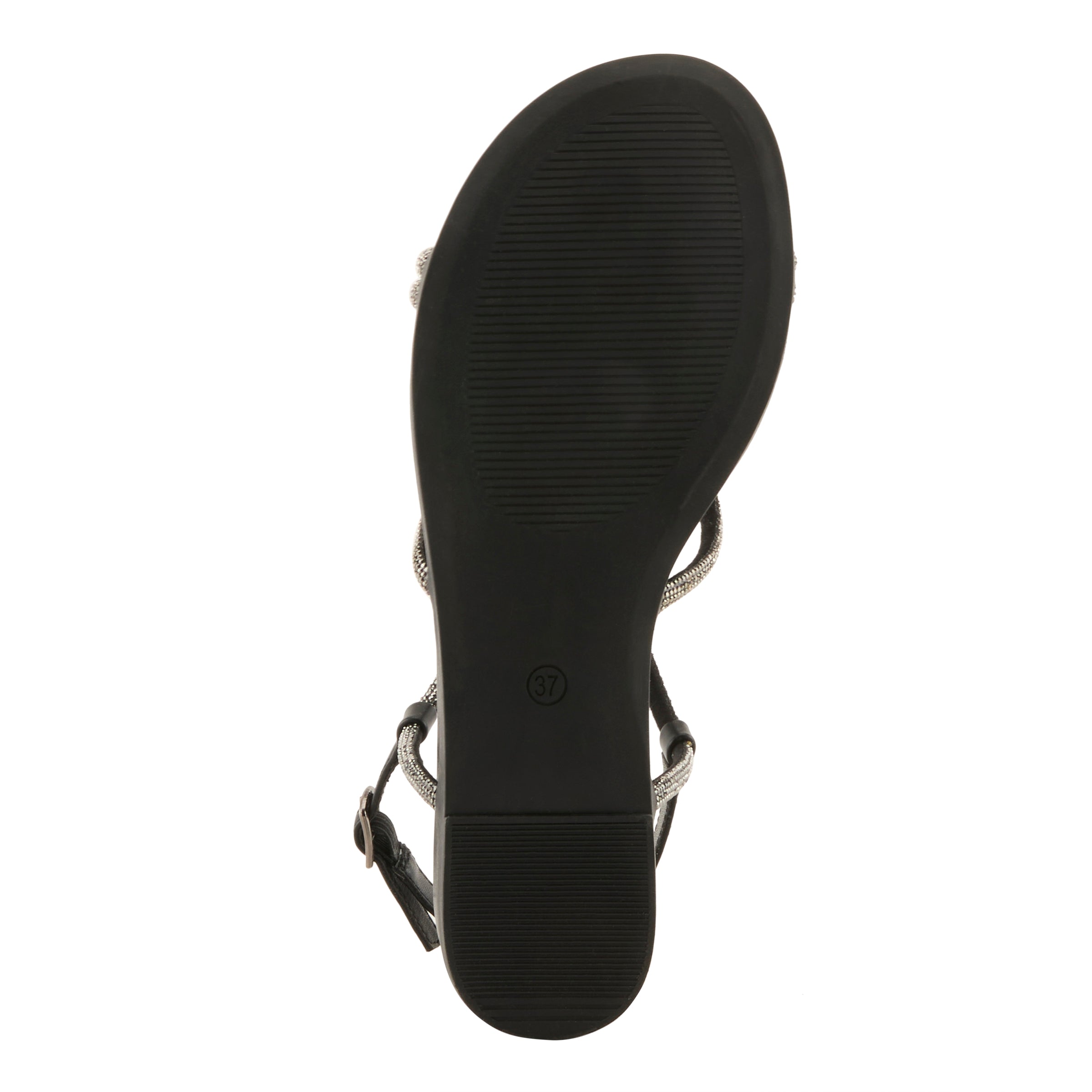 The cushioned footbed ensures lasting comfort, making it ideal for everything from casual outings to evening events. With its versatile black design and sleek metallic detailing, this sandal transitions seamlessly from day to night, giving your wardrobe a fashionable edge.
