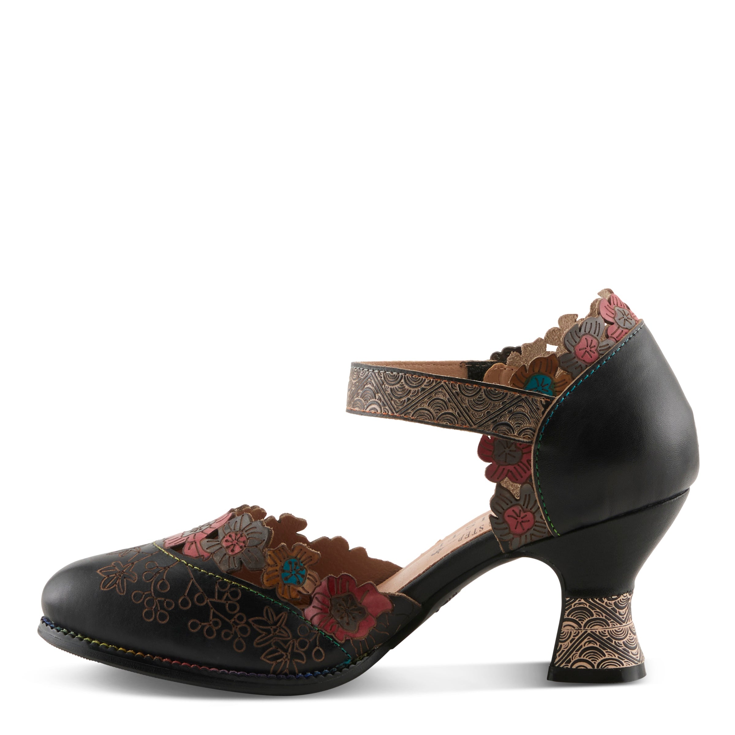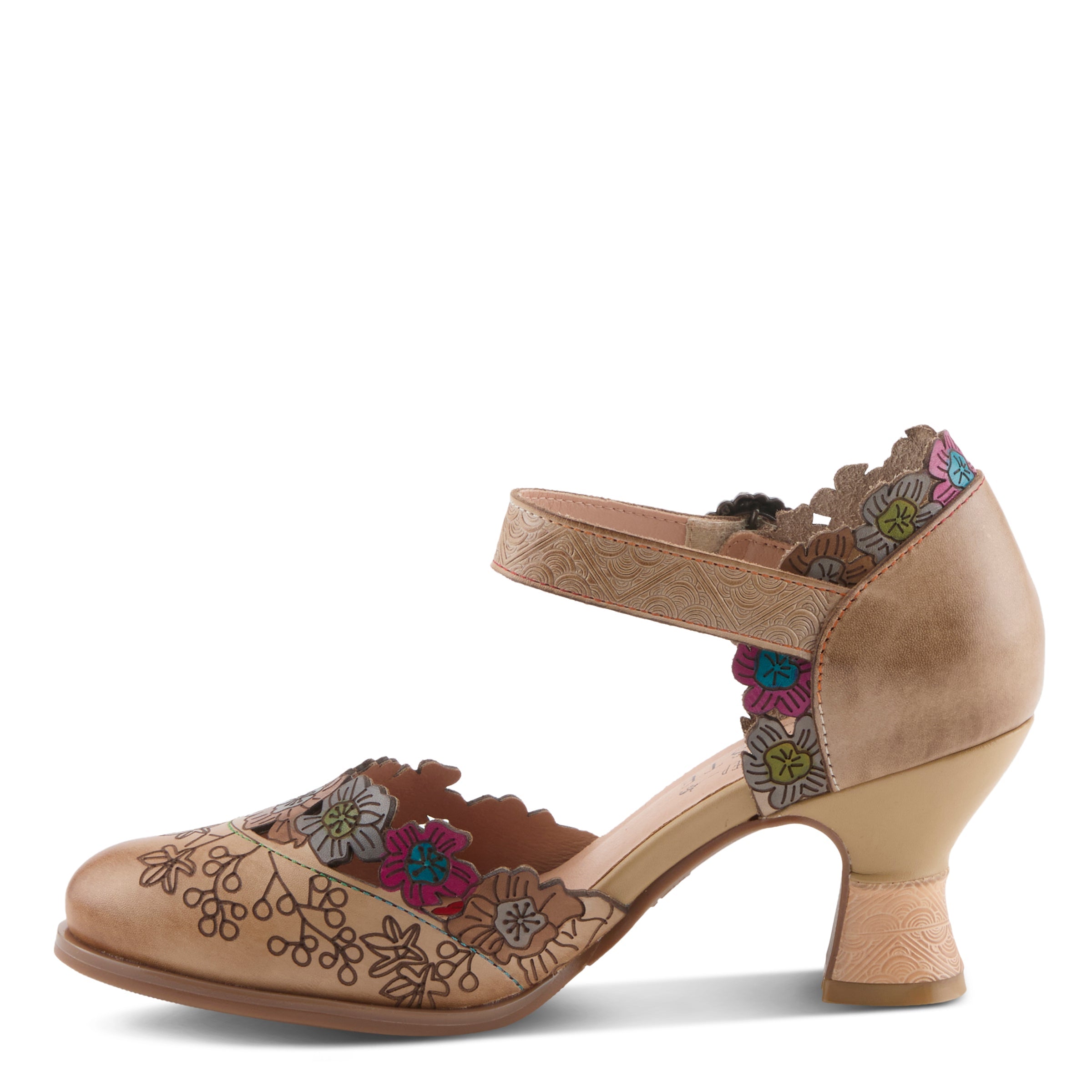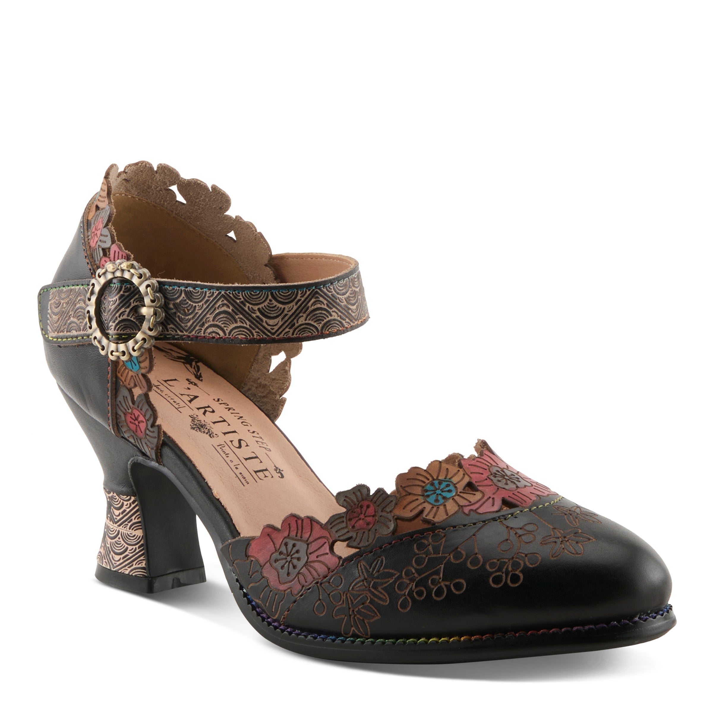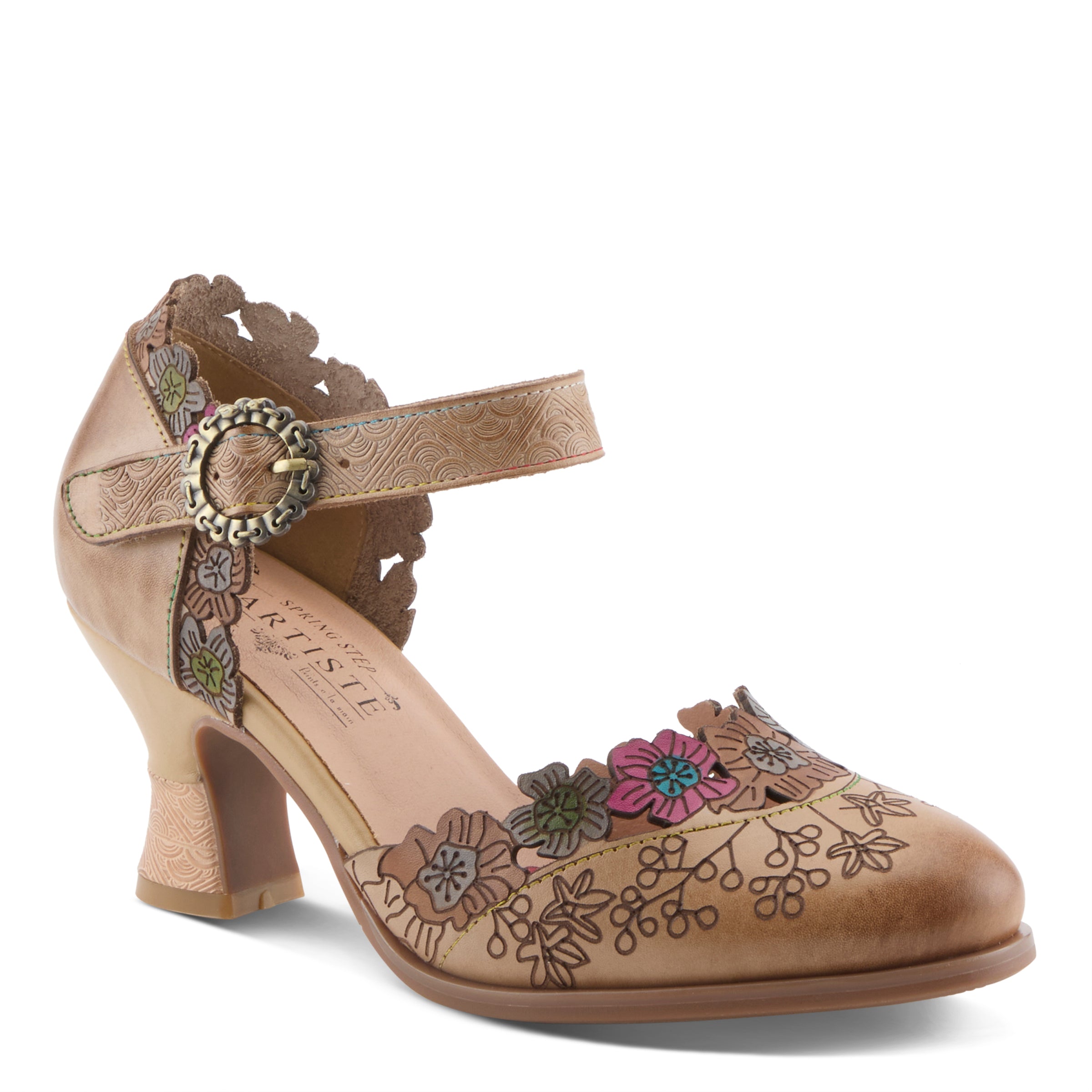 Romance comes alive in this hand-painted mary jane shoe, where every detail tells a story of artistry and charm. The laser-cut and embossed leather upper blooms with graceful floral patterns along the scalloped topline, creating an enchanting garden-inspired effect. The adjustable strap, accented by an antique buckle, offers ease and allure, while the padded insole provides comfort for every step of your day.