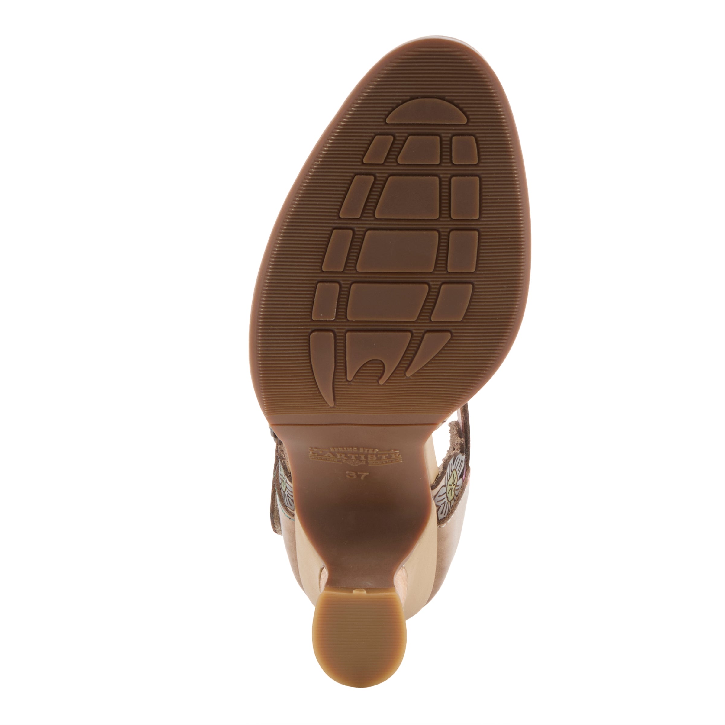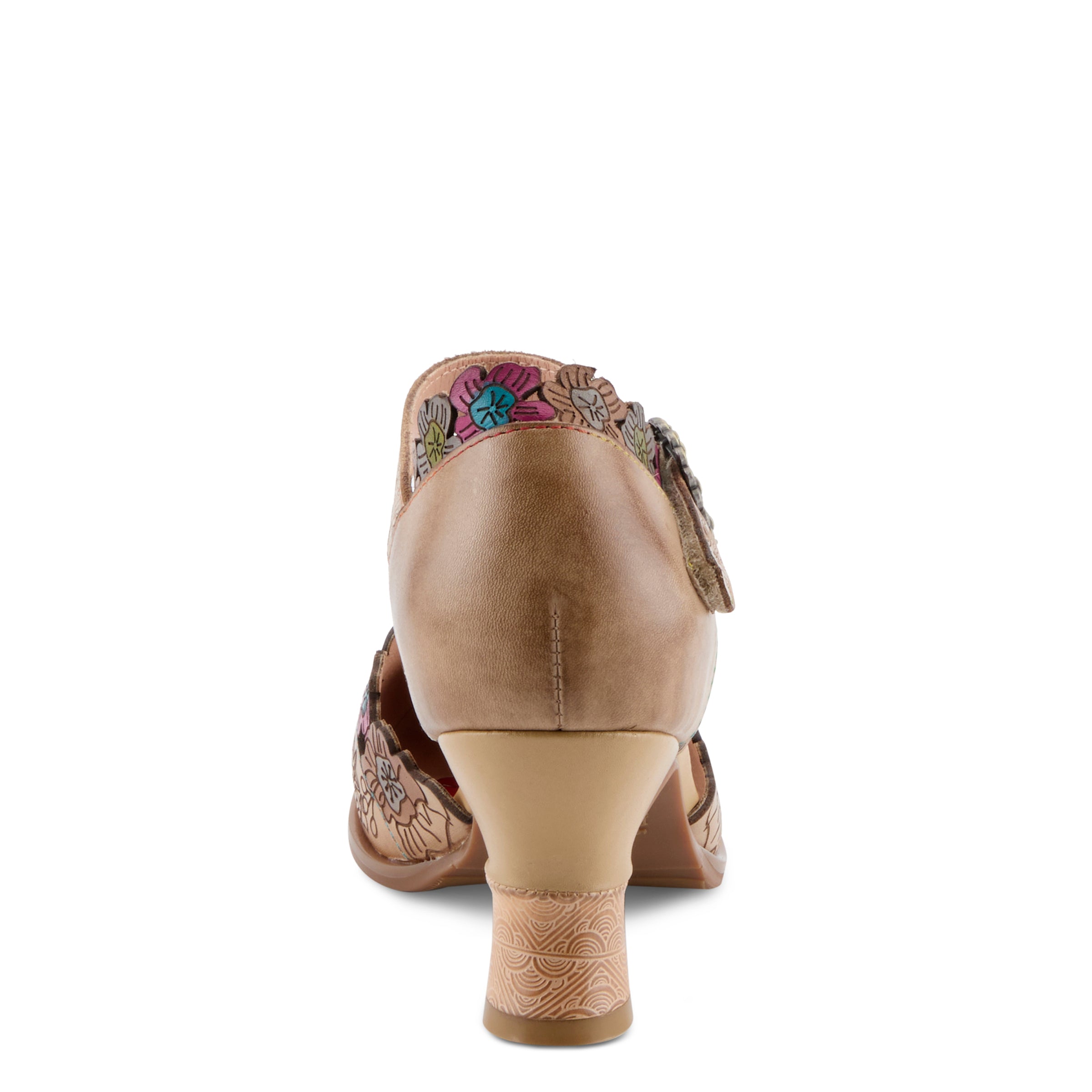 A sculpted heel, blending embossed and smooth leather, completes the look with whimsical elegance.