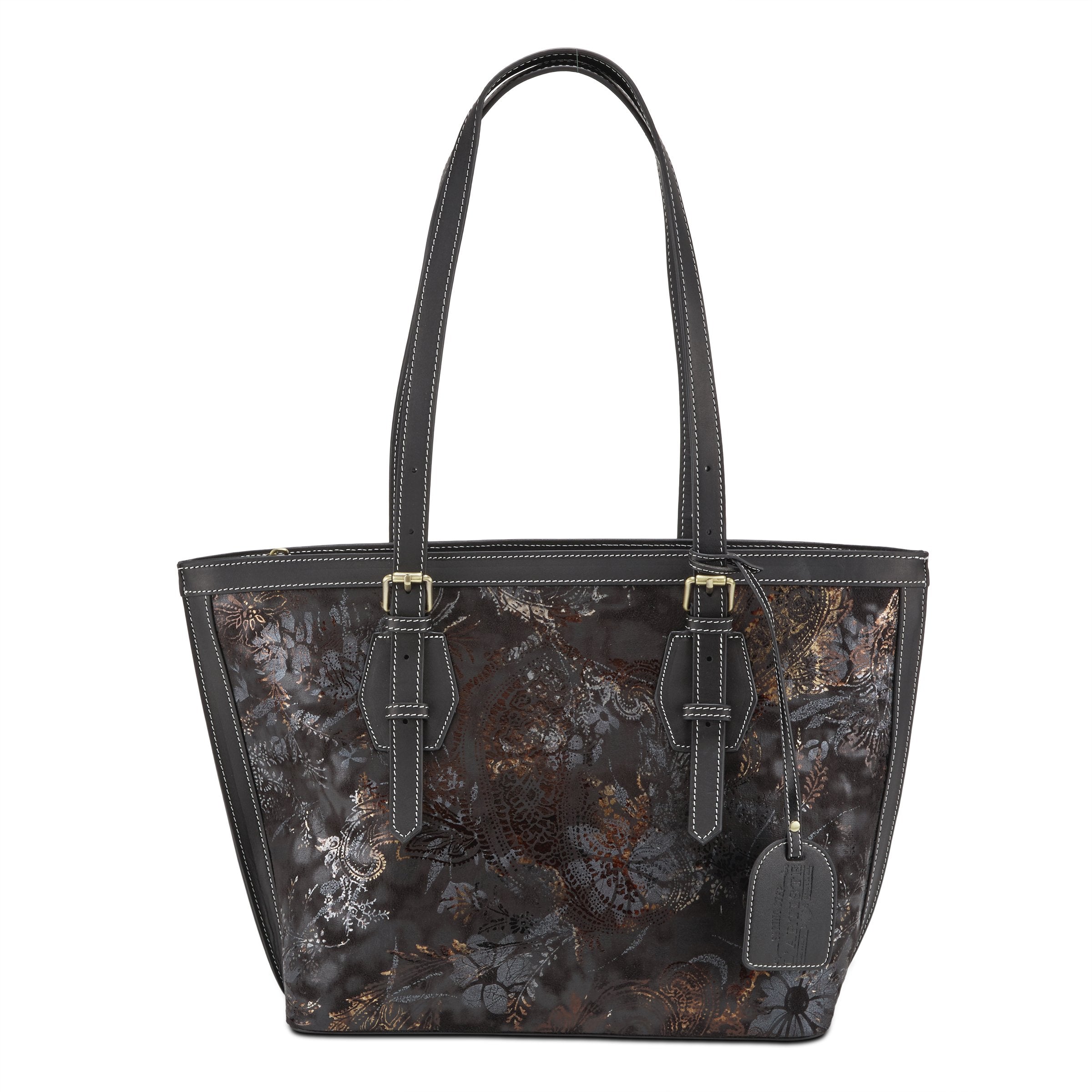 Classic tote styling with contrast stitched leather trim and multi colored metallic floral micro-suede print featuring 4-way adjustable straps for your perfect custom and personalized fit. A wide footed bottom allows for a full inside view in this single compartment every day tote, that is sure to become your favorite go-to bag as it blends and matches everything in your closet. Inside opposite walled zipper and open pouch pockets. Protective cotton bag included. Imported.