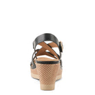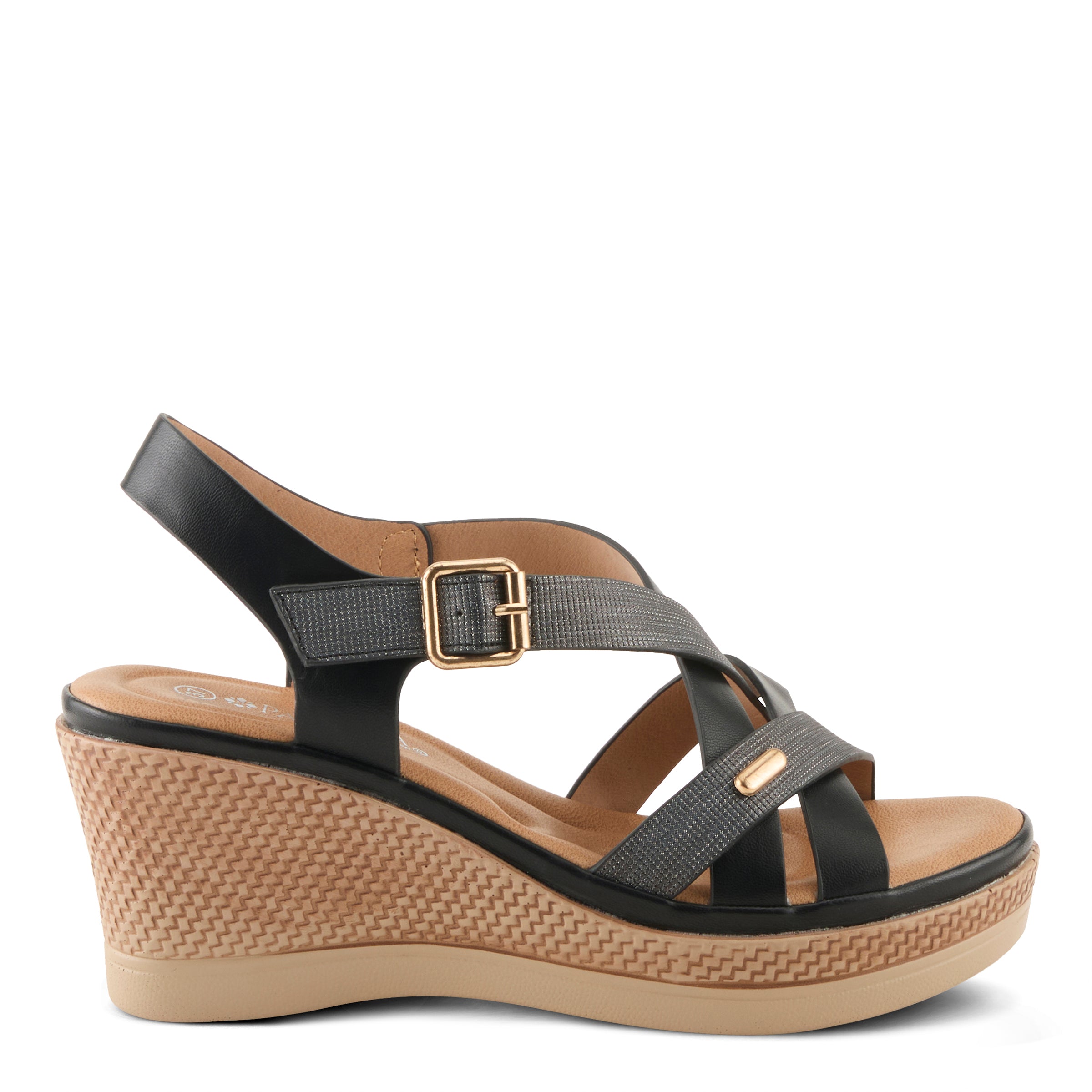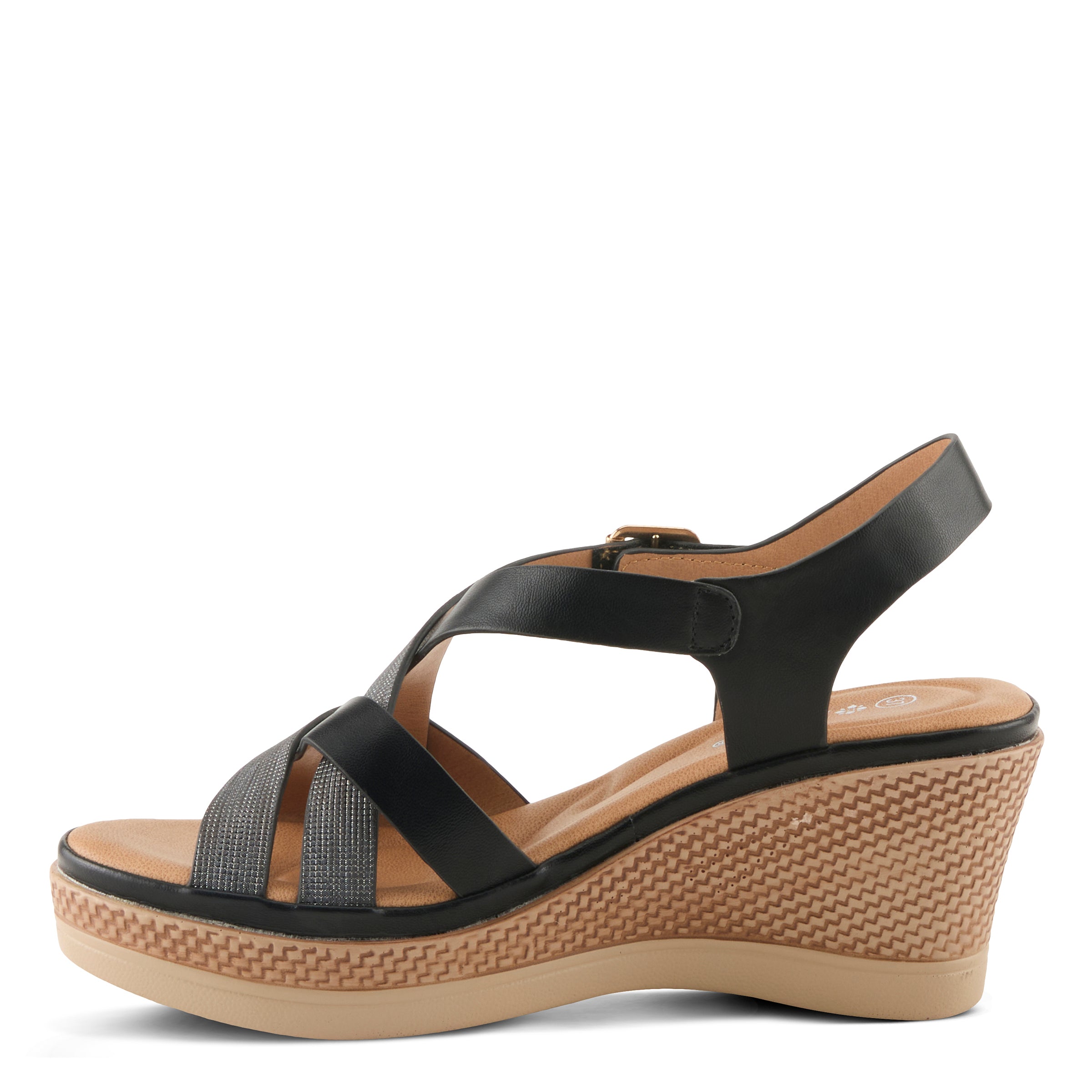 - Faux woven design wraps elegantly around the wedge