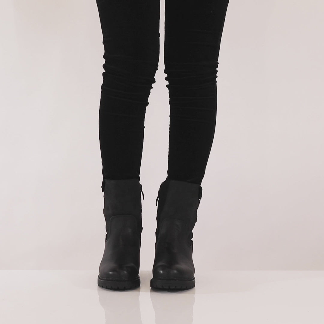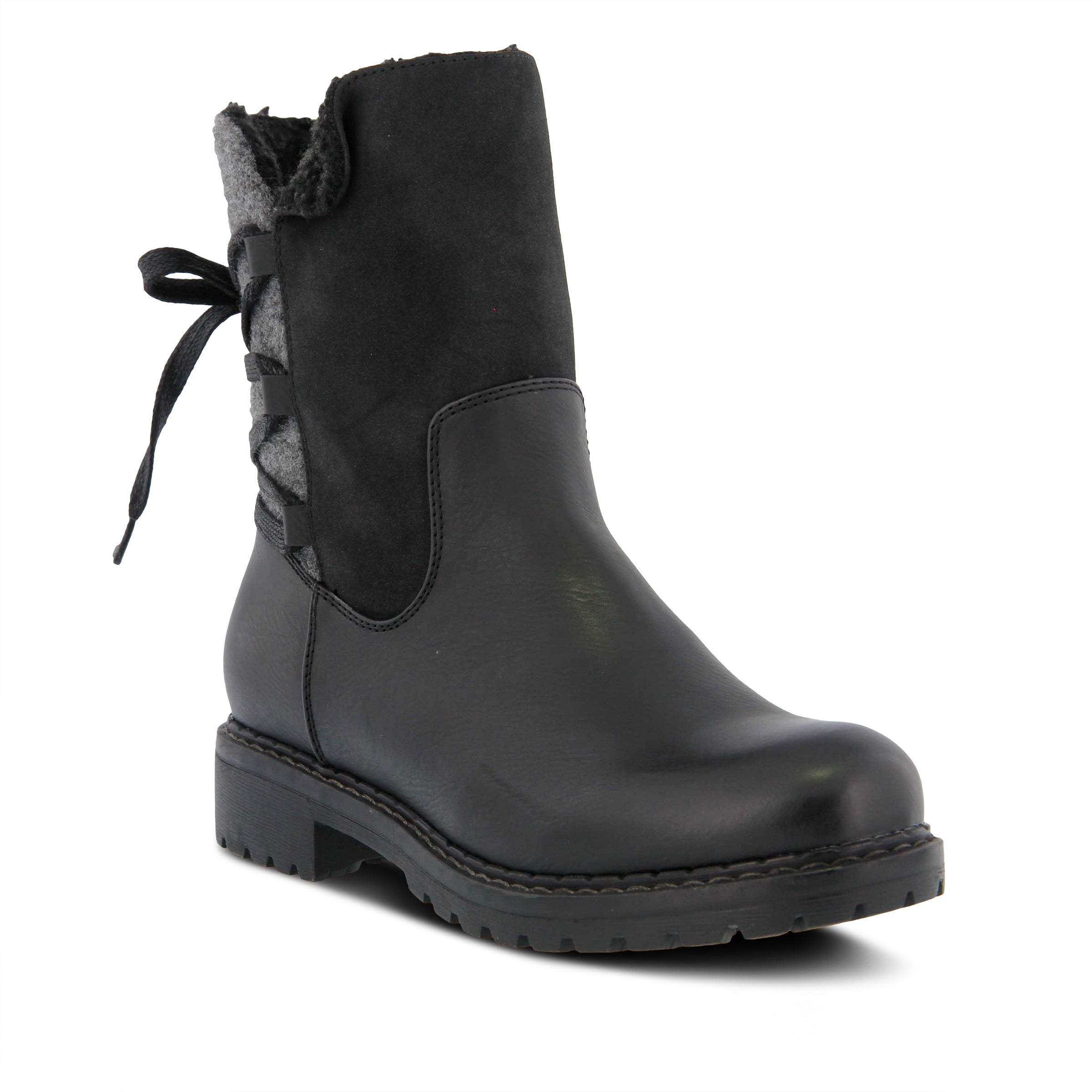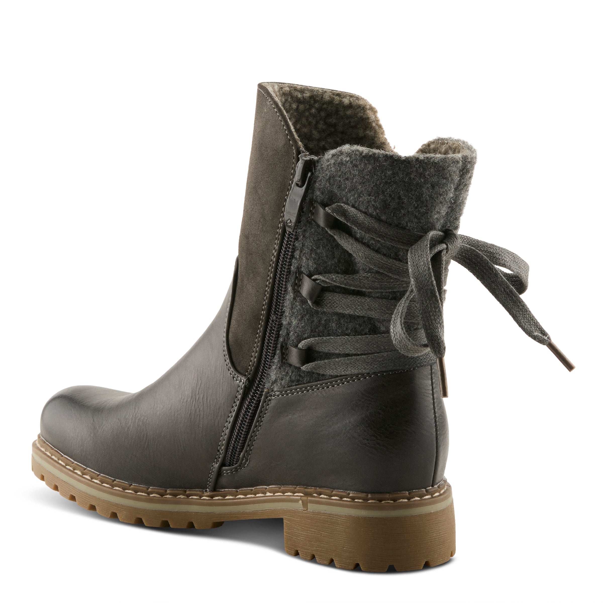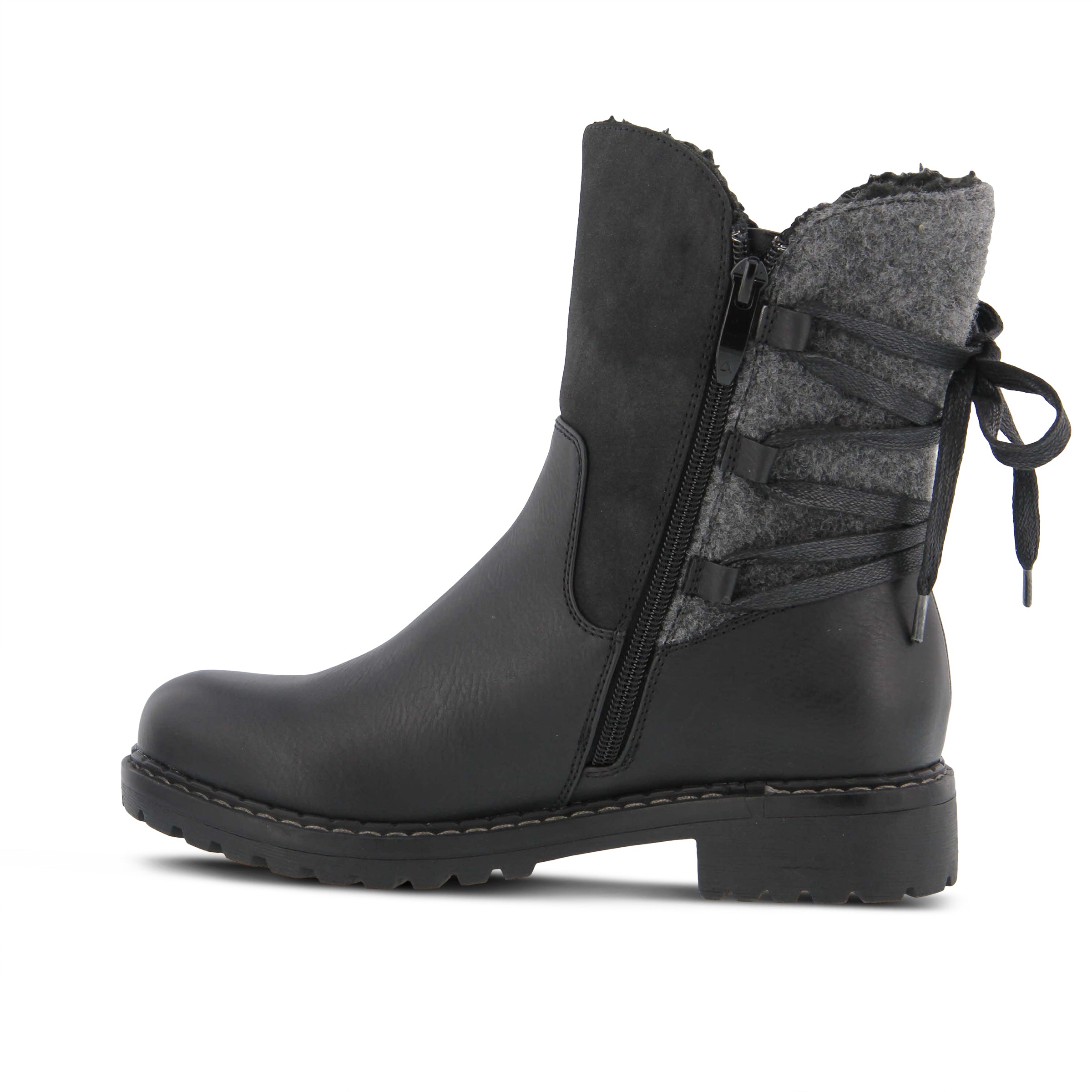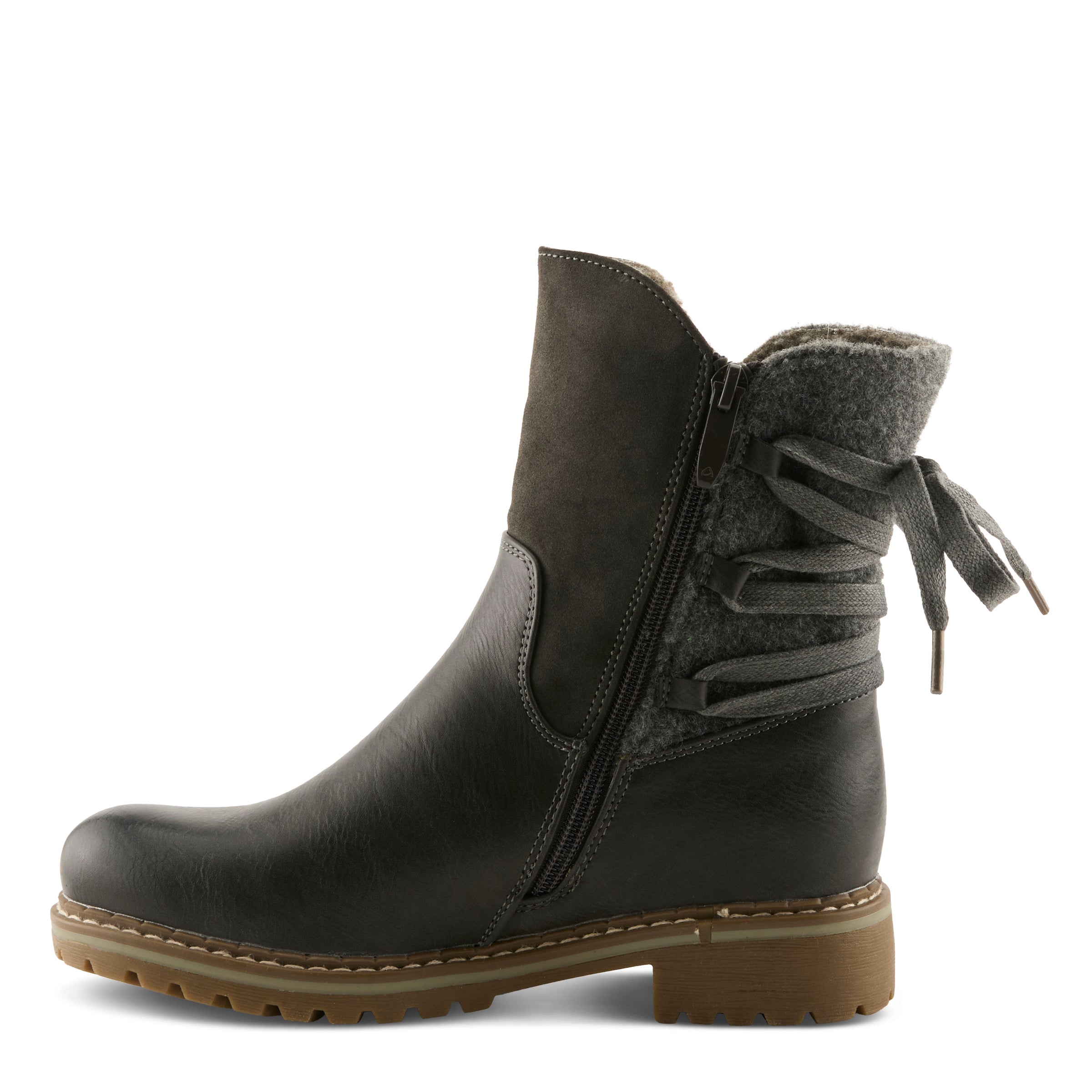 Stylish pull-on bootie featuring a soft faux wool back shaft detailed with an adjustable lace and an easy on/off inside zipper all on a chunky and sculpted heel.