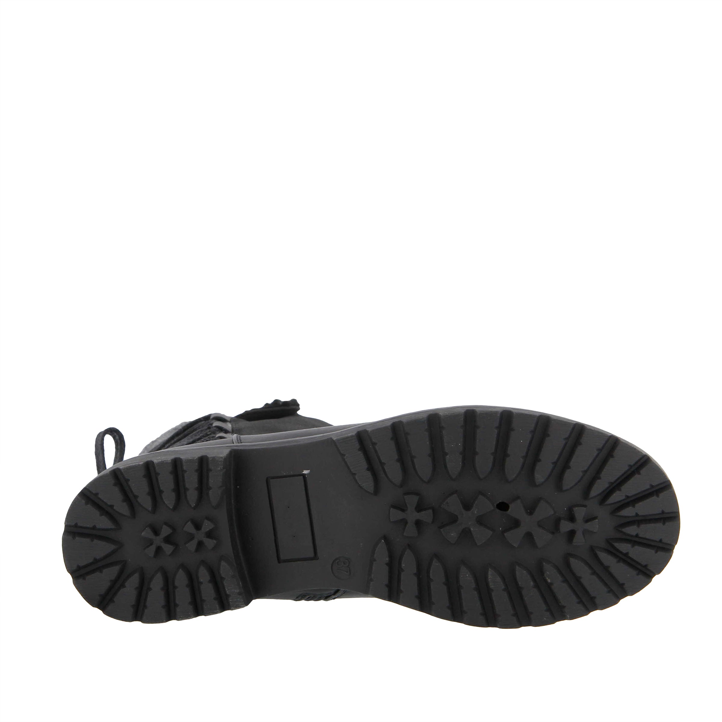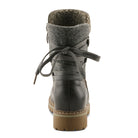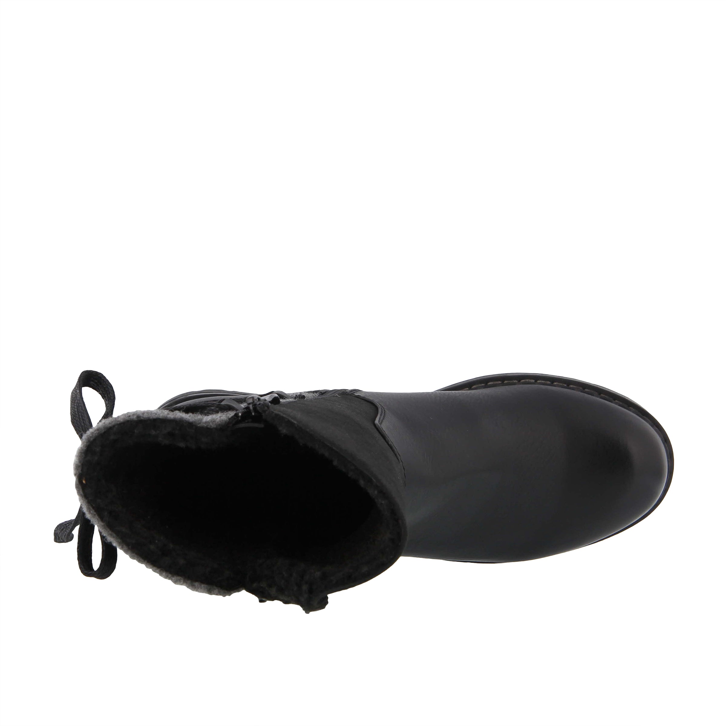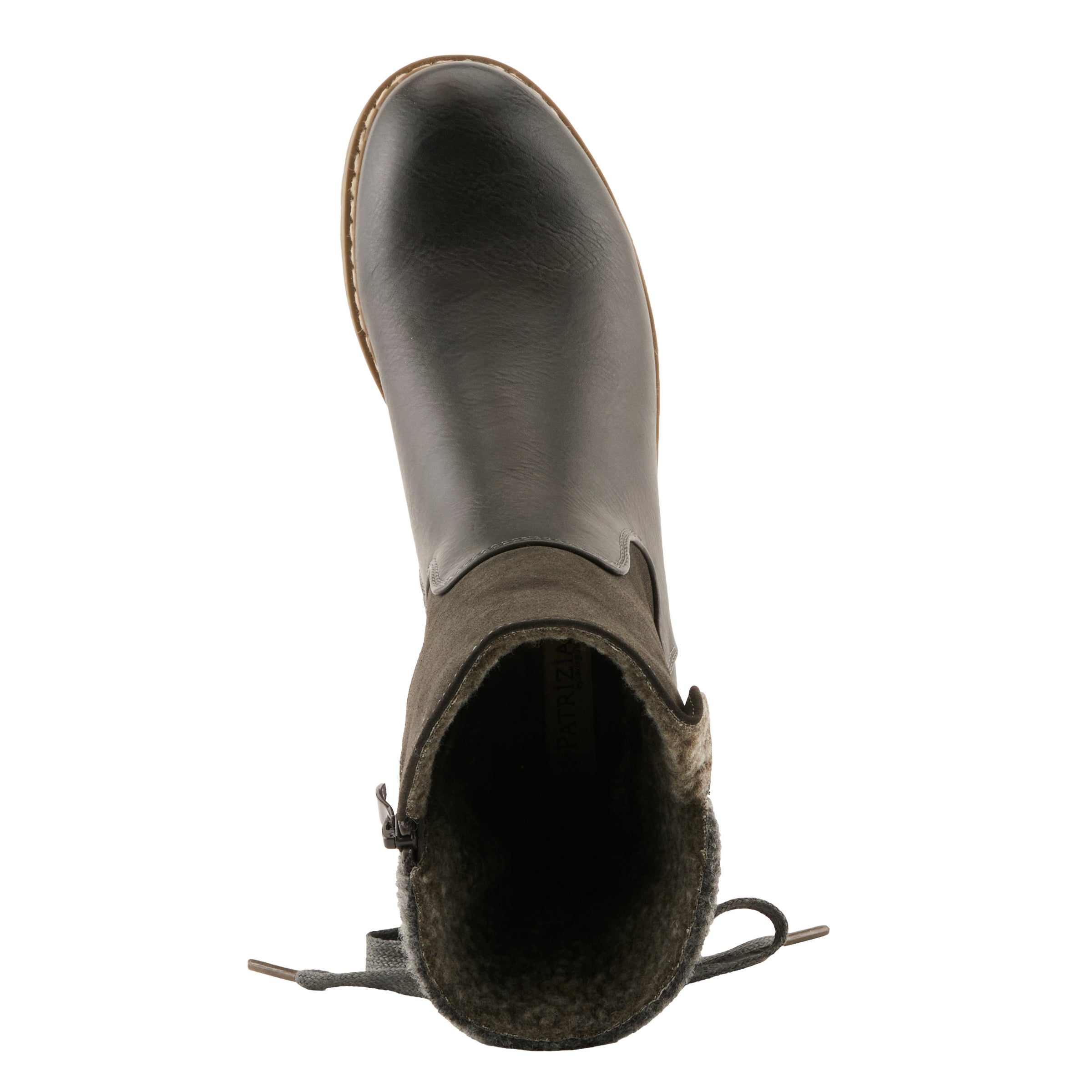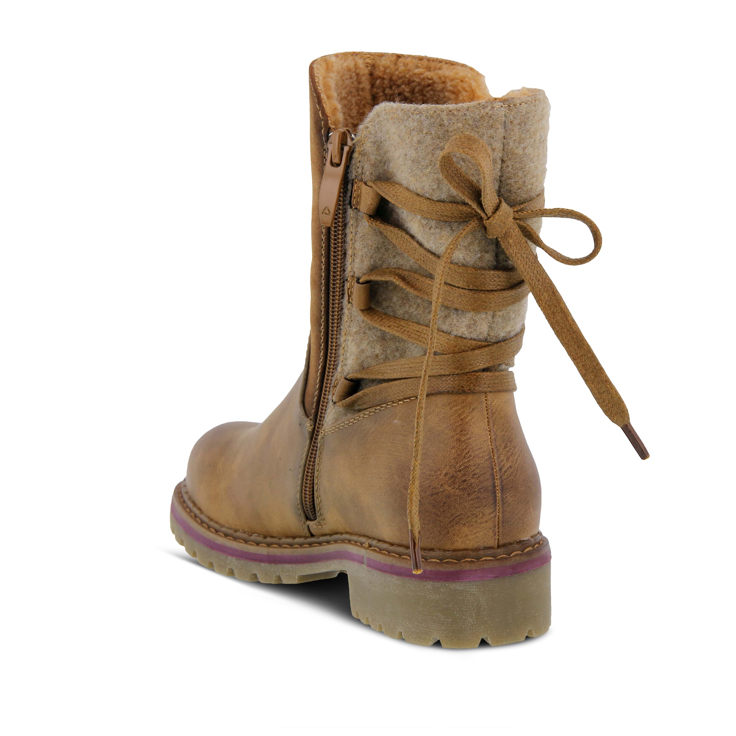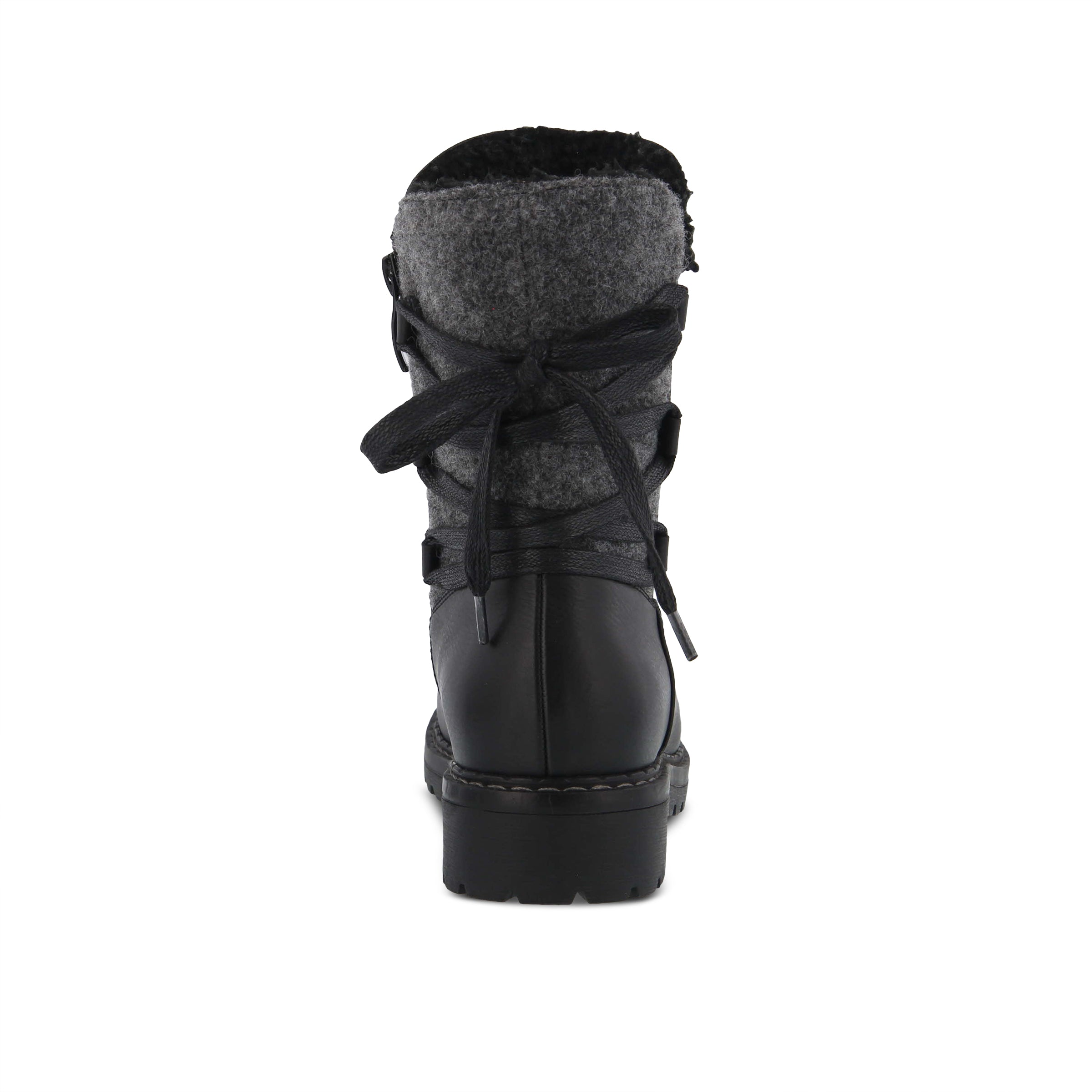 Stylish pull-on bootie featuring a soft faux wool back shaft detailed with an adjustable lace and an easy on/off inside zipper all on a chunky and sculpted heel.