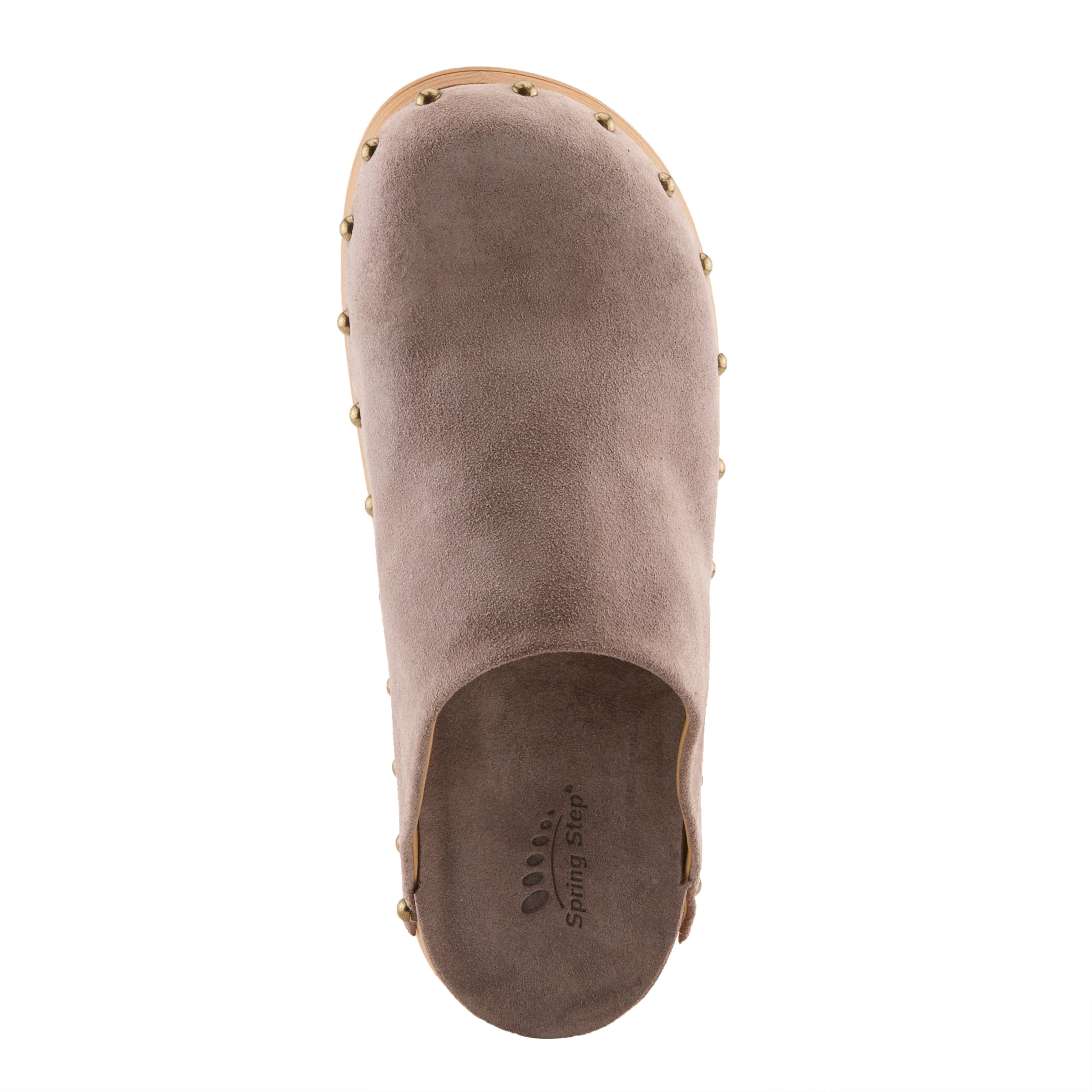 Inspired by traditional European footwear, this Spring Step suede closed-toe clog embodies timeless style and enduring comfort. Handcrafted in Turkey with genuine suede and a smooth leather lining, it captures the essence of artisanal shoemaking while offering modern wearability. The sleek closed-toe design provides year-round versatility, while antique-finish studs outline the woodgrain-effect sole, lending heritage character to the silhouette. A suede-covered insole cushions every step, and the comfortable 1½" heel delivers subtle lift without sacrificing stability.