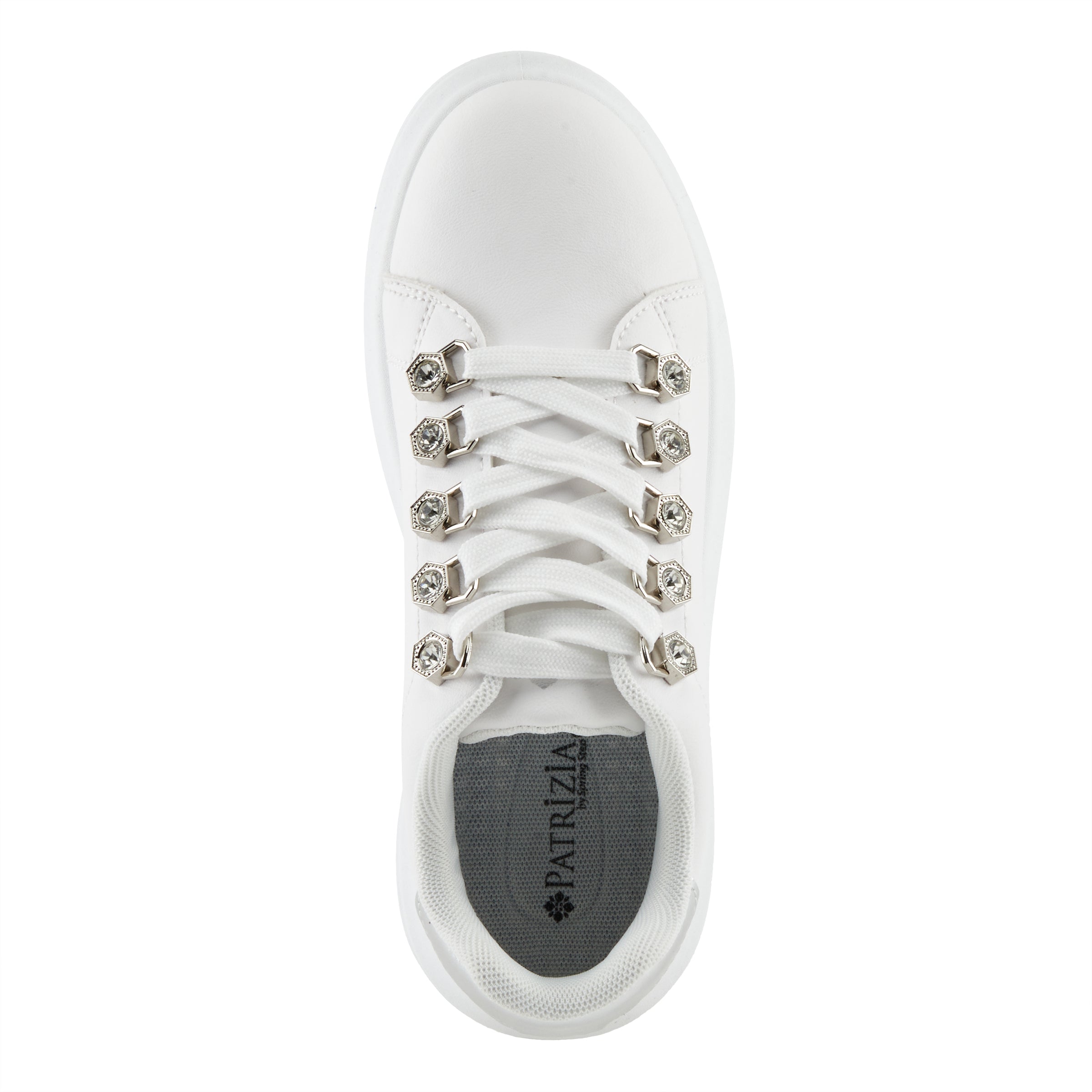 - D-ring metallic eyelets with crystals create a dazzling focal point, and the metallic counter adds a sleek and modern element to the design.