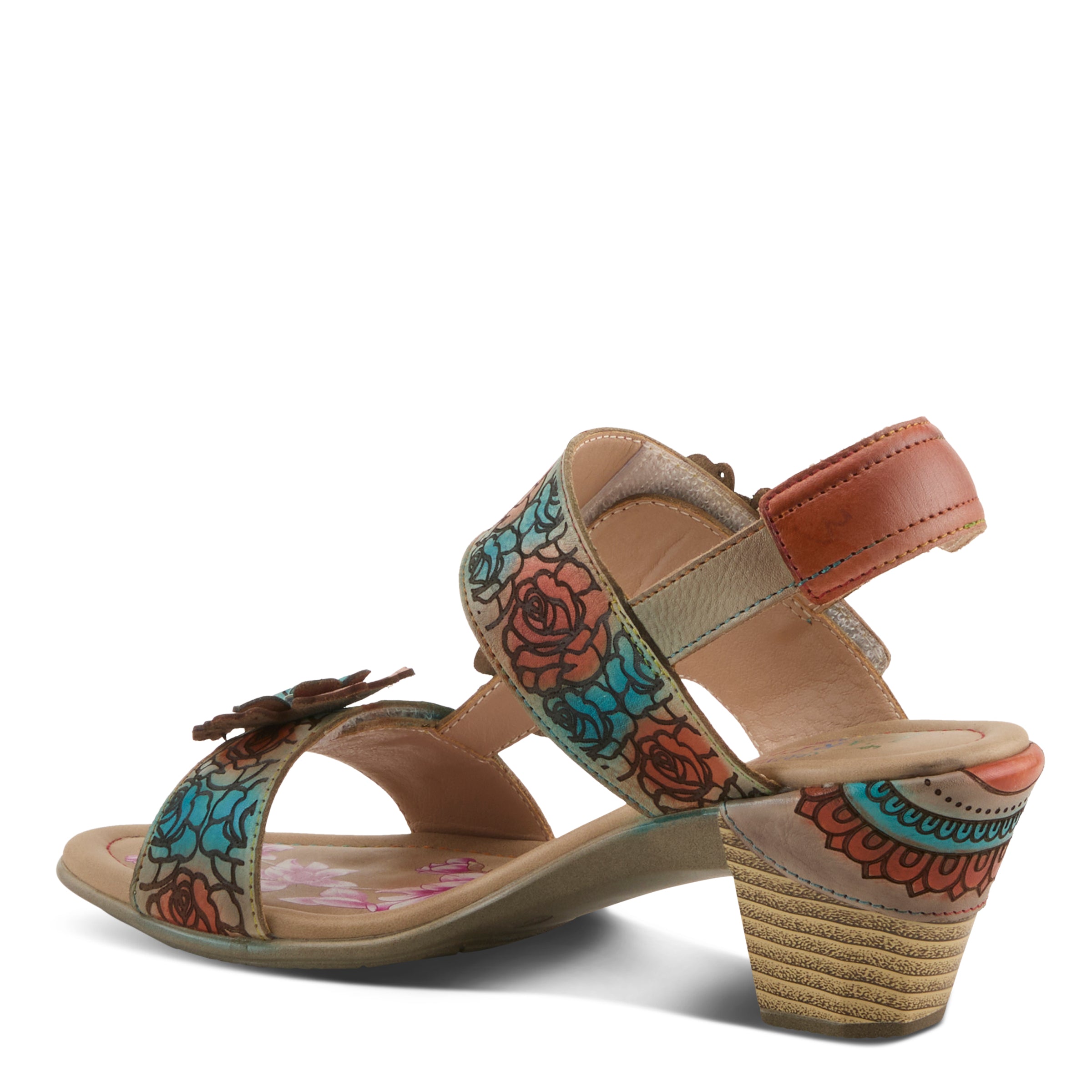- Leather upper with etched and hand-painted floral designs
