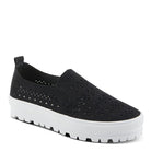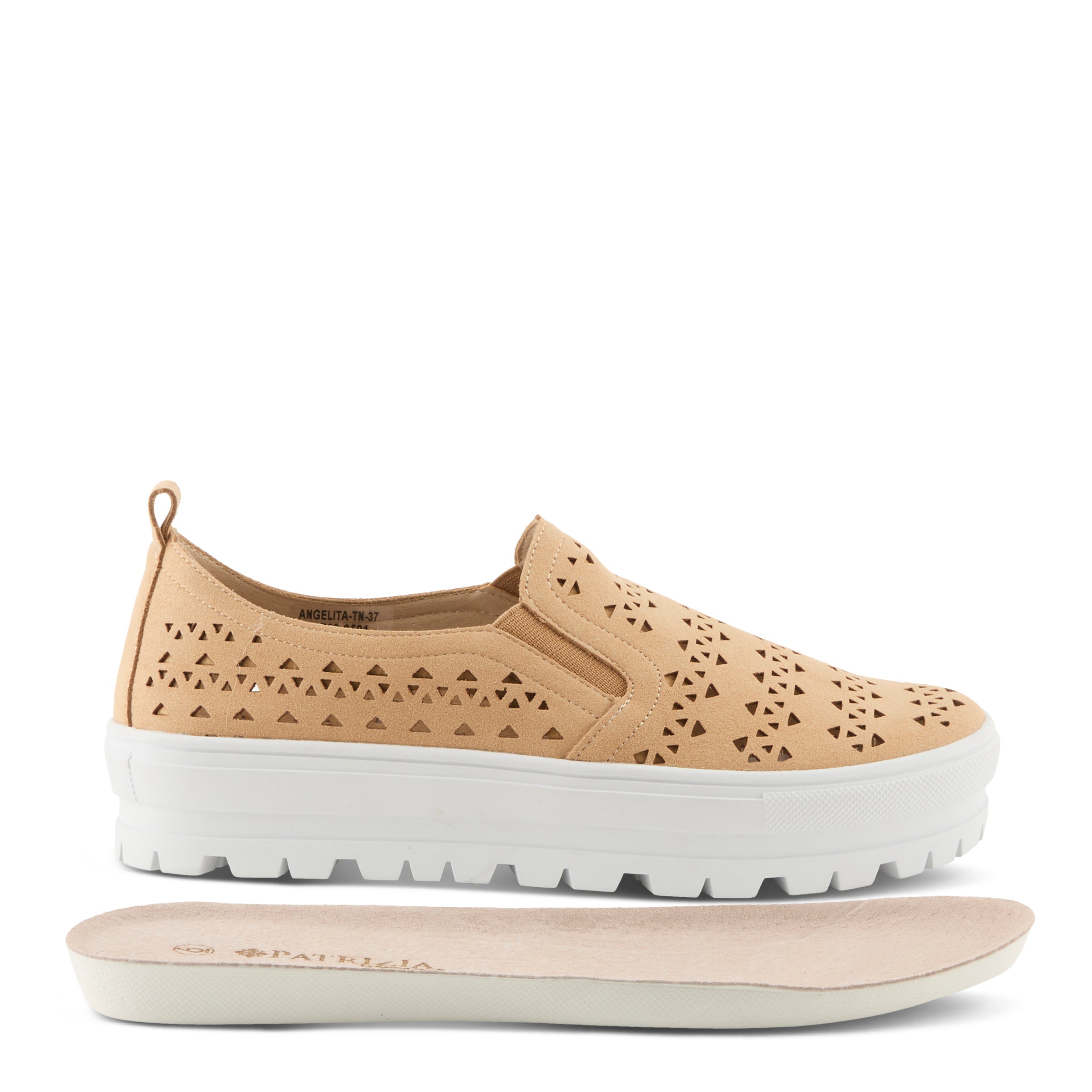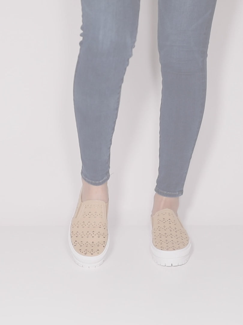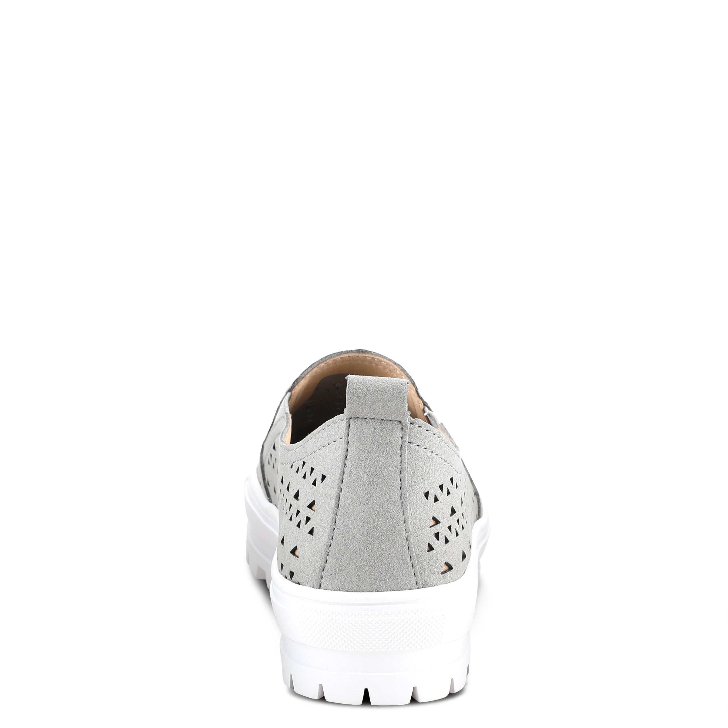 Geometrical cut out design microsuede athleisure shoe featuring double side elastic and a pull up tab for easy on and off on a flexible platform sole.