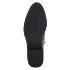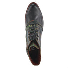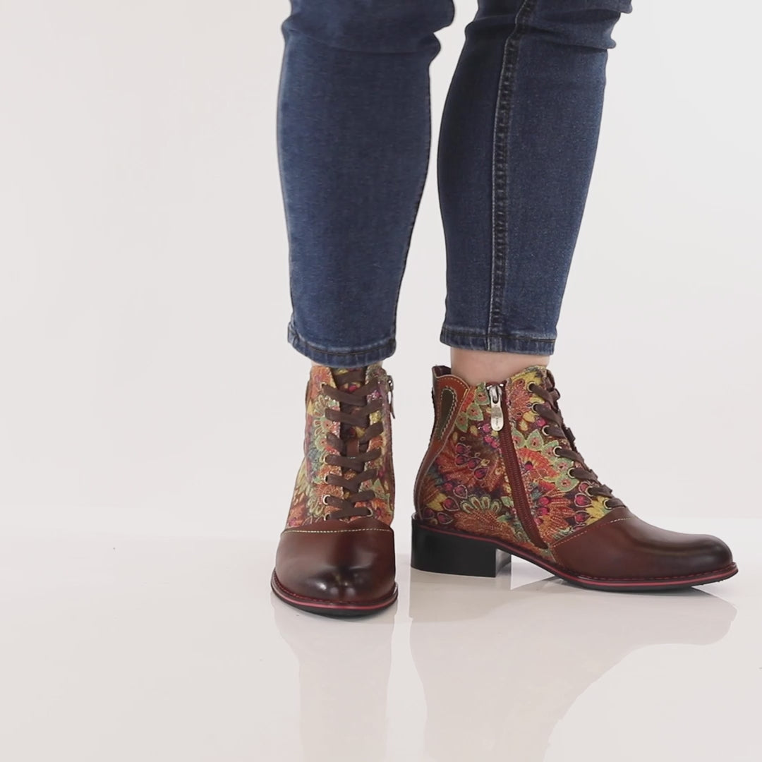 This lace-up and zipper boot combines both style and functionality with its unique design. The back of the shoe features an intricate laser-cut applique design, while the front is brushed and burnished, adding a touch of spice. The iridescent upper and rainbow stitching add a pop of color, making this boot a statement piece that can be dressed up or down.