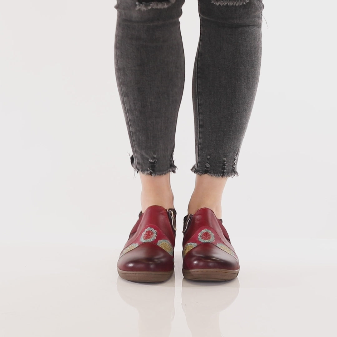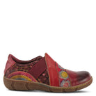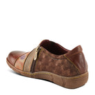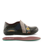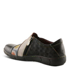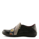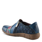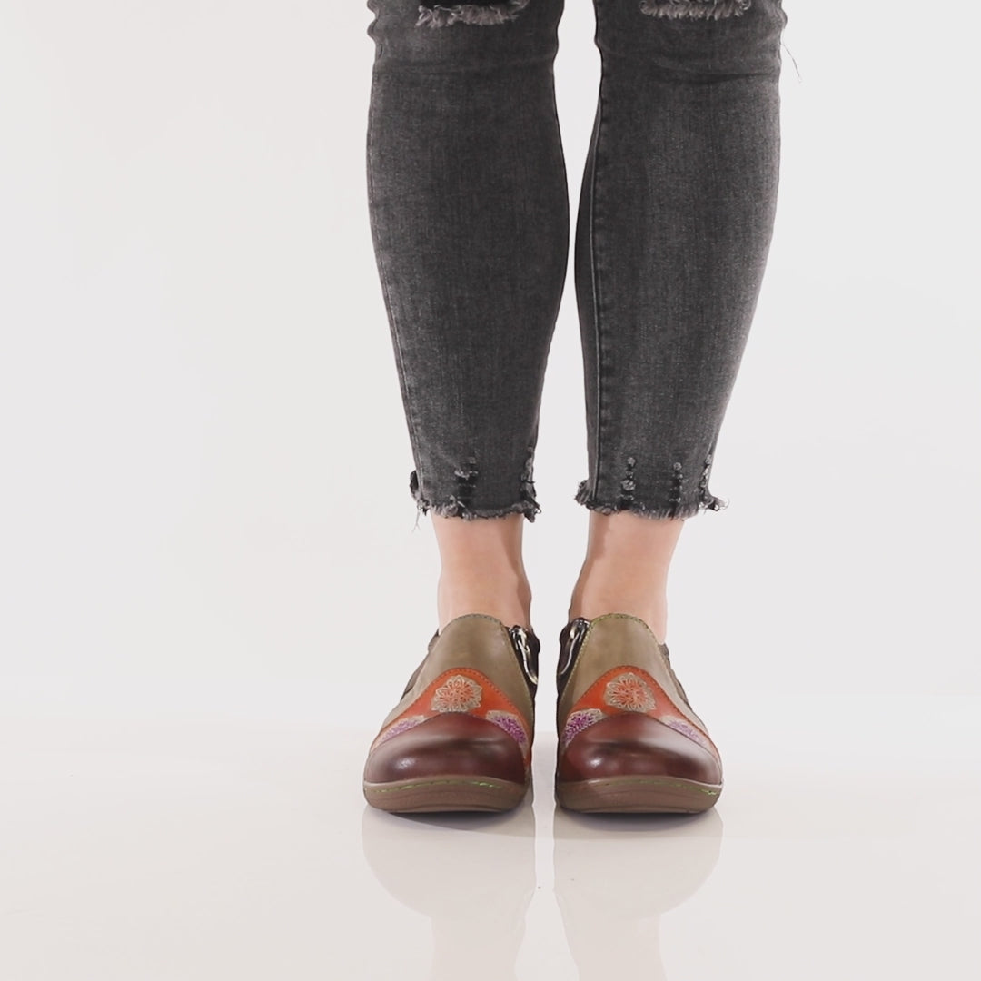 This closed back burnished clog with rainbow stitching and a geometric graphic multi-colored hand-painted pattern design is a unique and eye-catching footwear option. The gore and zipper closure make it easy to slip on and off, while providing the ultimate stretch for a comfortable fit. This clog is truly one of a kind, with its stunning combination of colors and patterns that are sure to elevate any outfit.