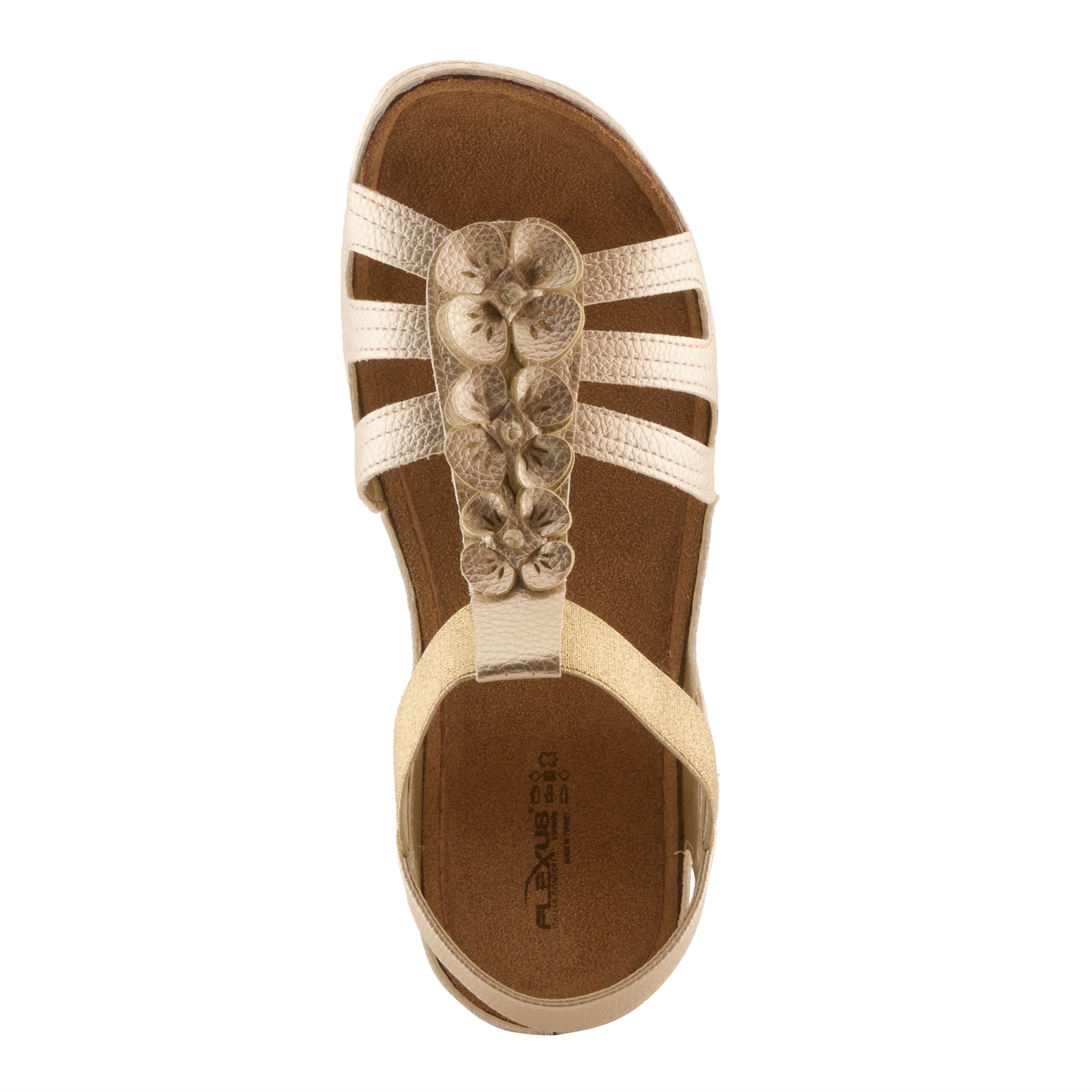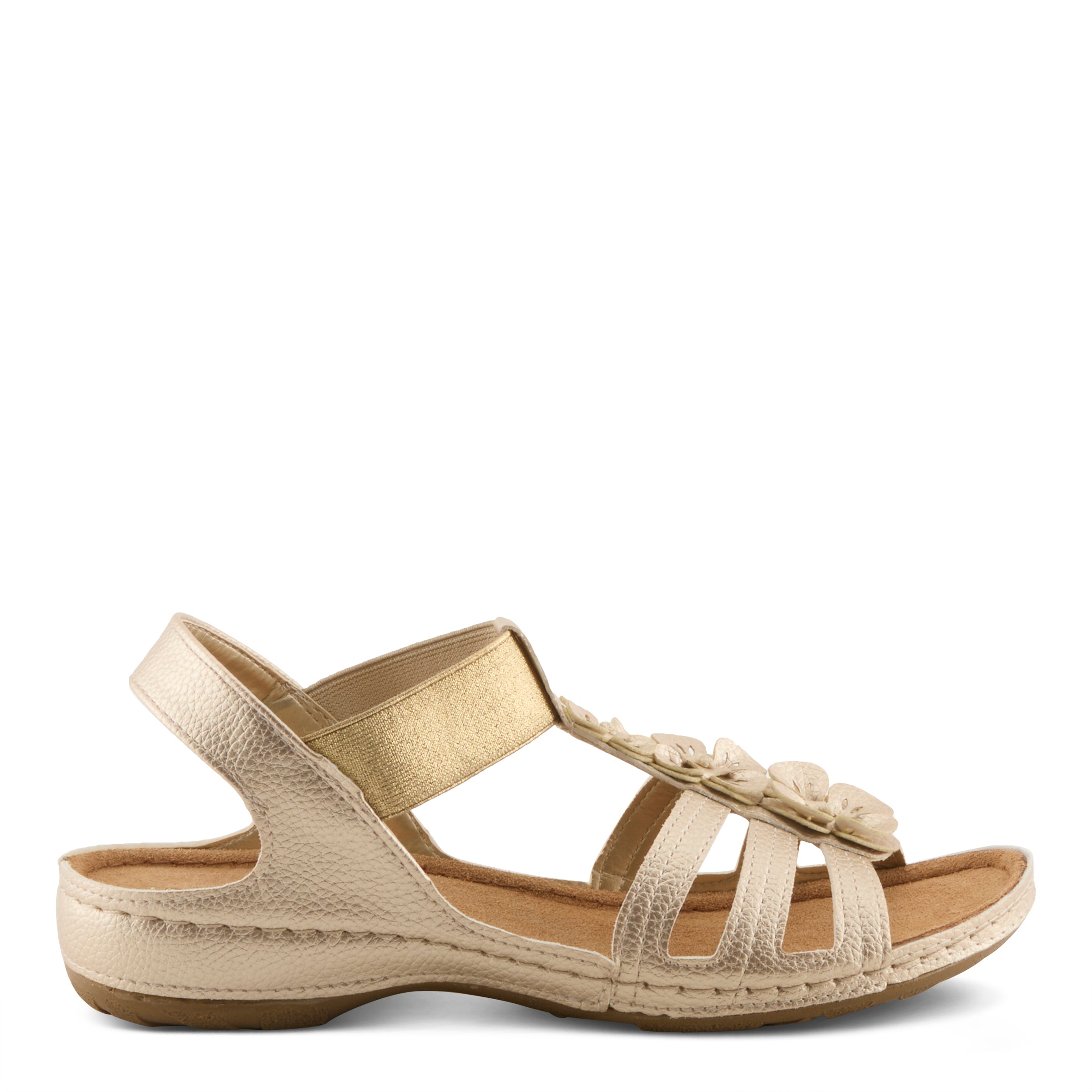 Flex in florals with this leather European inspired t-strap sandal. The elastic strap, leather padded insole and anti-shock flexible outsole give maximum stretch and cushy comfort to protect your feet. The array of laser cut outs and floral appliques adds the playful femininity.