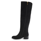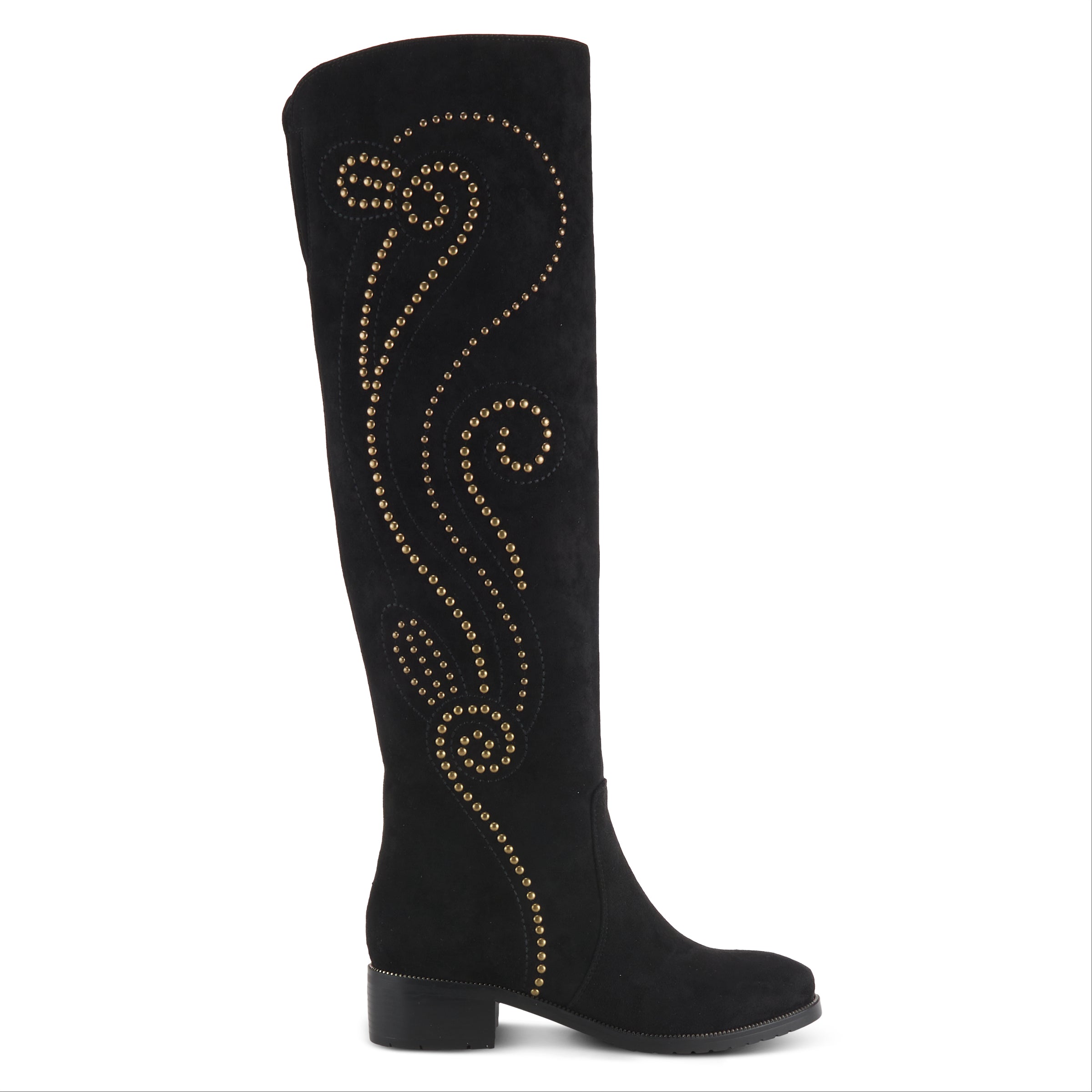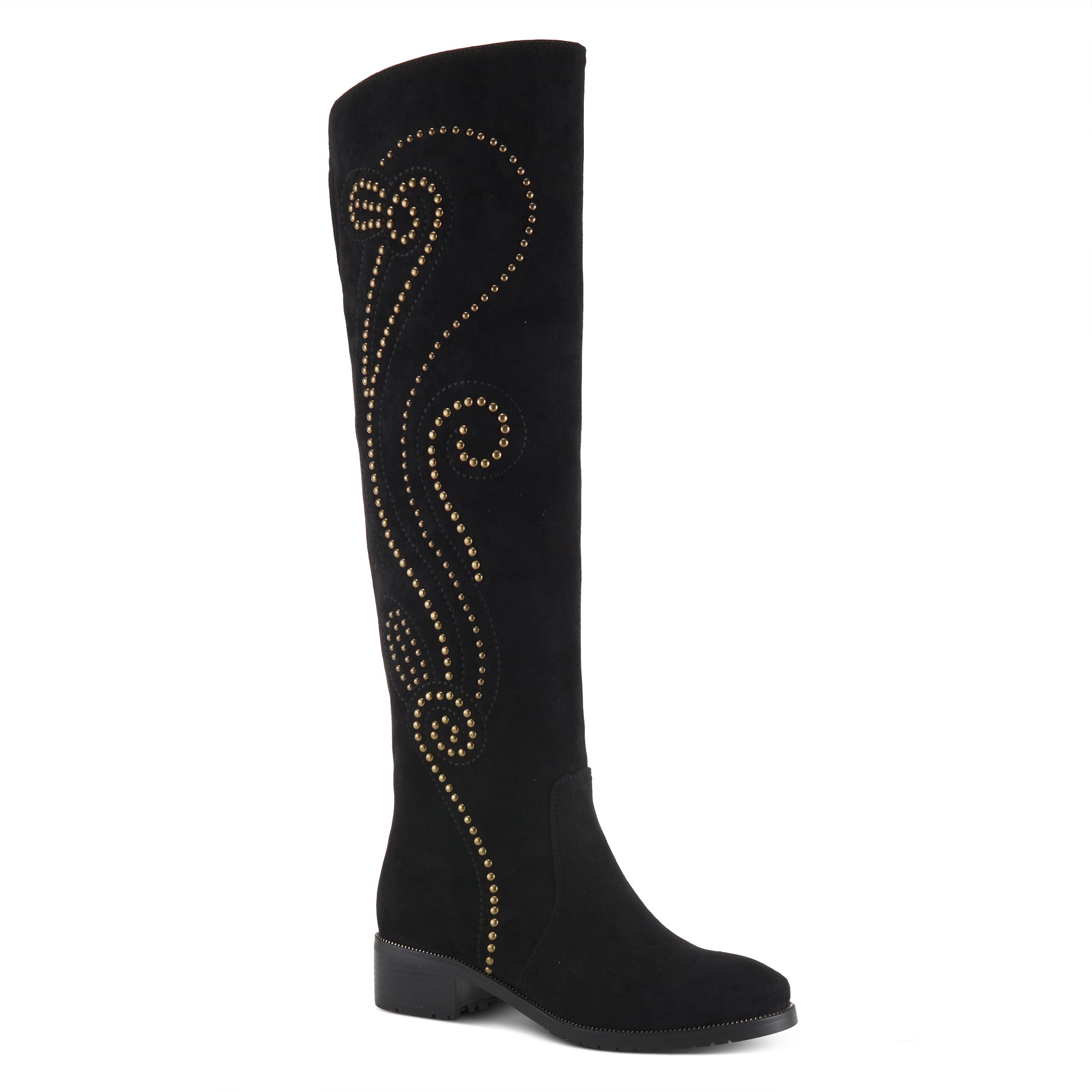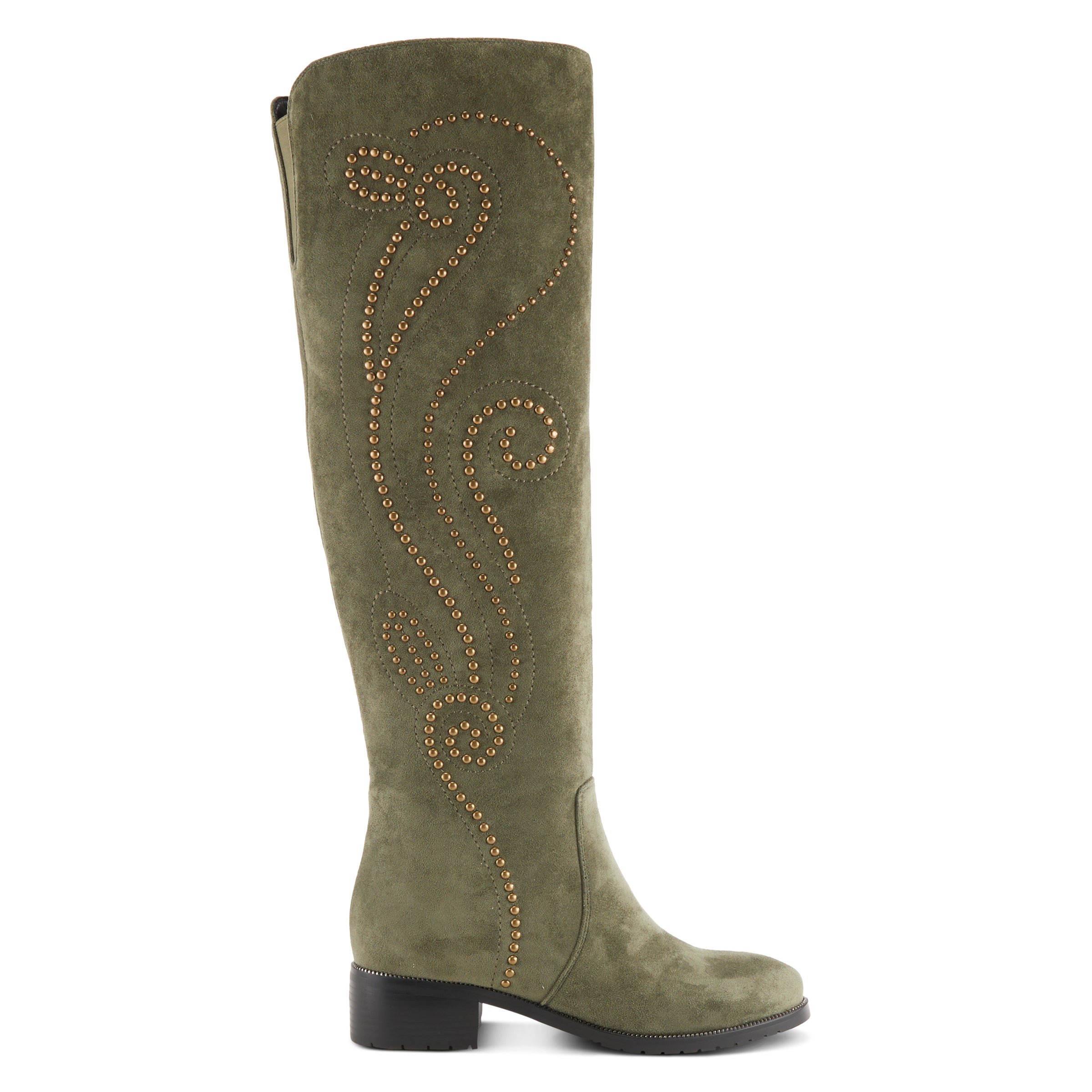 The plushest richest man-made suede in the marketplace making in nearly impossible to know style Windsor’s roots are vegan inspired! Wear up to the knee for a more tailored look or smoosh her down for a more casual vibe. Any way you wear her, the outside gentle swirls of antique brass studs alongside the tonal stitching give this all-day beauty a look that will last for seasons to come. The perfect classic boot with just the right amount of twist has a full inside zipper for easy on/off and a back deep V stretch gore for added comfort! Plush thick velvet linings, super padded velvety footbeds and the coolest silver studded welt on a chunky low all-day heel.