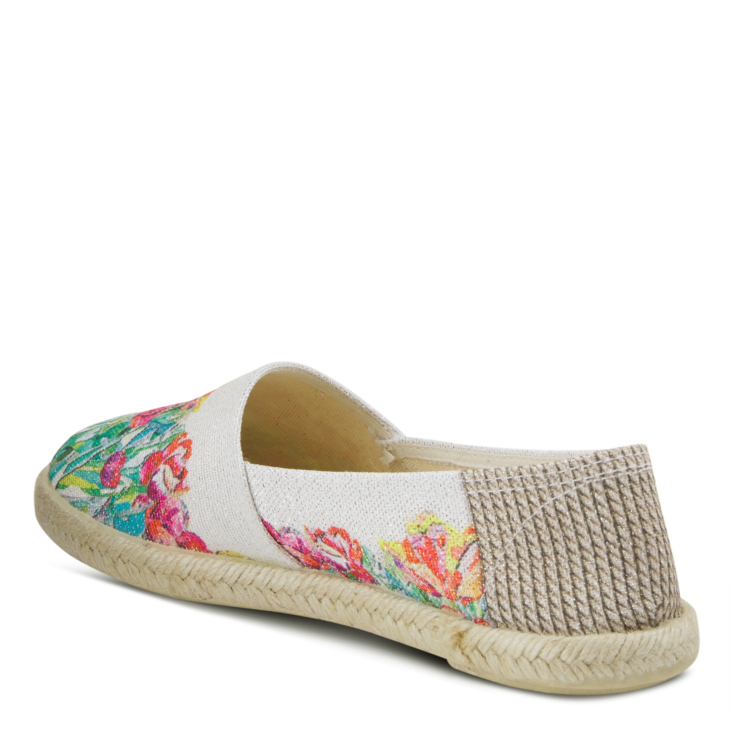 Our Azura by Spring Step WILDGARDEN€š slip-on espadrille€š is€š a naturalist influenced, cheerful and colorful floral printed textile with metallic threads.