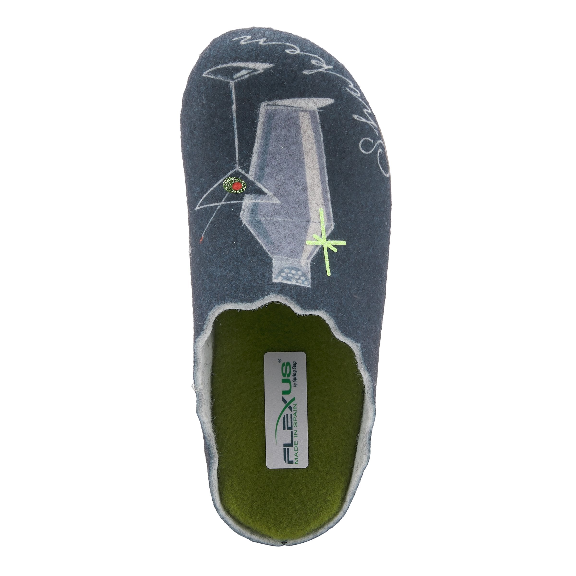 Enjoy a cocktail in this indoor/outdoor slipper featuring shaken or stirred martini artwork on a comfort sole.