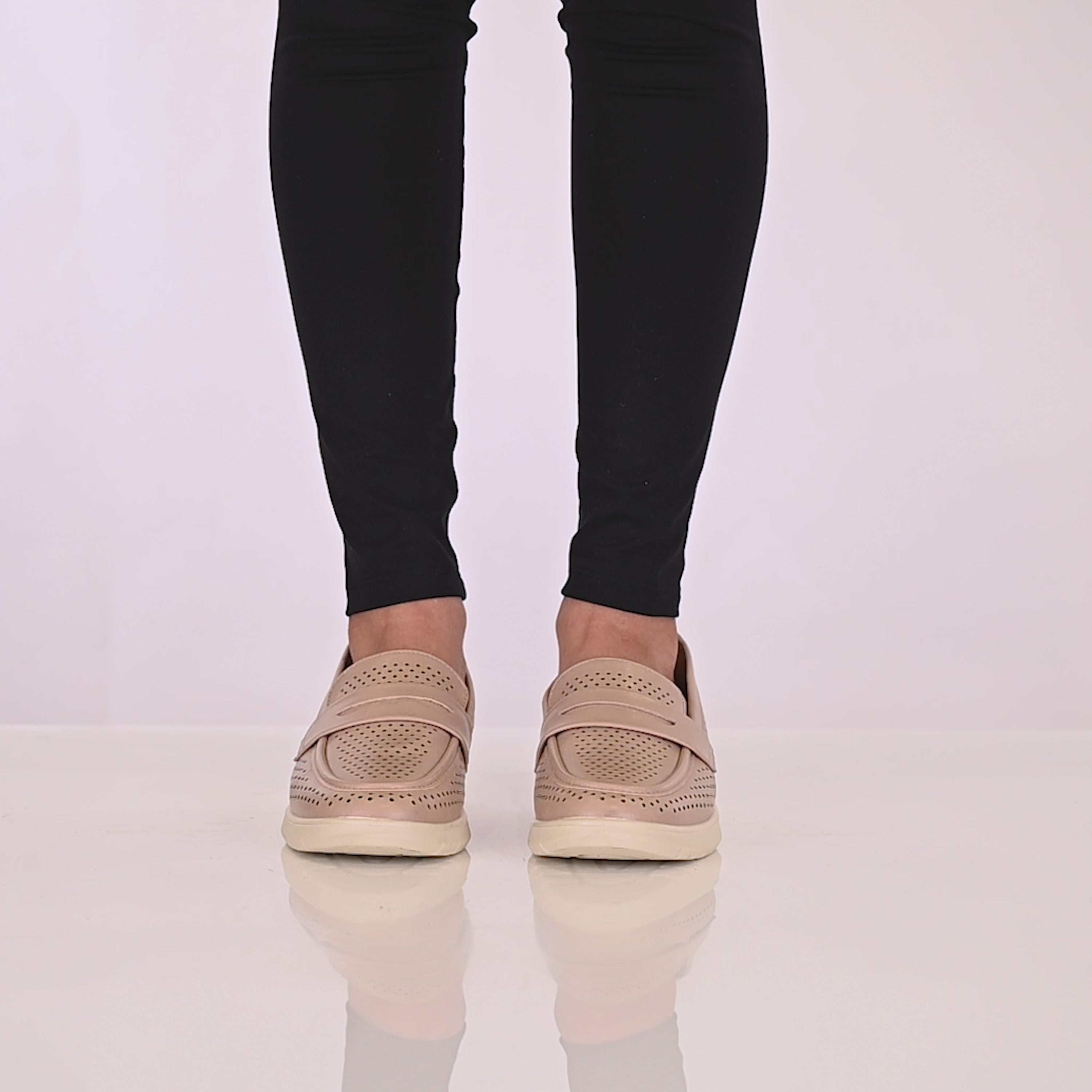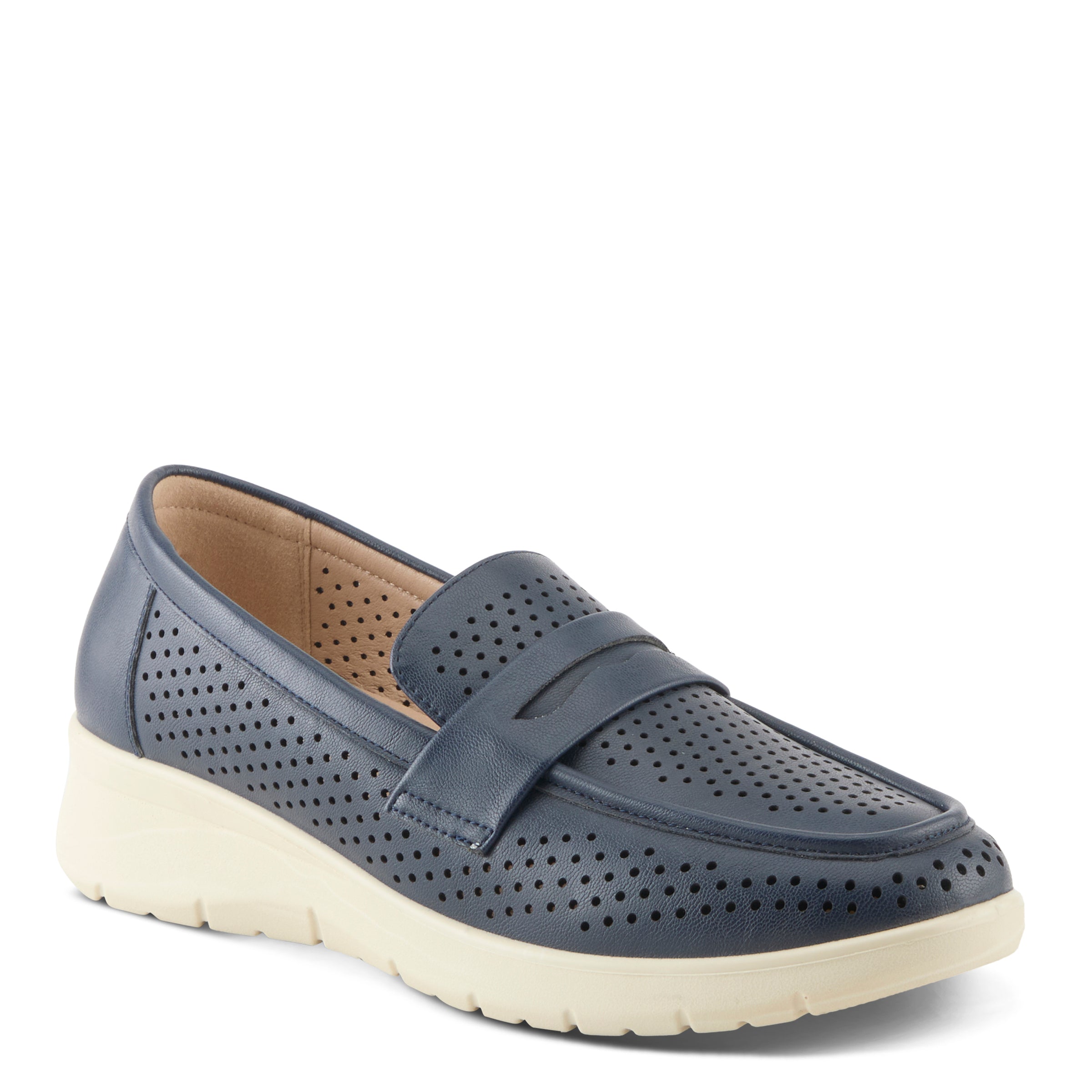 Step into sophisticated comfort with this stylish penny loafer, fully perforated for a breathable, modern look. Set on a sleek wedge outsole, it combines timeless elegance with a touch of contemporary flair. Perfect for those seeking both style and comfort, this loafer effortlessly elevates any outfit while ensuring all-day ease with every step.