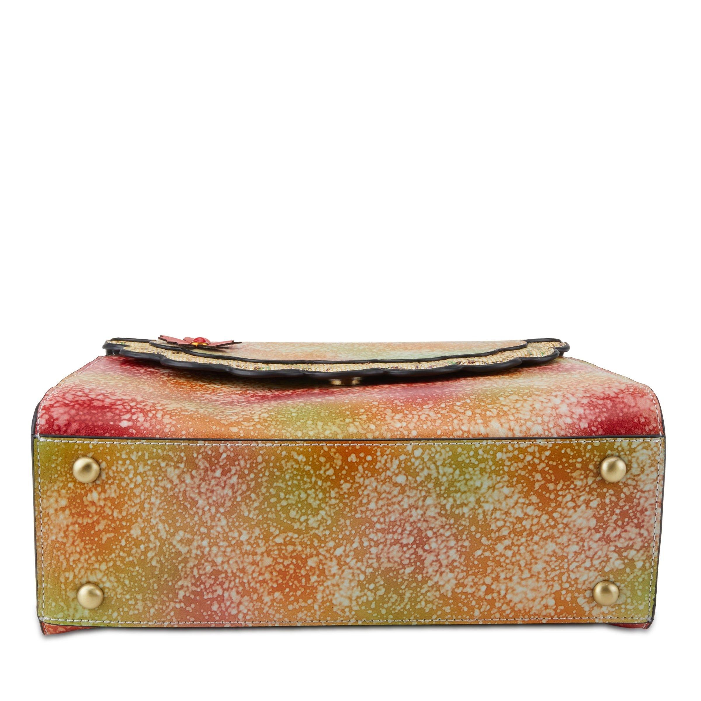 Ladylike, with just the right amount of subtle but unmistakable sass! Structured, yet the flower-embellished double row of scallop edging keeps her soft. Hand-painted galactic multi-colored print with a touch of metallic whimsy in pretty pastels with matching undertones, keep her cleverly quiet until you get close, and then 'POW'! She speaks volumes without saying a word.