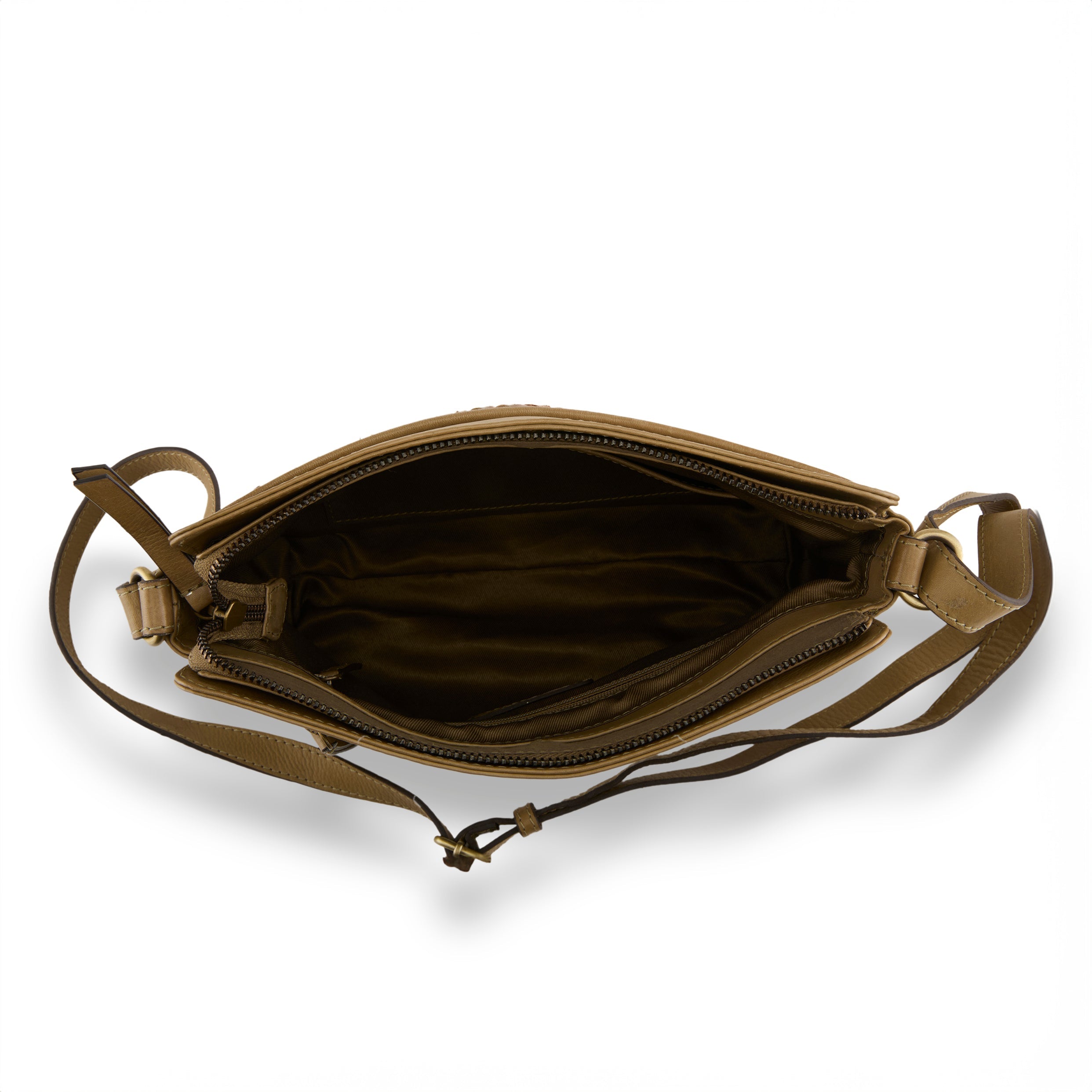 We couldn't love these contrasting woven colors of olive, camel, tan and brown any more than if we wove them ourselves! Checkerboard full length front slip snap pocket enhances the beauty, richness, and buttery softness of our multi faceted lightweight genuine leather neutral soft olive color base that will just keep getting softer and better each time you swing her over your shoulder or wrap her across your body- she's the kinda bag that just keeps on giving.
