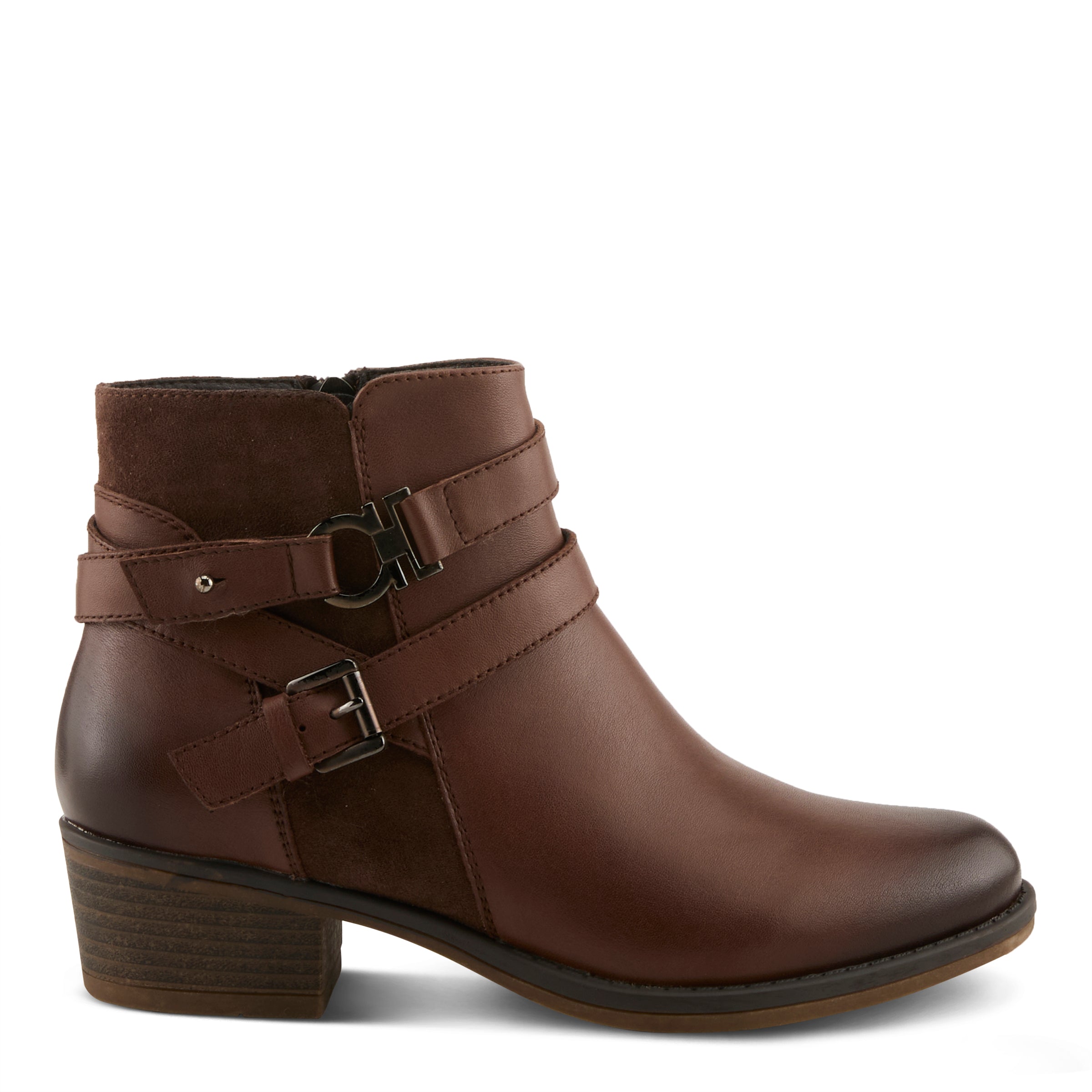 Elevate your style with a sleek and modern bootie crafted from a luxurious combination of smooth leather and suede for a rich, textural contrast. The belted strap design with metallic hardware adds a bold yet refined touch, while the front burnishing detail enhances its timeless appeal. Set on a faux stacked heel, this bootie provides a perfect balance of height and stability. The inside zipper closure ensures effortless wear, while the cushioned insole delivers all-day comfort. Versatile and stylish, this bootie is ideal for pairing with both casual and dressy ensembles, making it a must-have addition to your wardrobe.