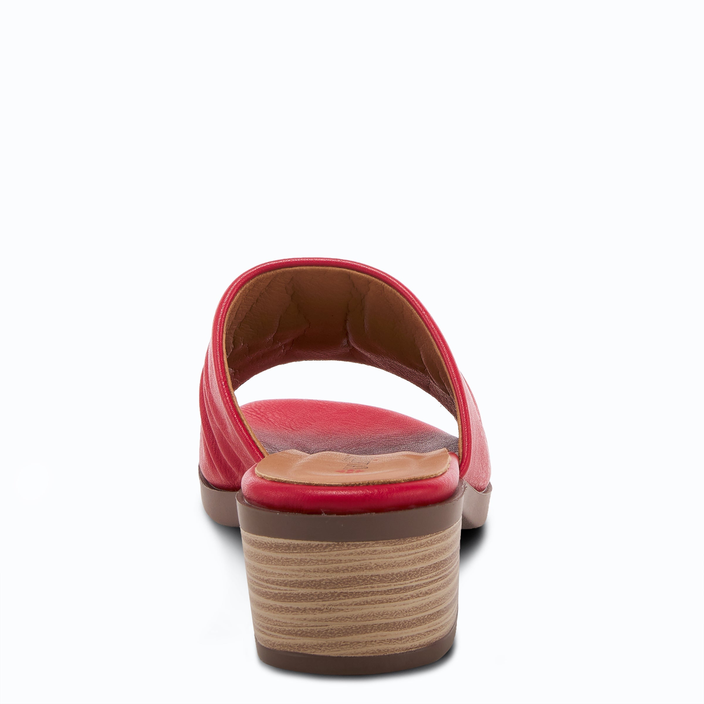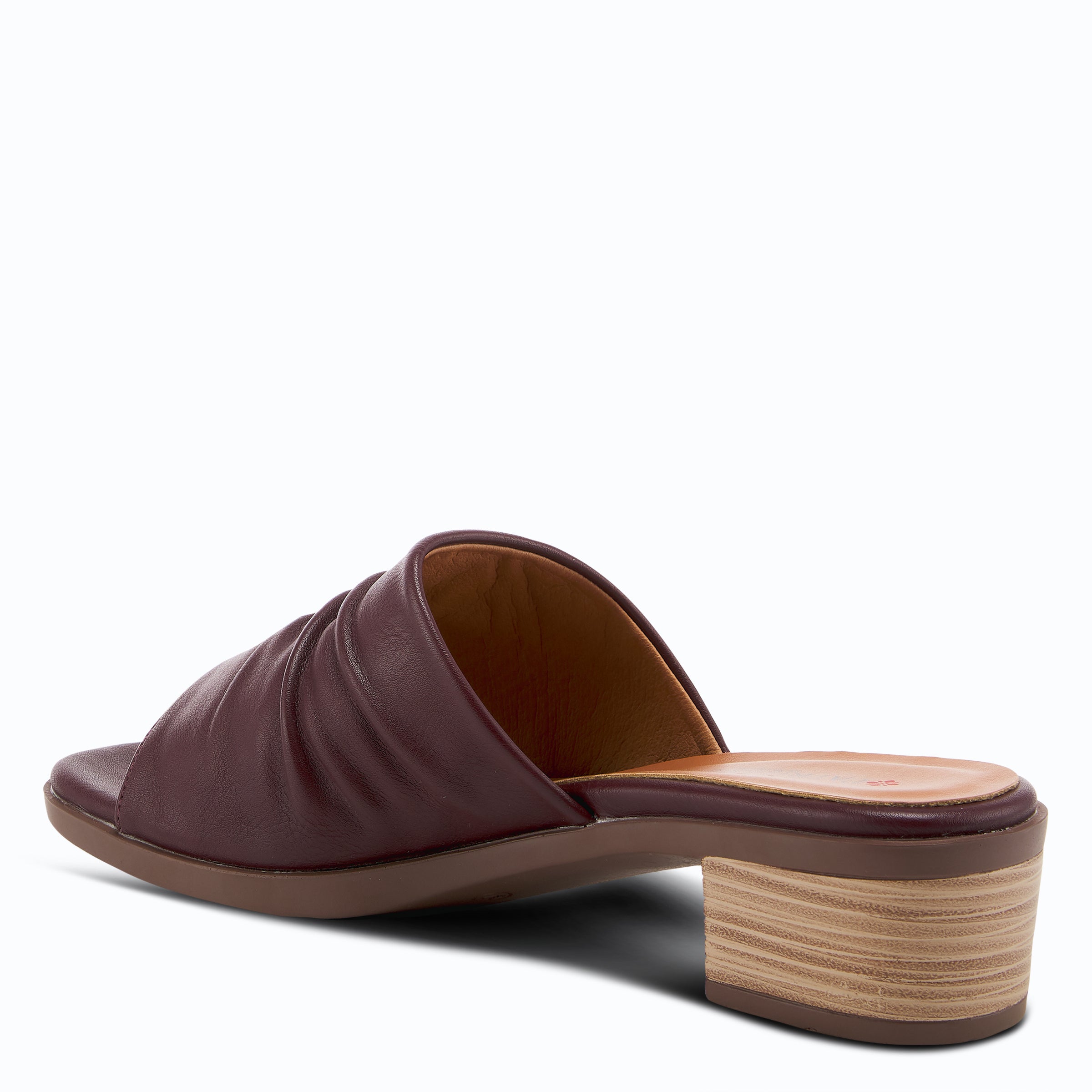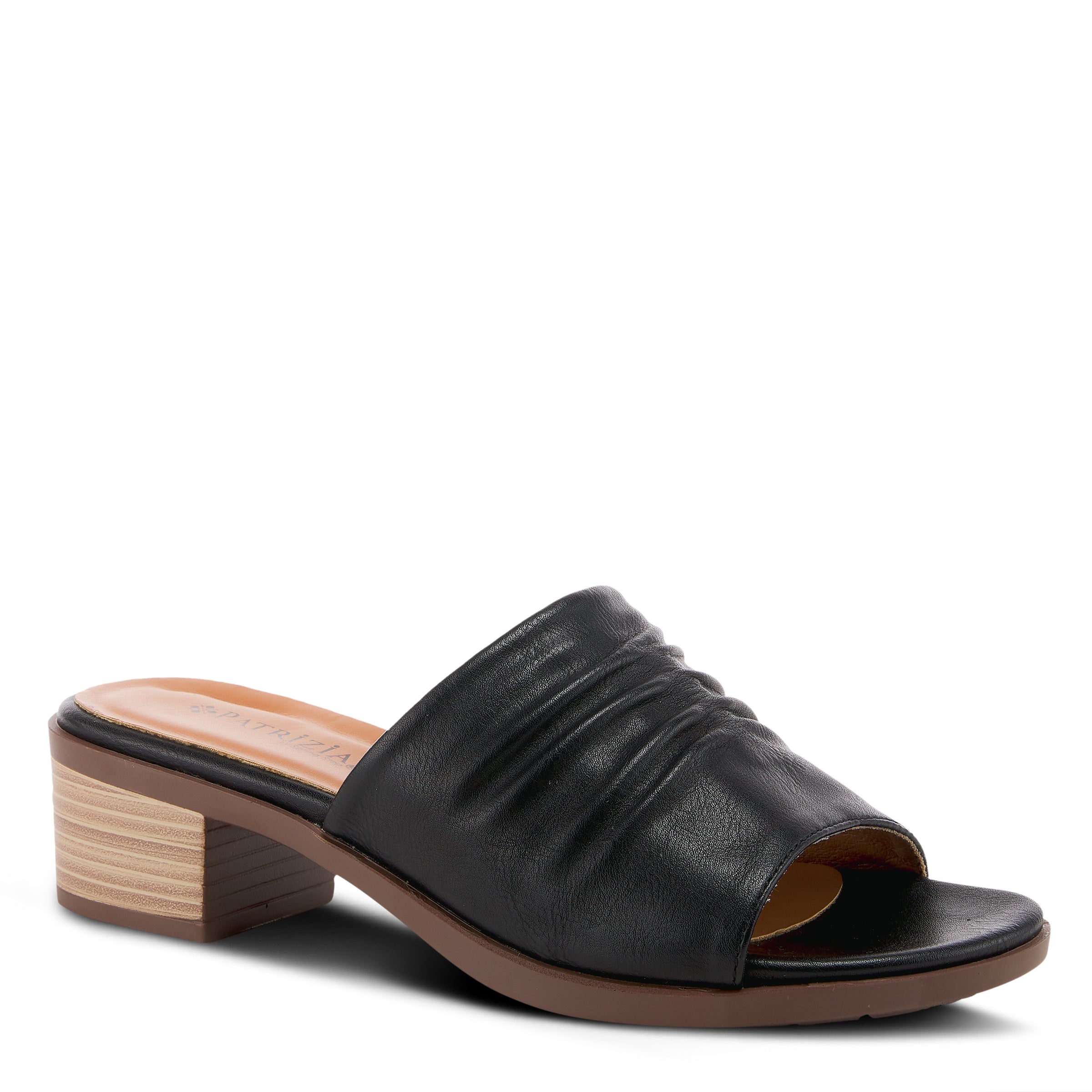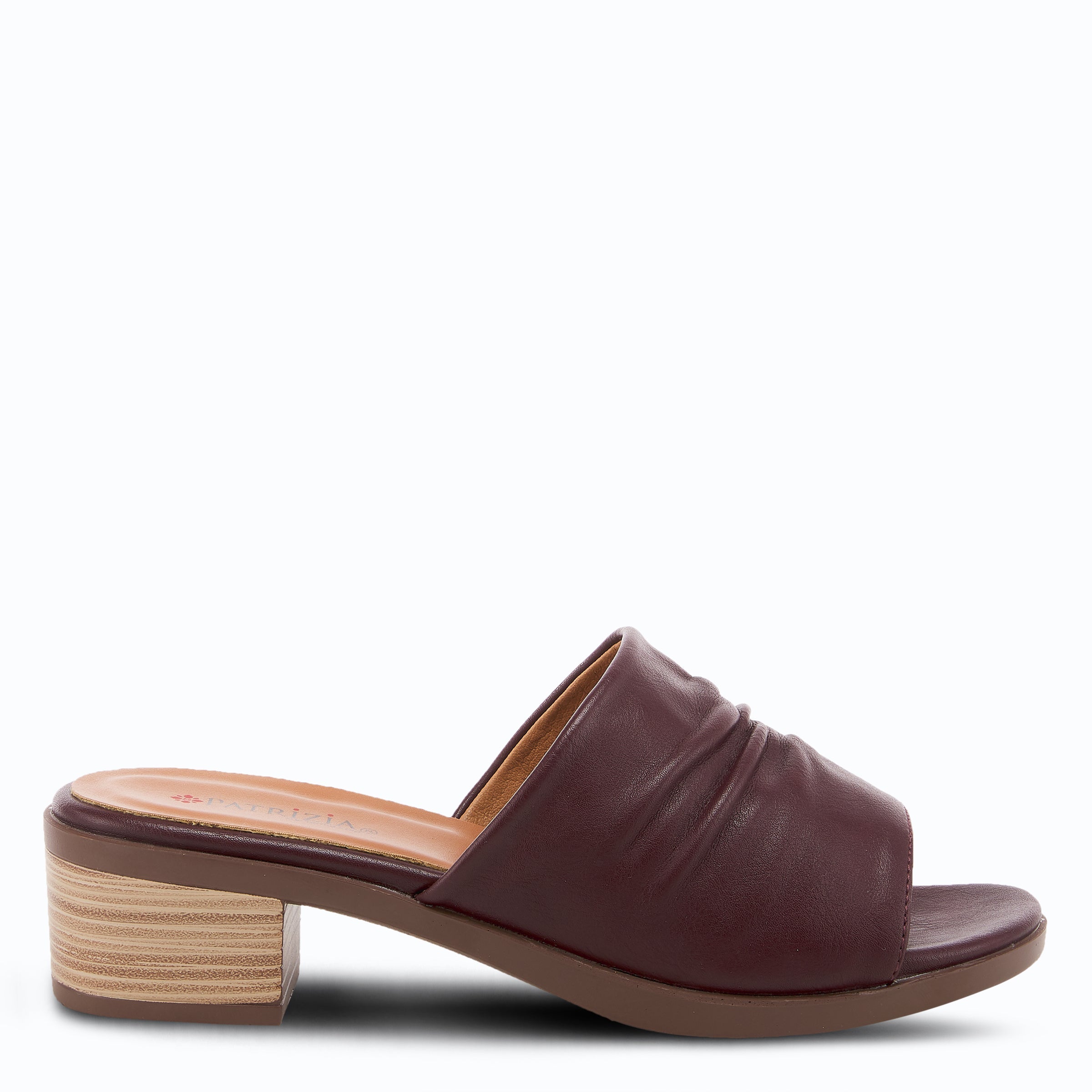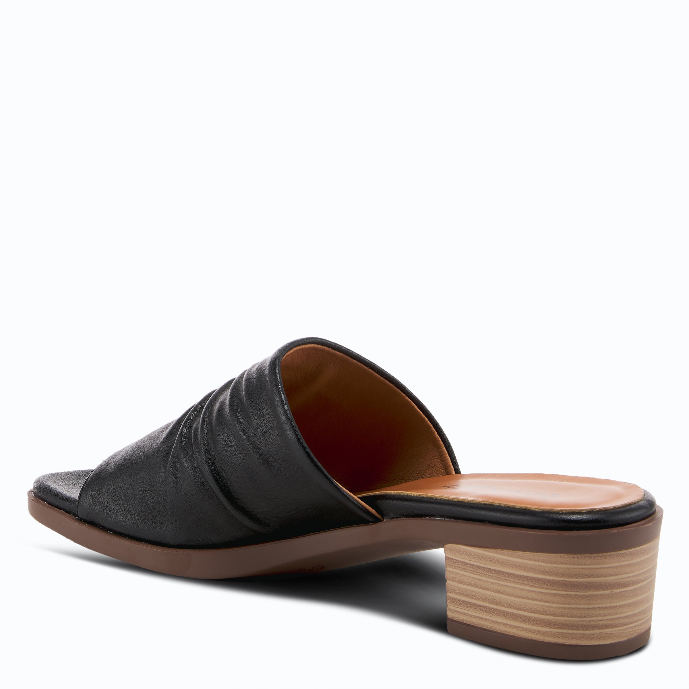 Pleated upper, high quality synthetic leather slide sandal with a faux stacked, blocked heel.