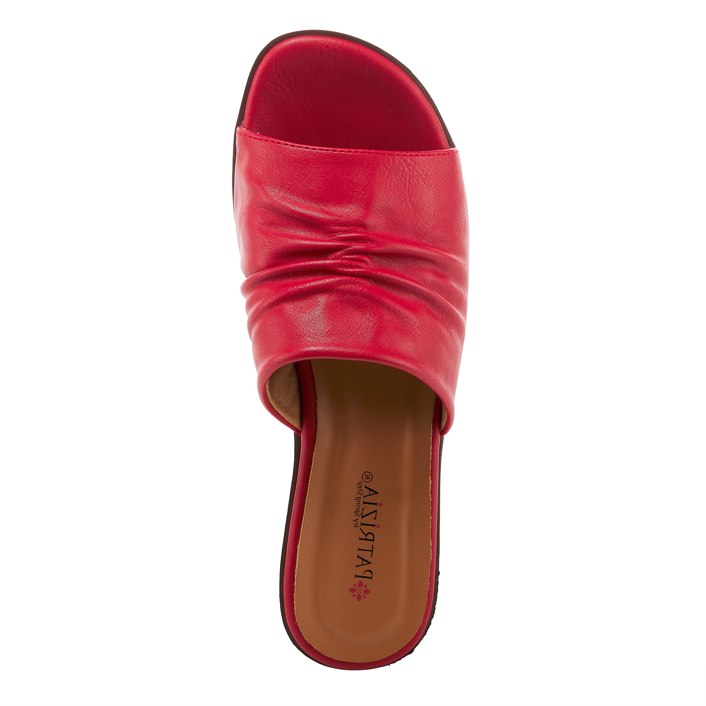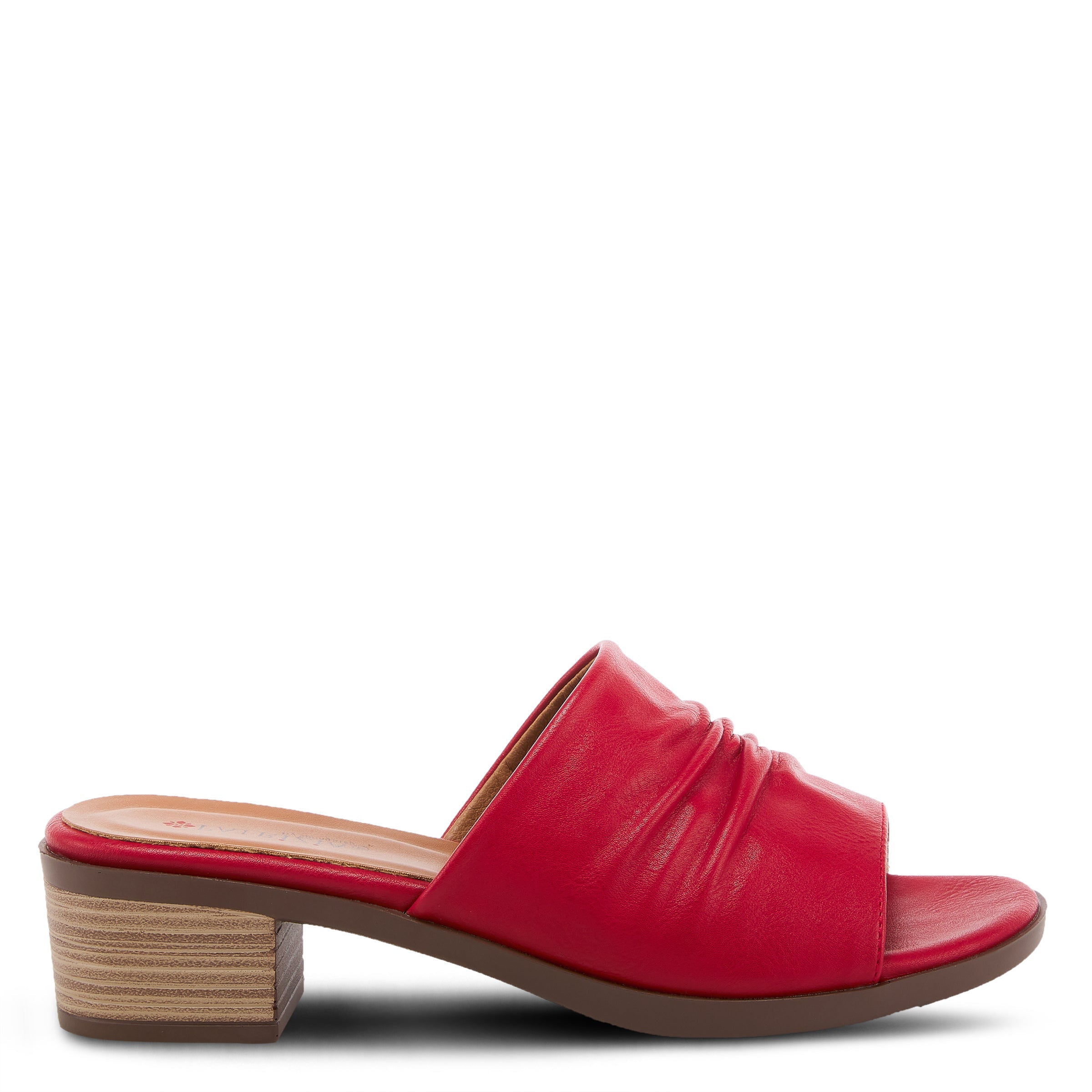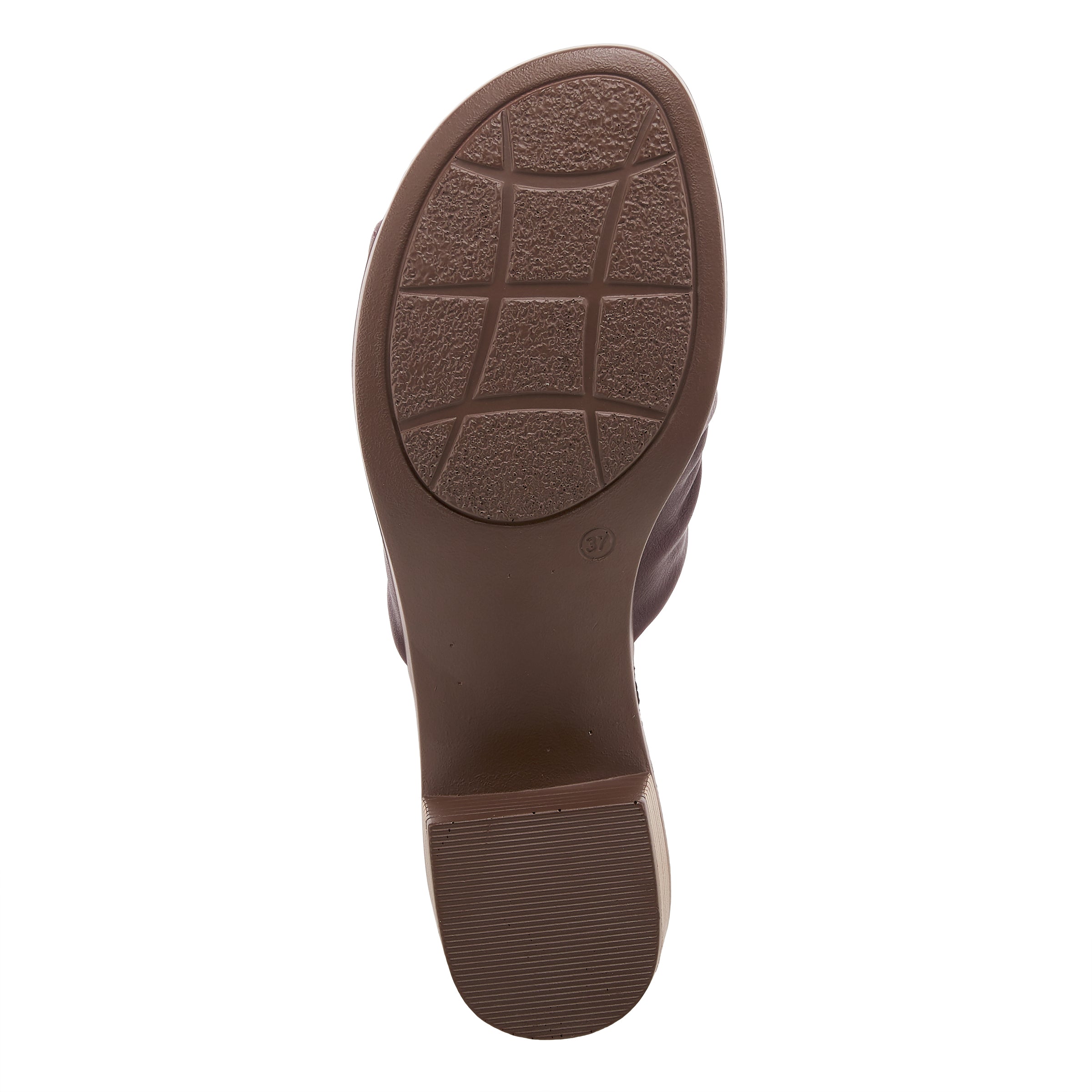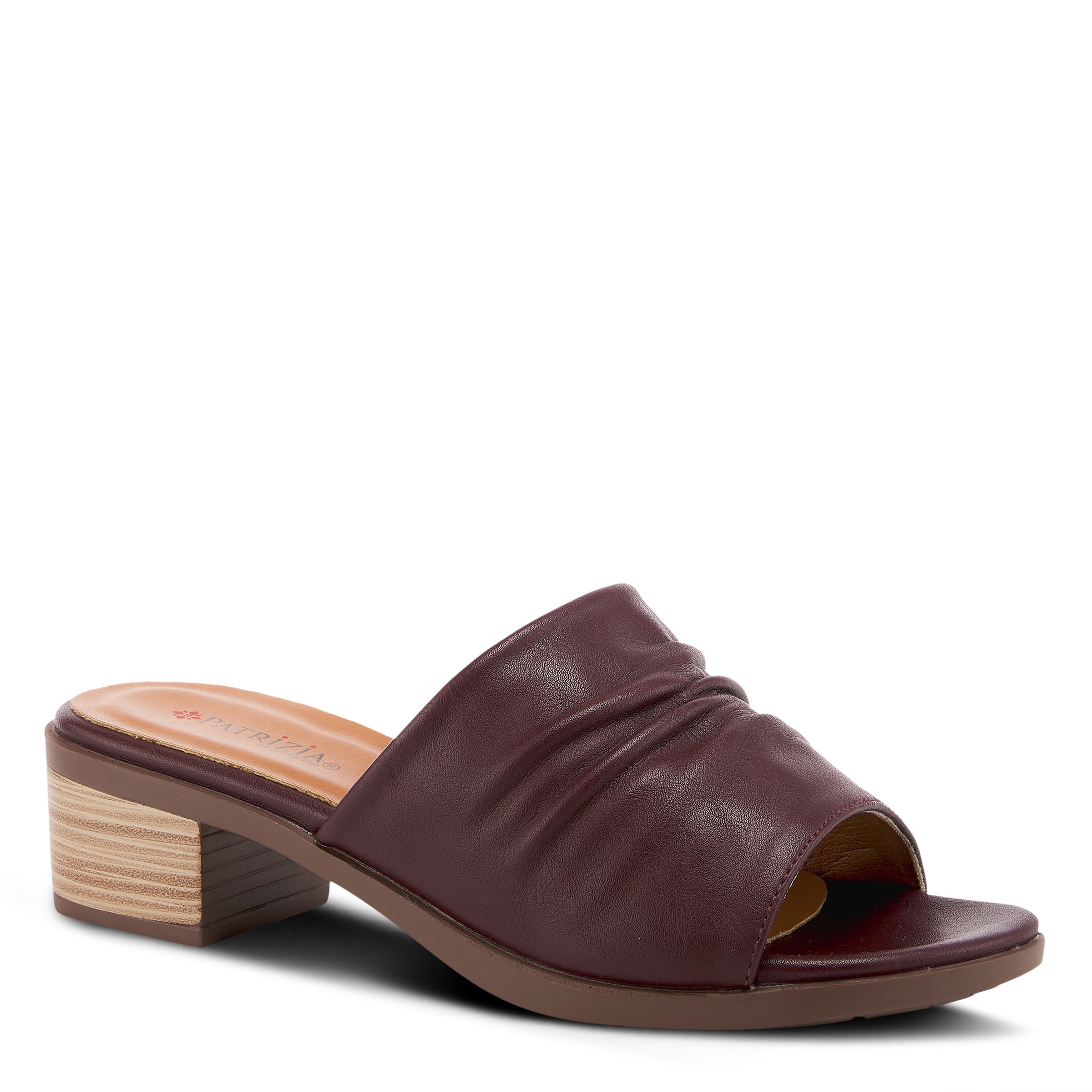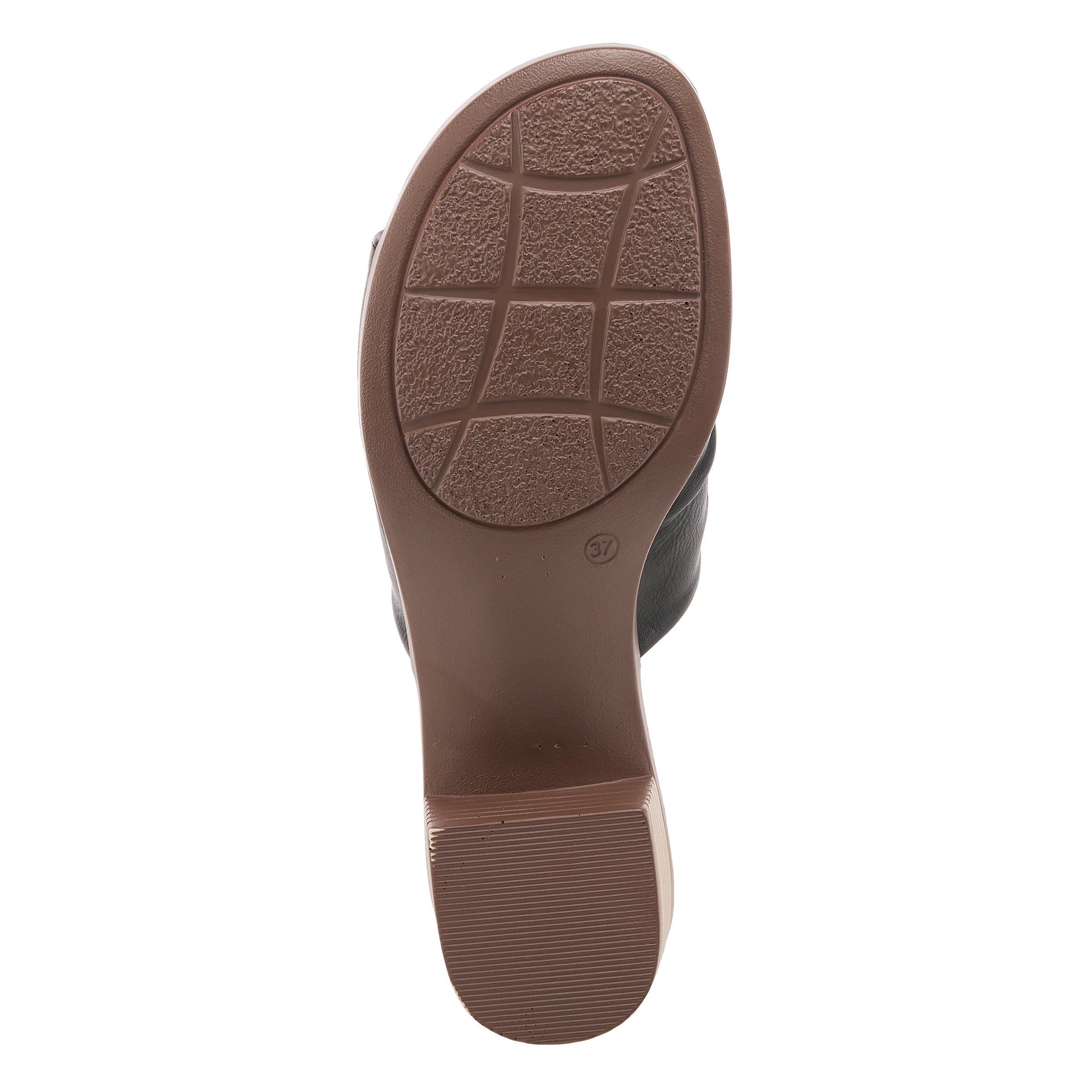 Pleated upper, high quality synthetic leather slide sandal with a faux stacked, blocked heel.