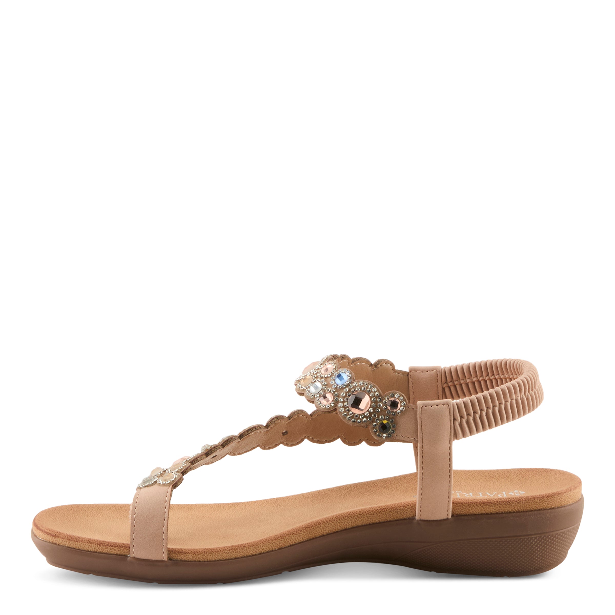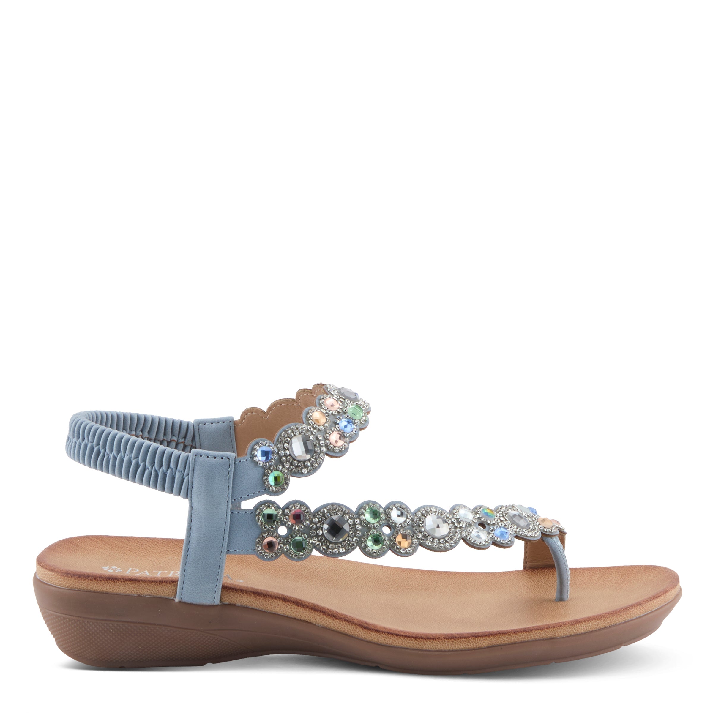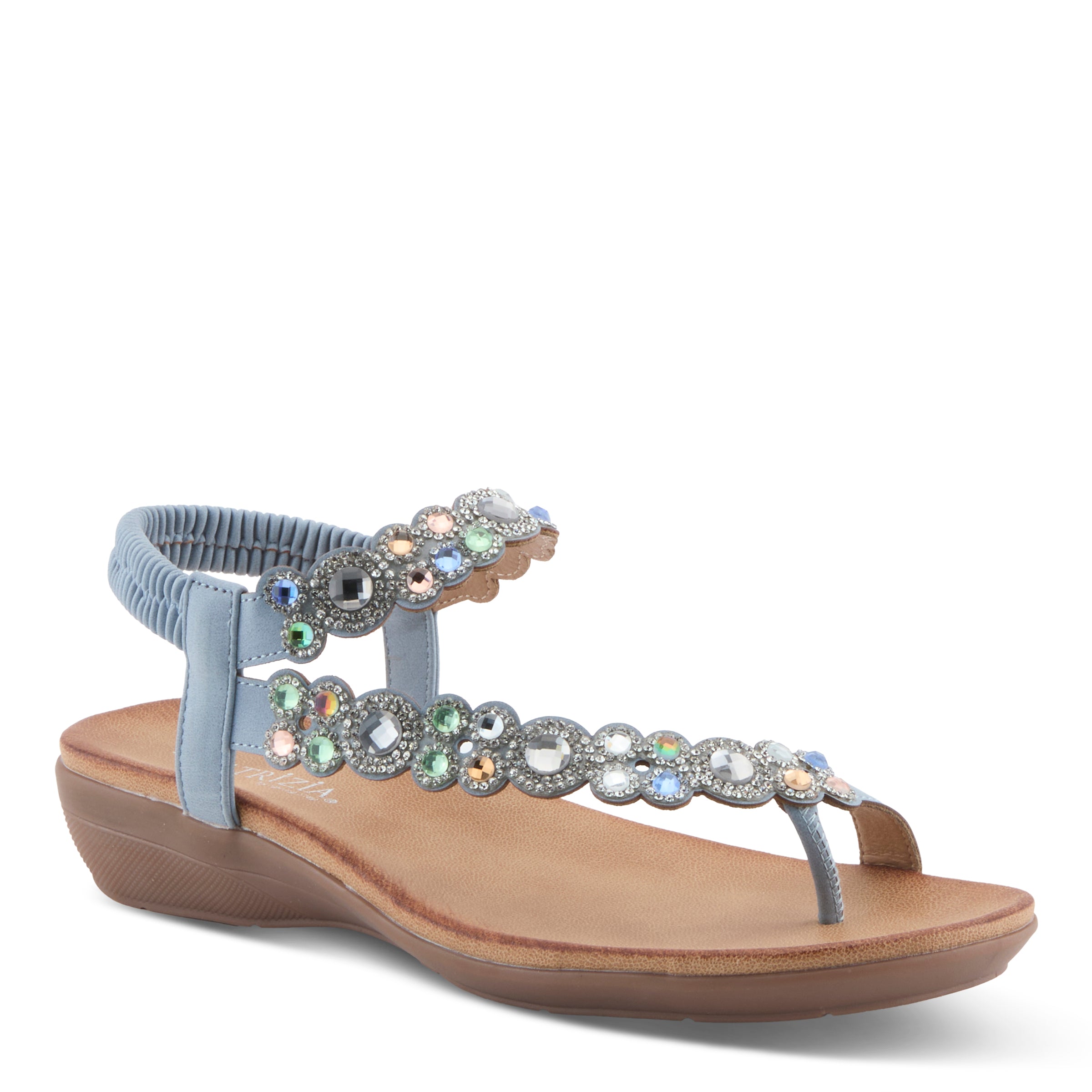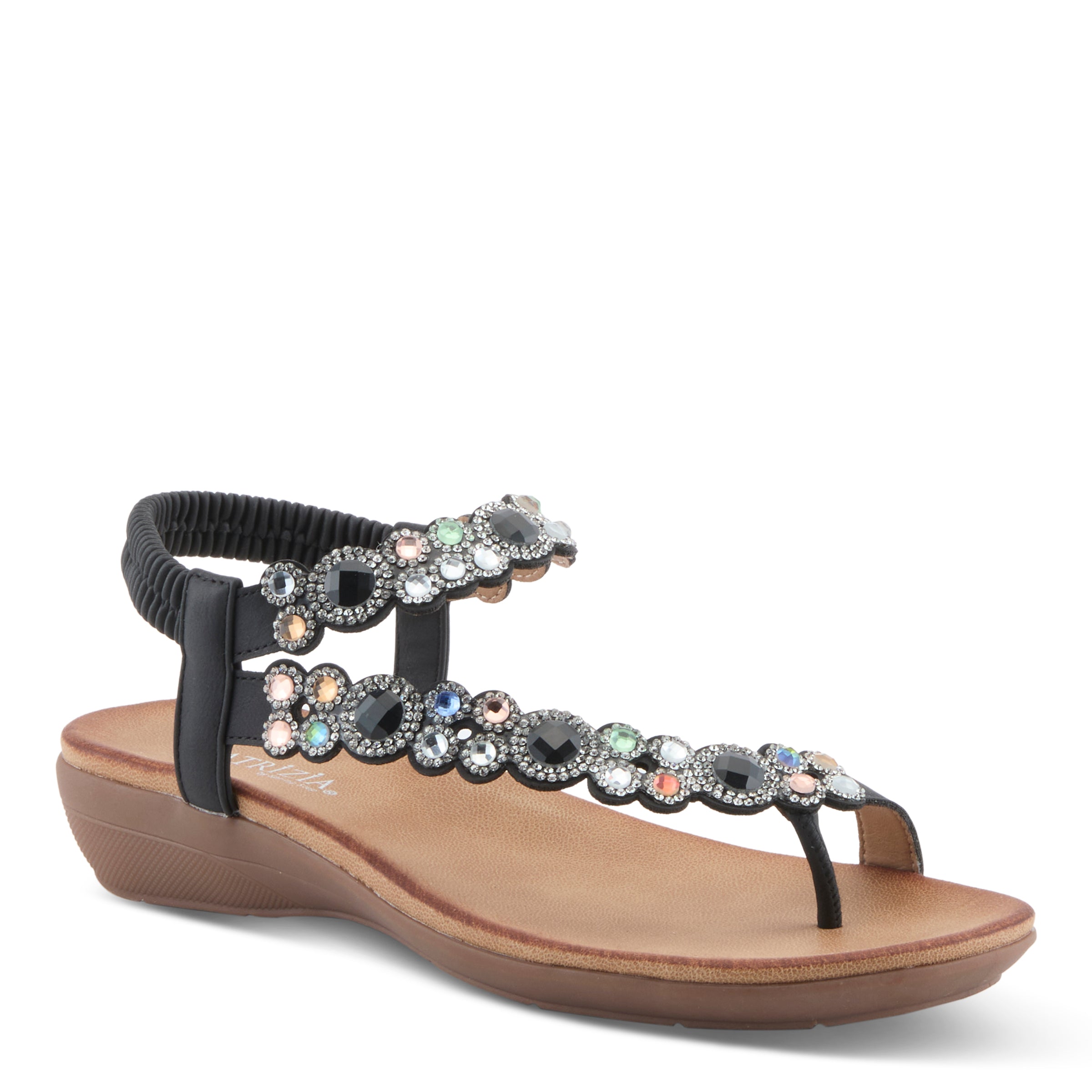Add sparkle and sophistication to your everyday look with this chic jeweled demi wedge sandal. Designed with a faux leather upper and adorned with shimmering gemstone-inspired embellishments, this sandal delivers a fashion-forward statement while keeping comfort in mind. The elastic back strap makes it easy to slip on and ensures a secure fit, while the open design keeps your look cool and breezy.