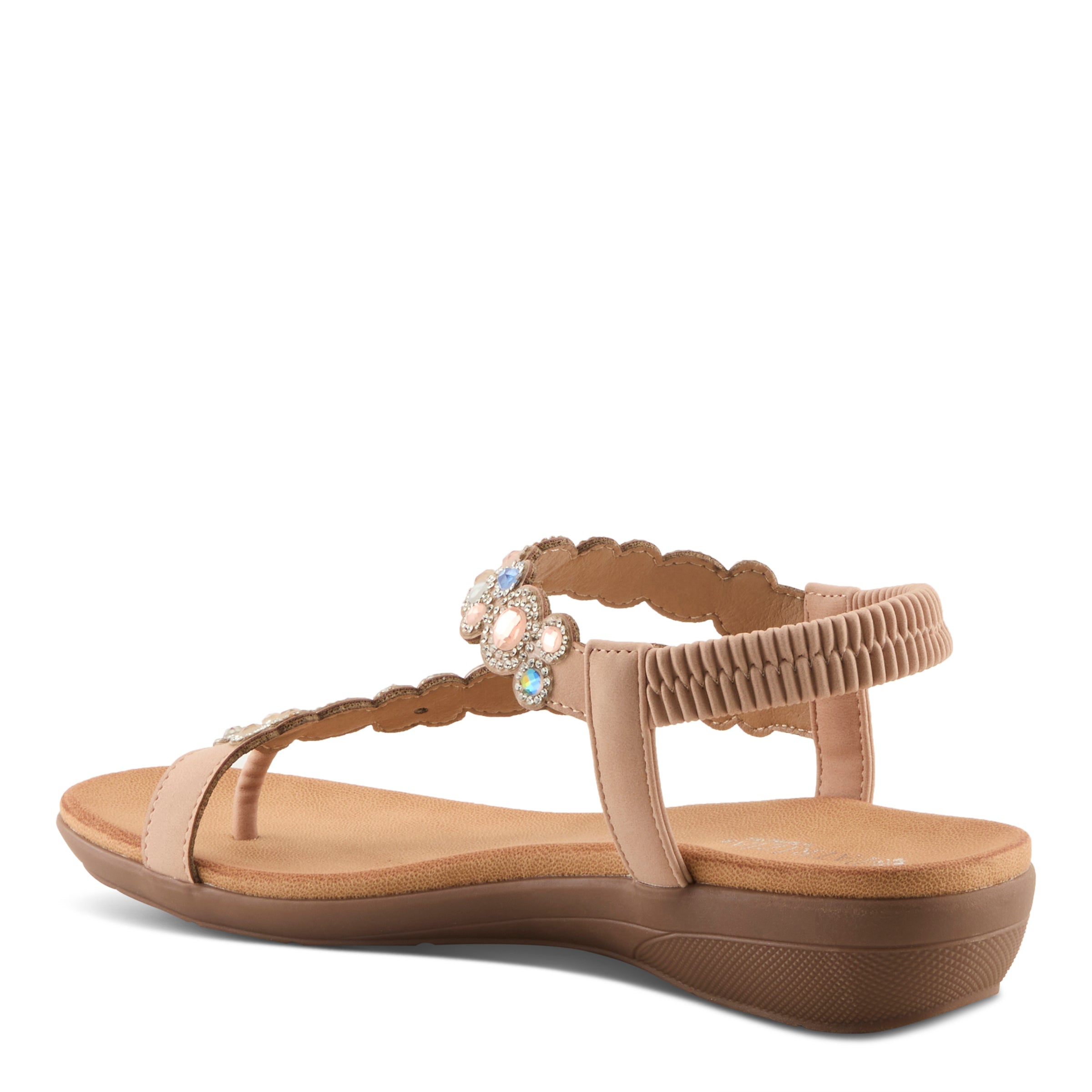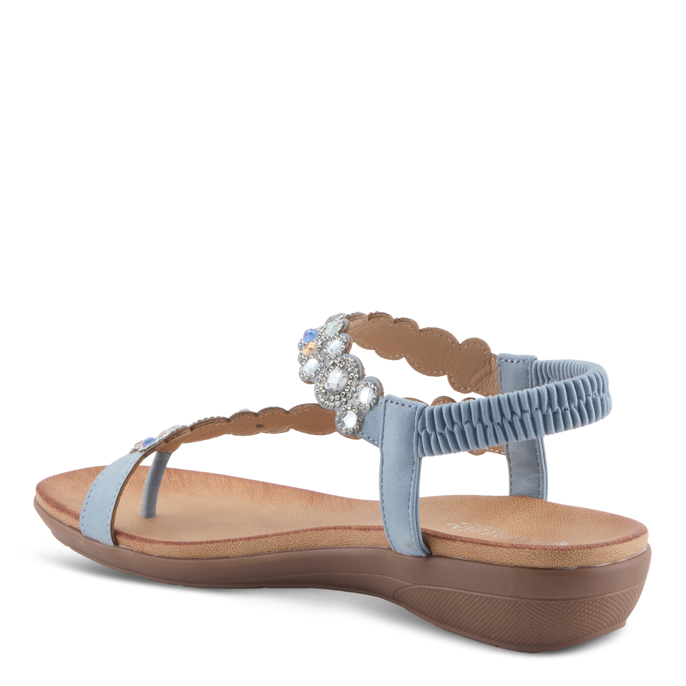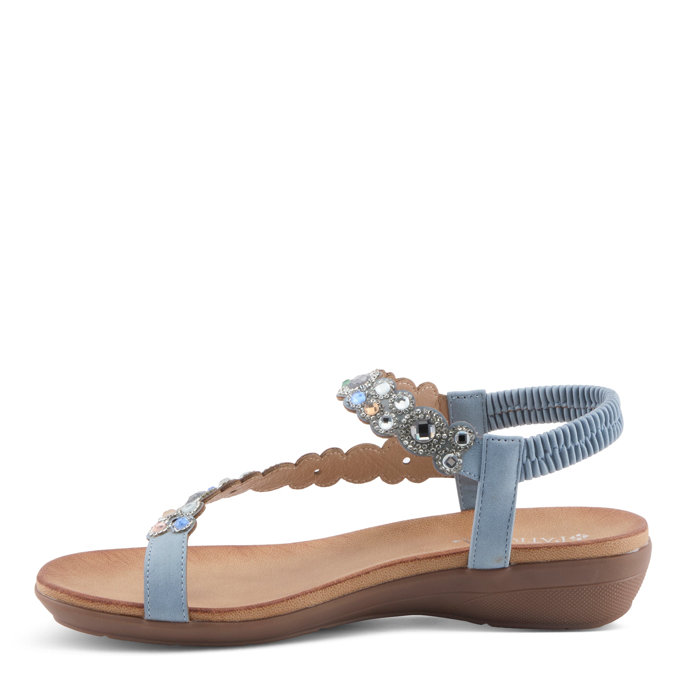 Add sparkle and sophistication to your everyday look with this chic jeweled demi wedge sandal. Designed with a faux leather upper and adorned with shimmering gemstone-inspired embellishments, this sandal delivers a fashion-forward statement while keeping comfort in mind. The elastic back strap makes it easy to slip on and ensures a secure fit, while the open design keeps your look cool and breezy.