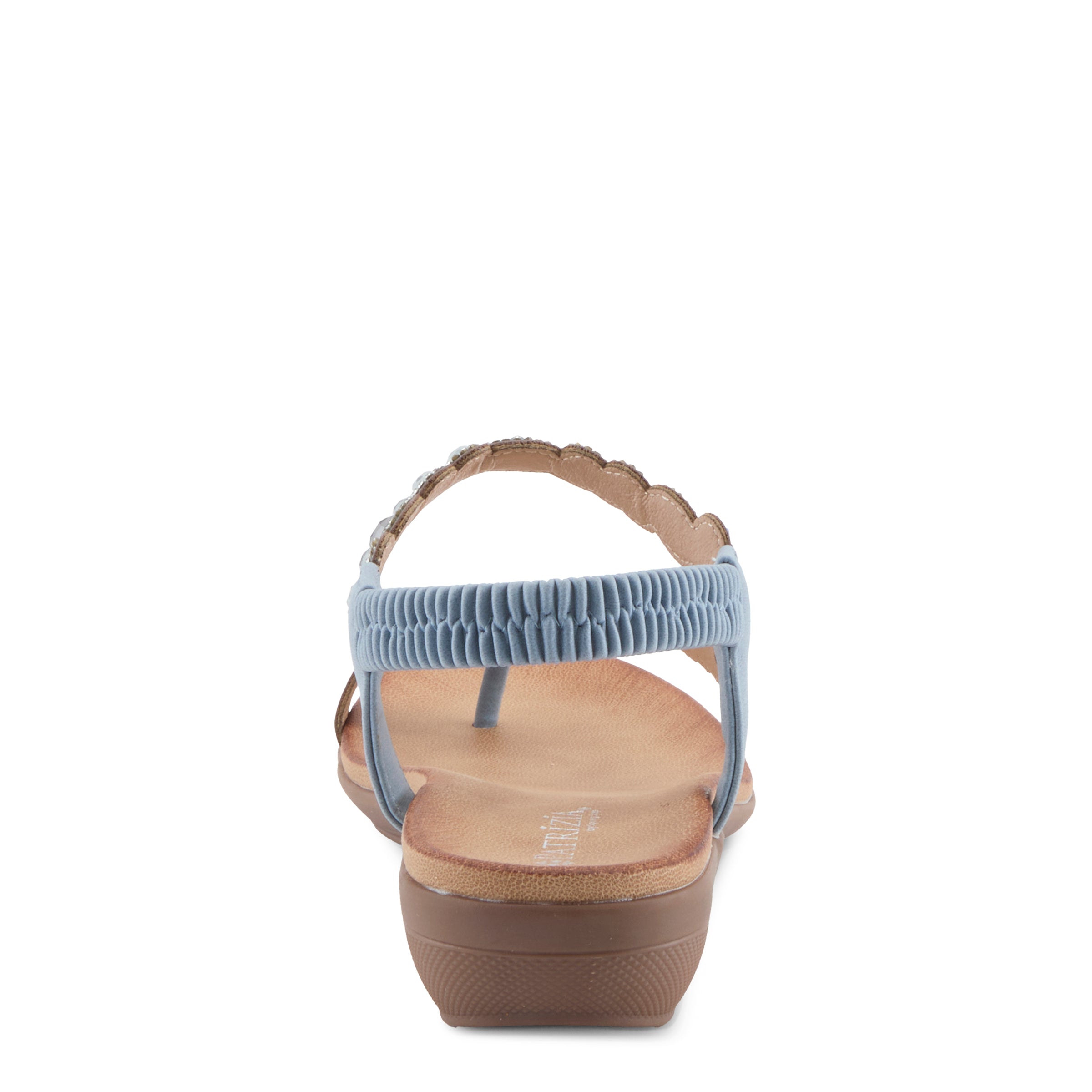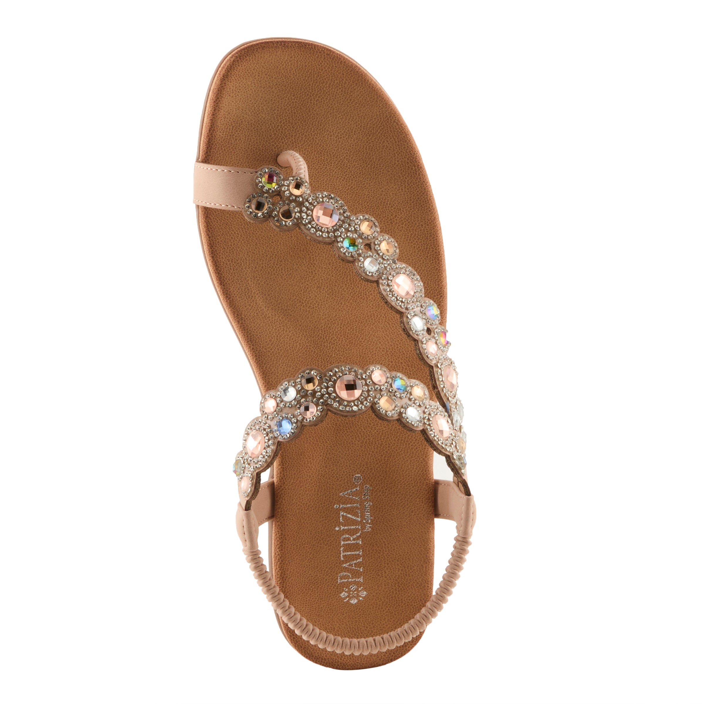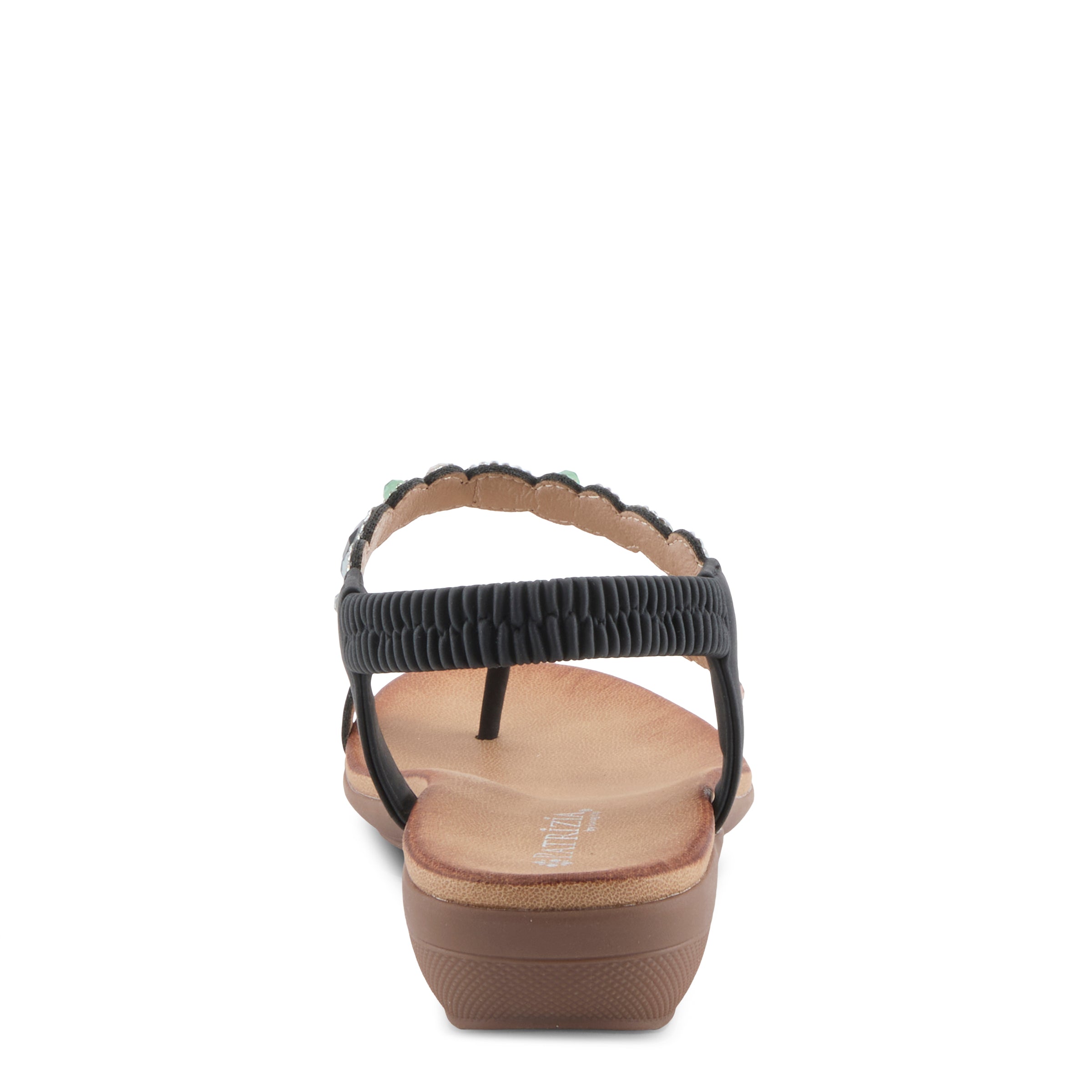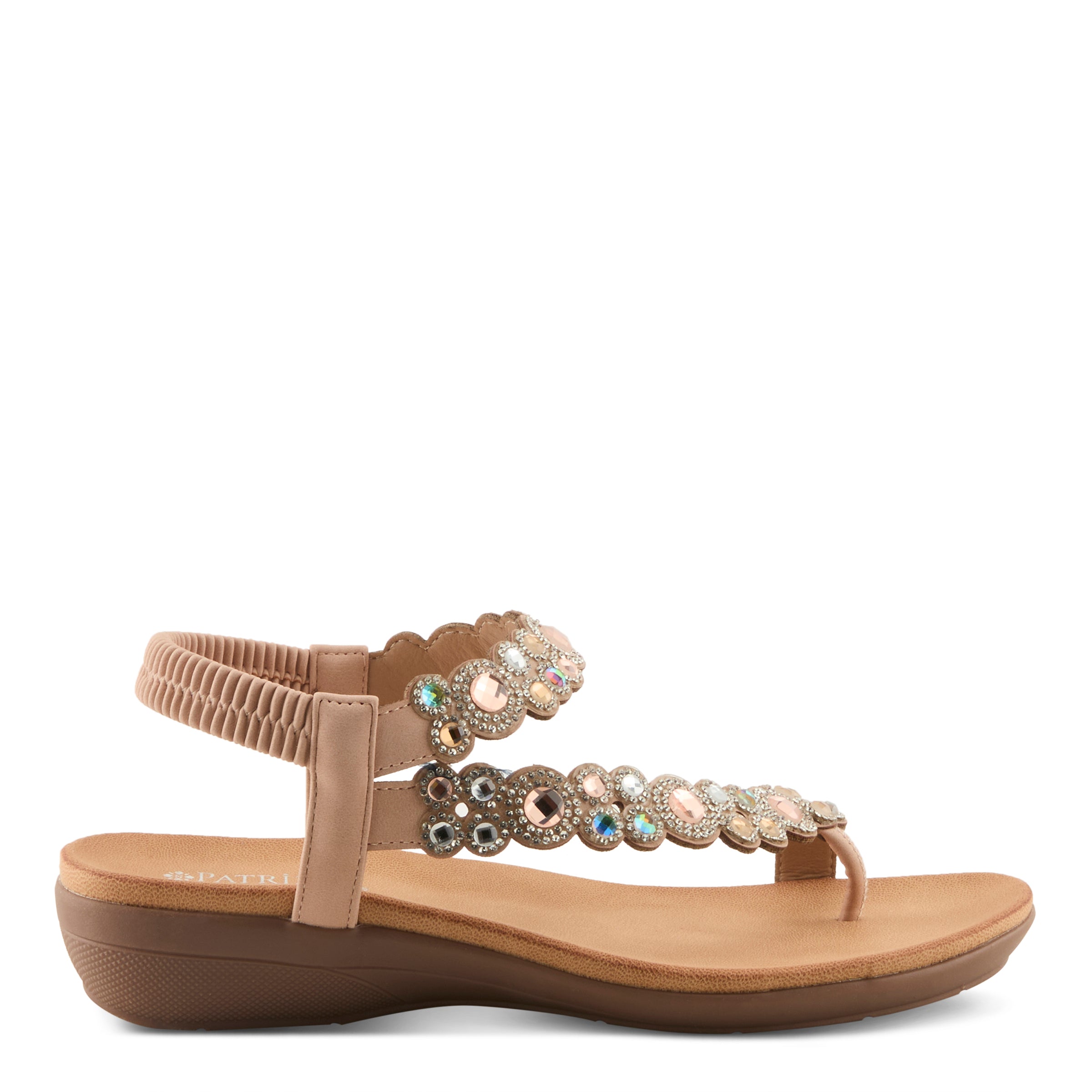 Add sparkle and sophistication to your everyday look with this chic jeweled demi wedge sandal. Designed with a faux leather upper and adorned with shimmering gemstone-inspired embellishments, this sandal delivers a fashion-forward statement while keeping comfort in mind. The elastic back strap makes it easy to slip on and ensures a secure fit, while the open design keeps your look cool and breezy.