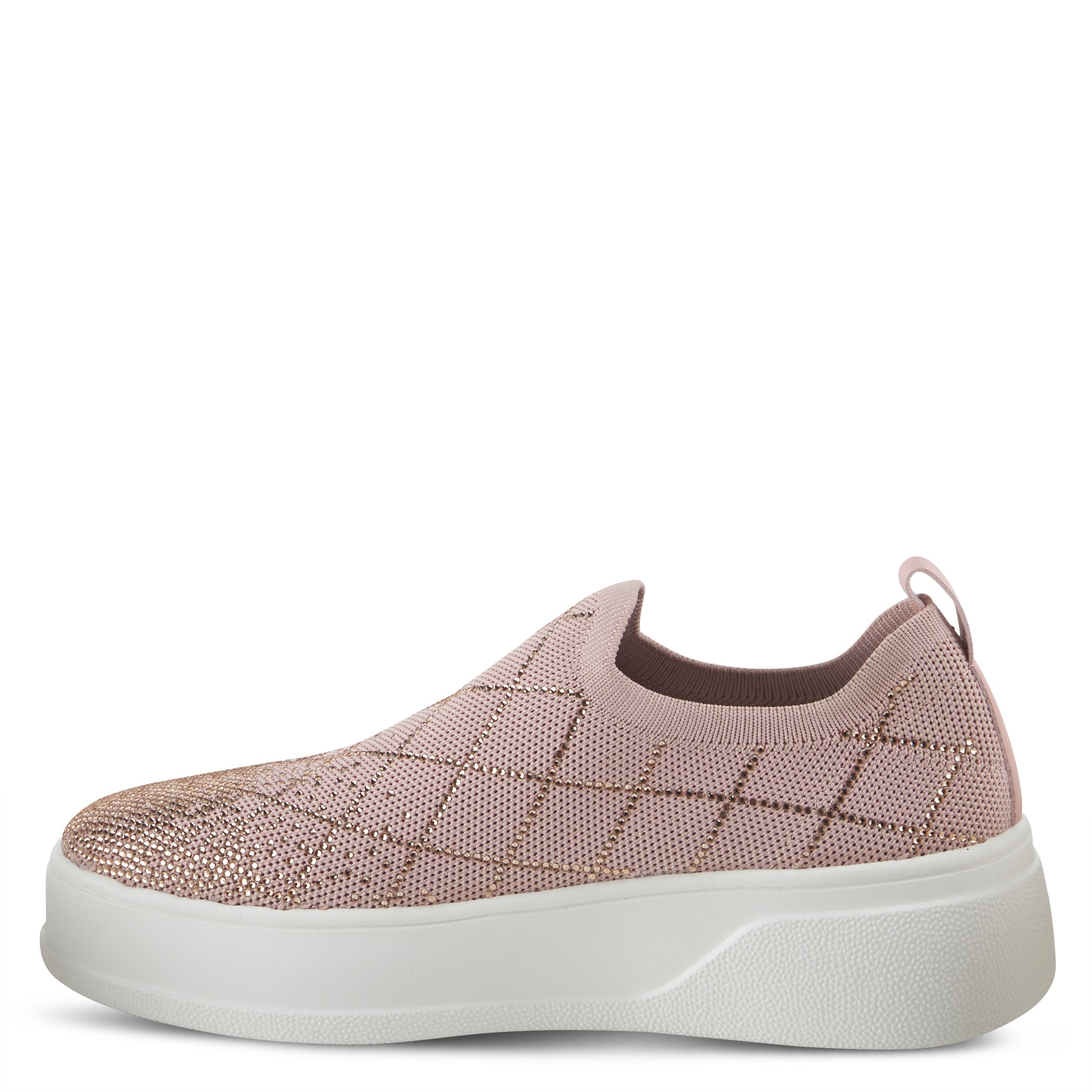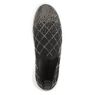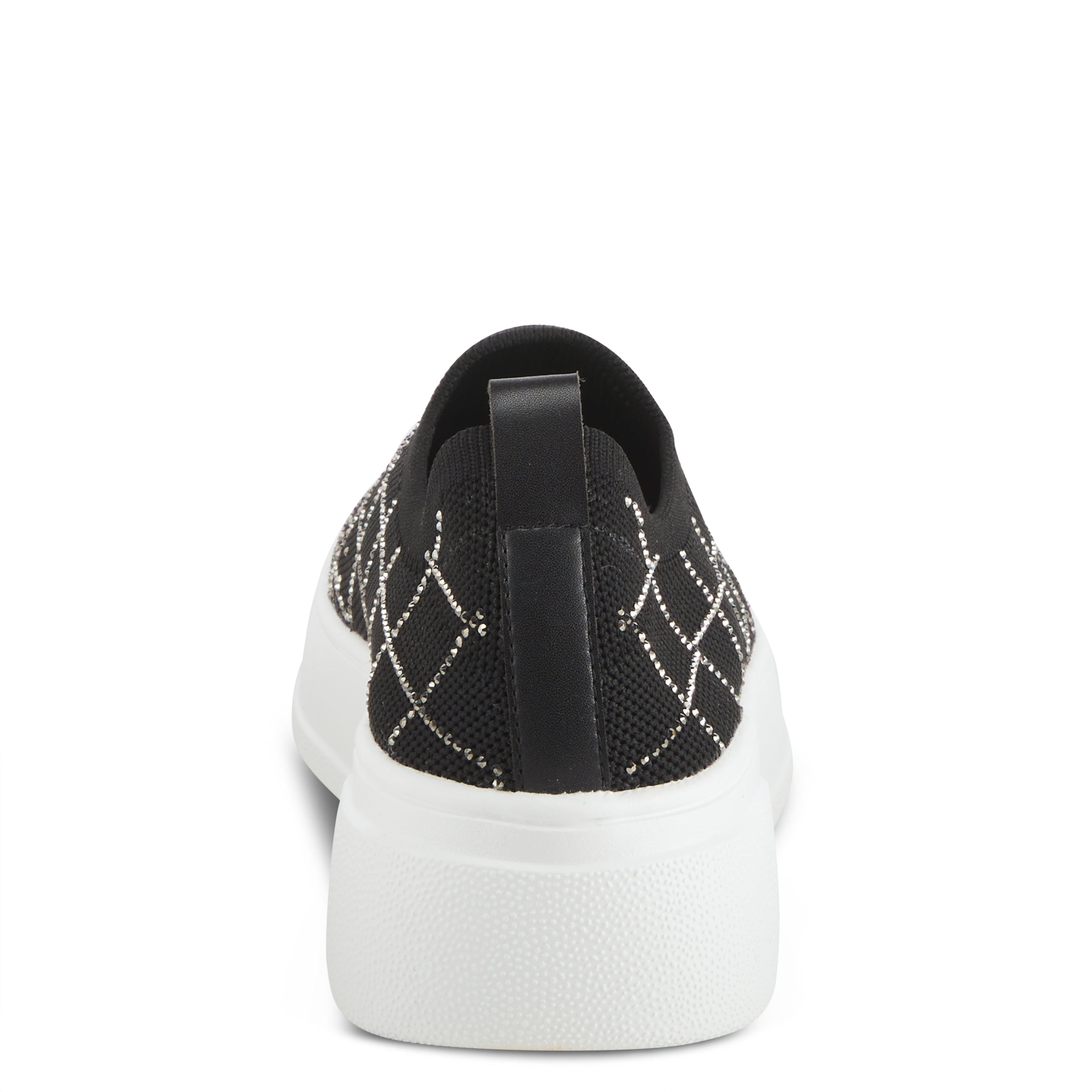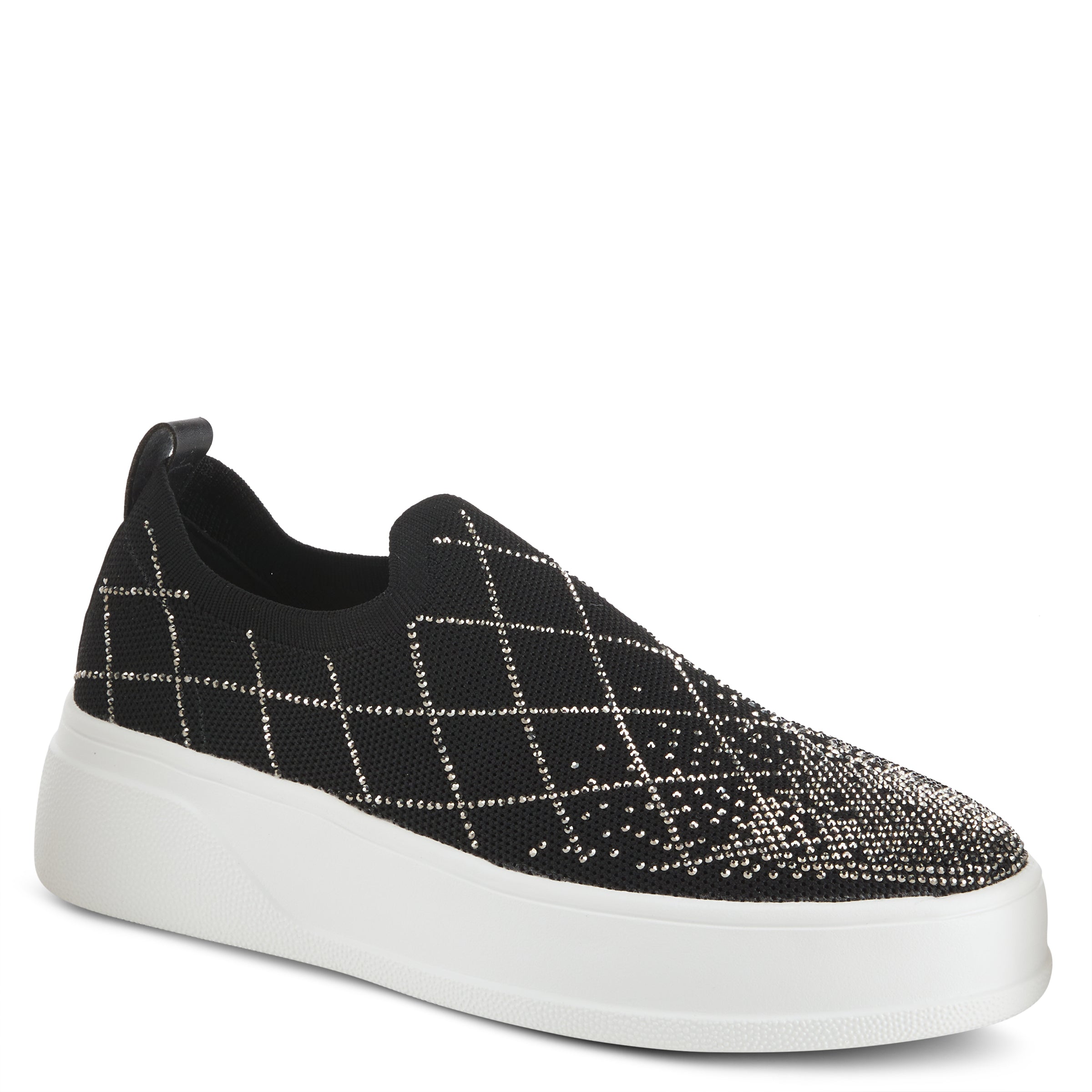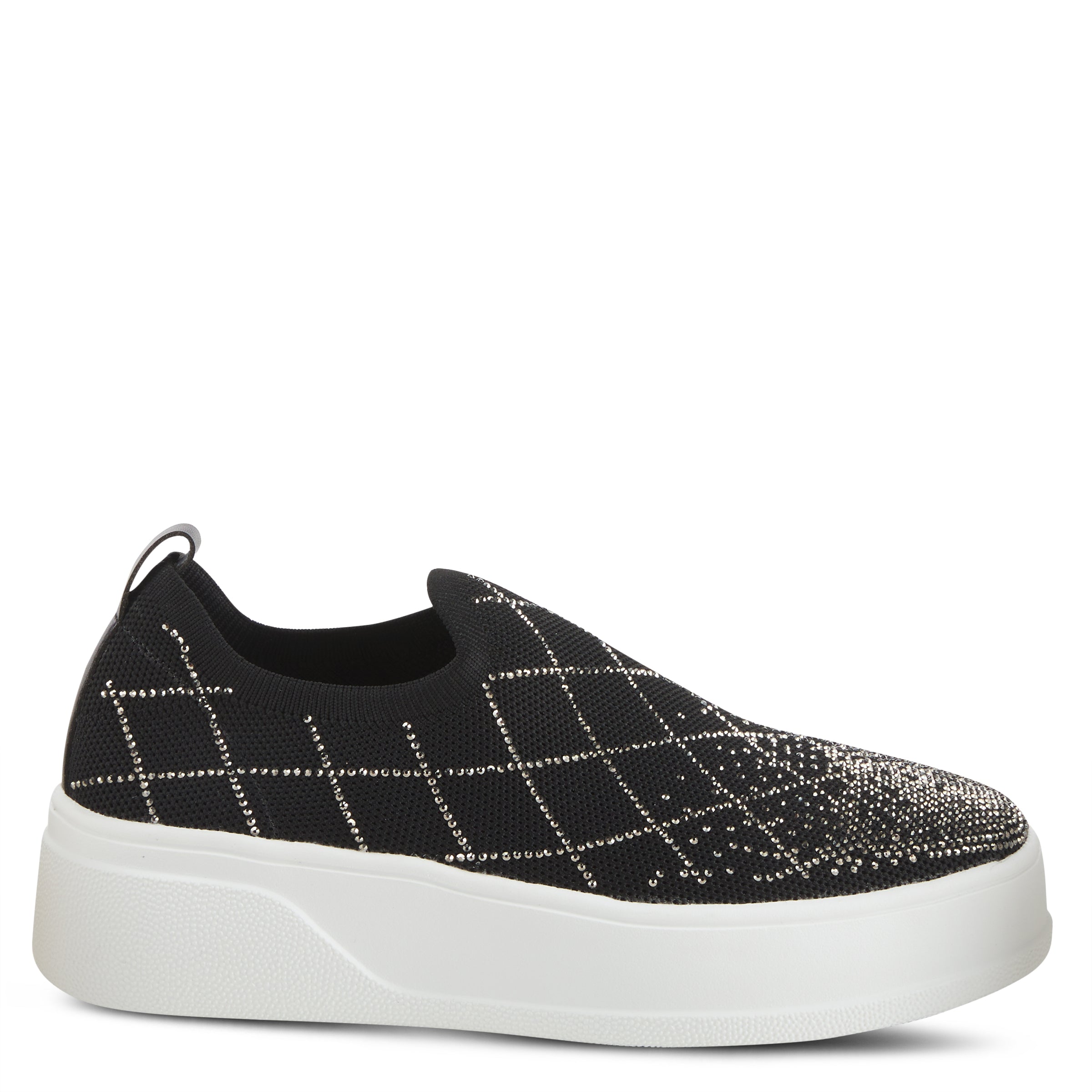 Trendy chic slip-on sneaker dripping in gemstones that make up a waffle pattern with a cushioned outsole on a chunky flatform.