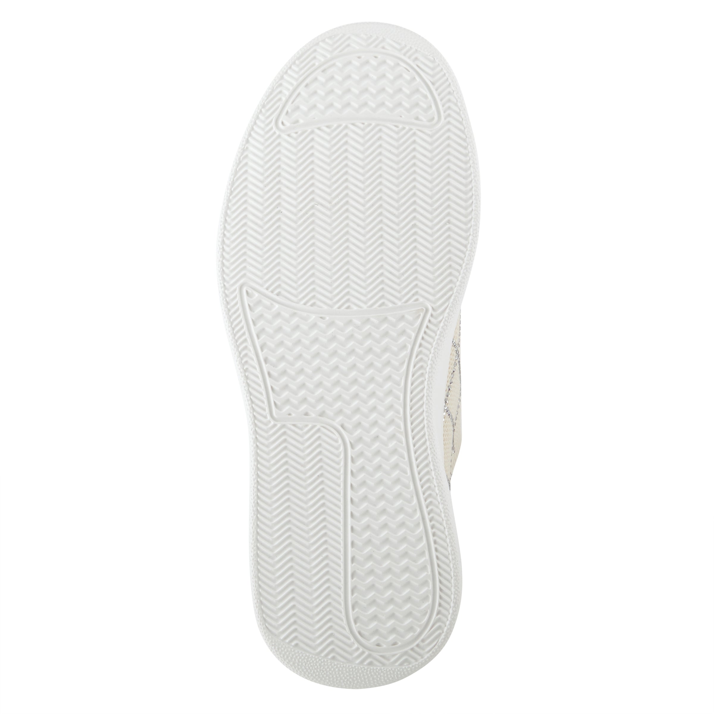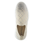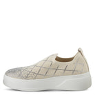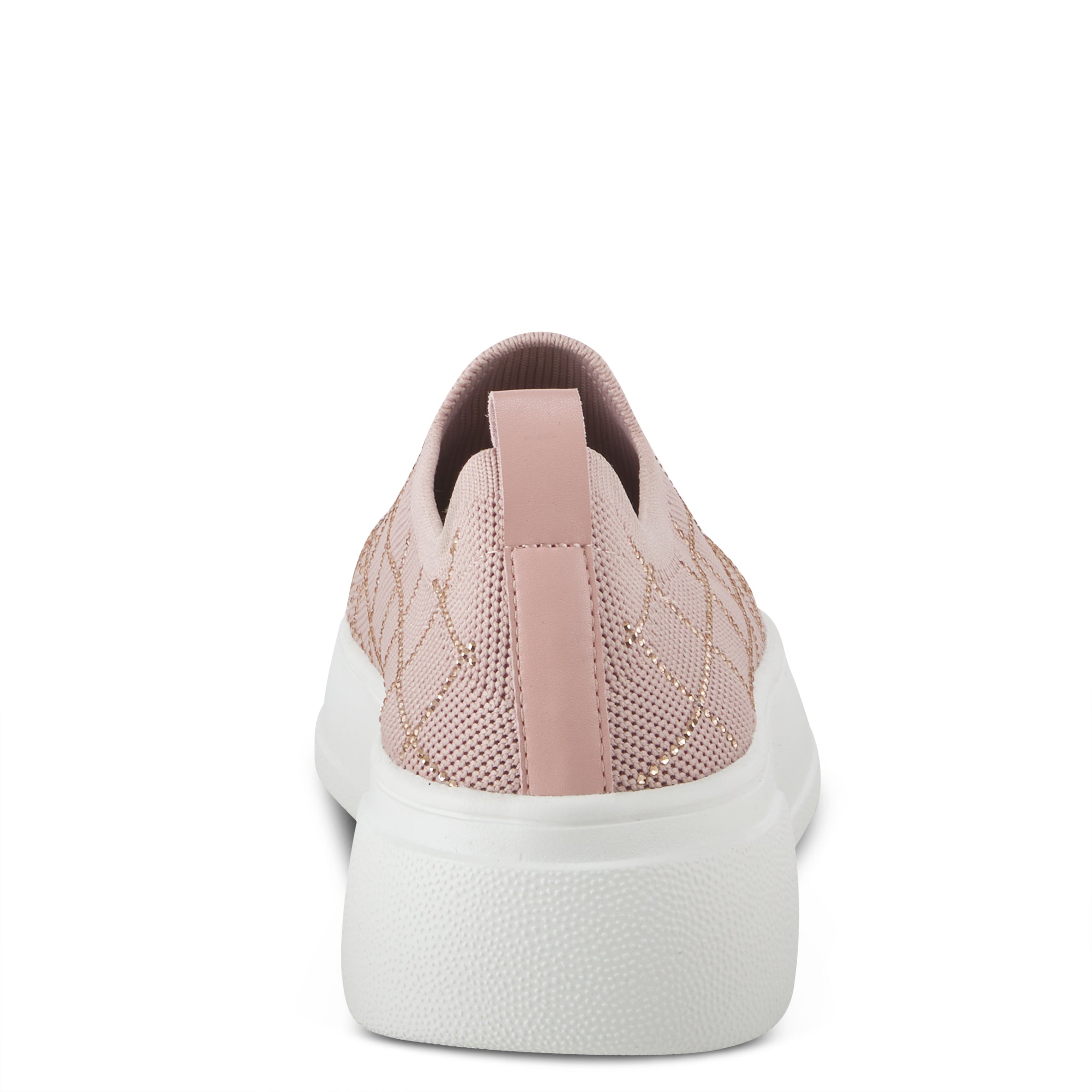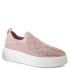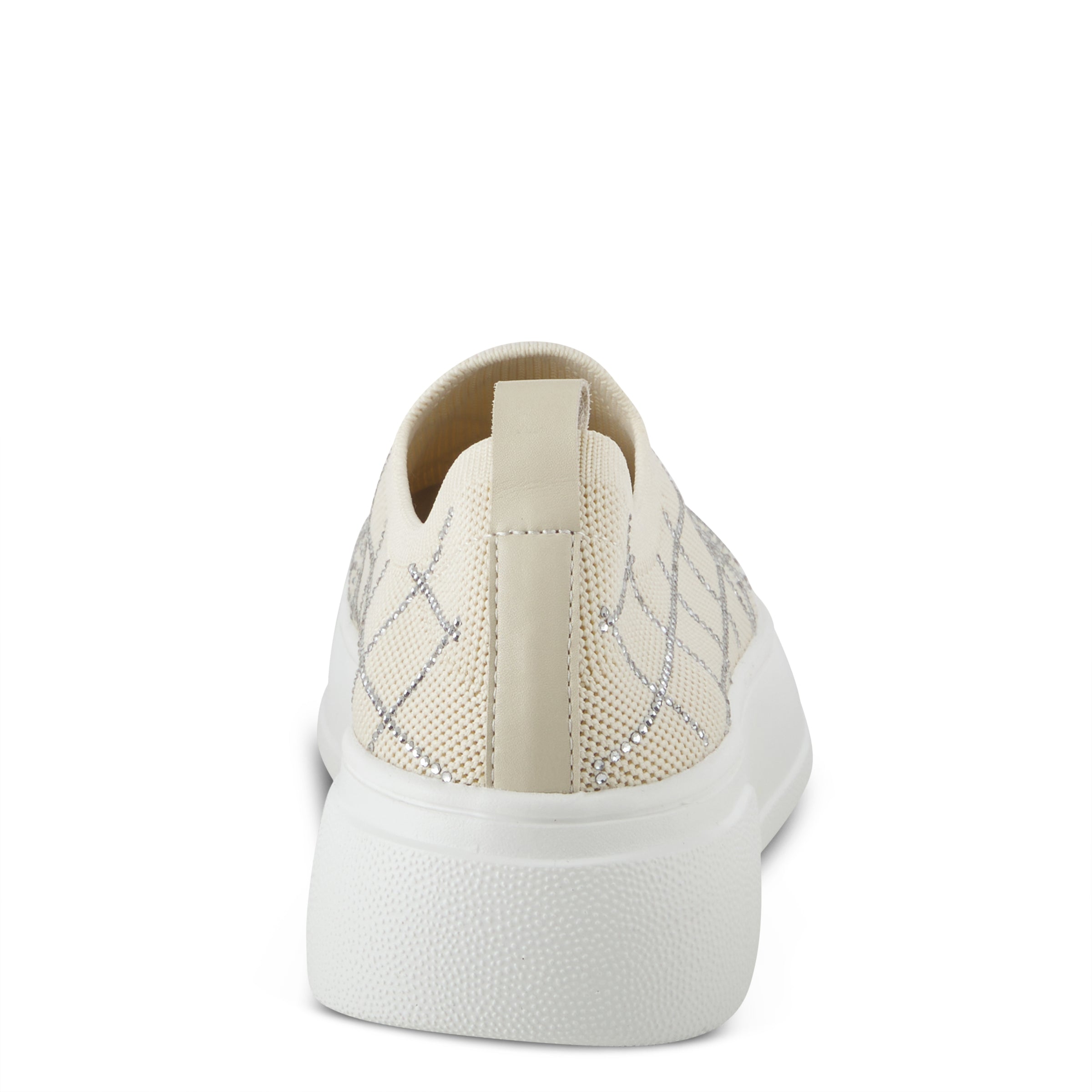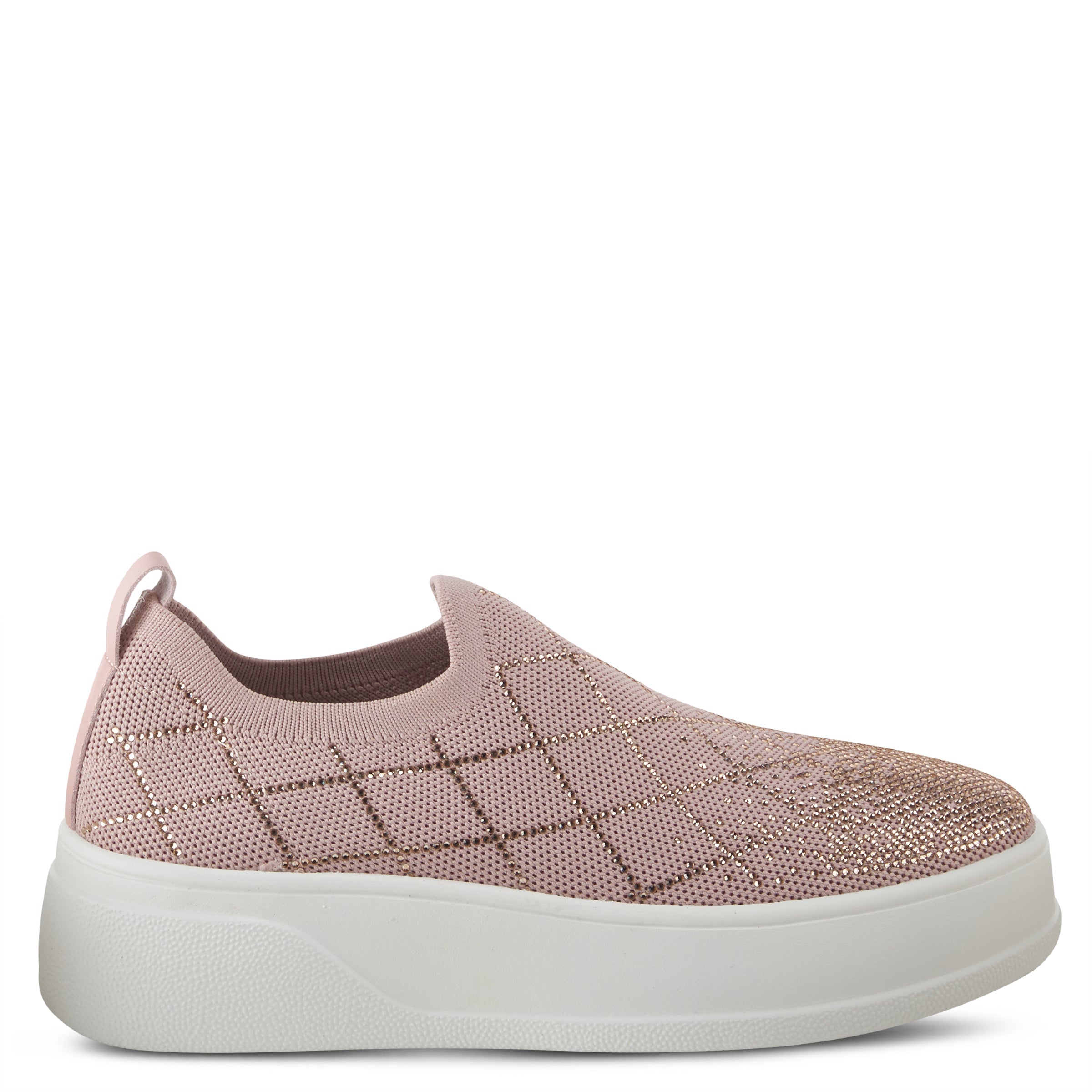 Trendy chic slip-on sneaker dripping in gemstones that make up a waffle pattern with a cushioned outsole on a chunky flatform.