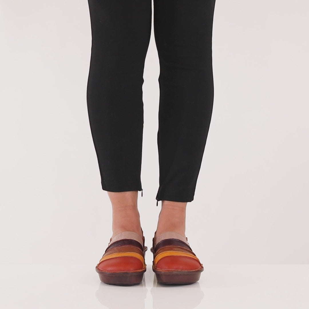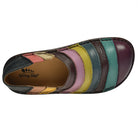 Multi-color tumbled leather patchwork closed-back clog styled with butted seams and elastic side gores.
