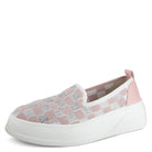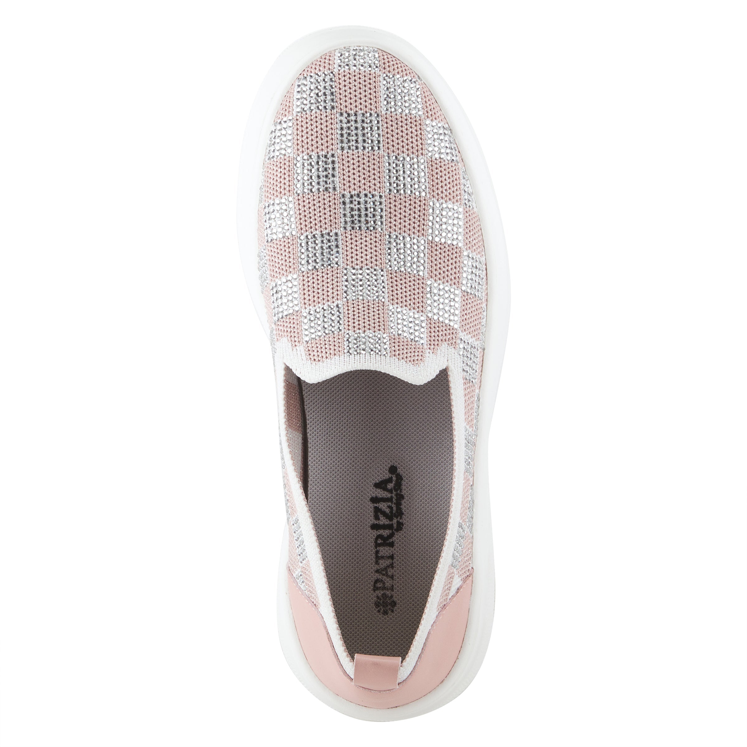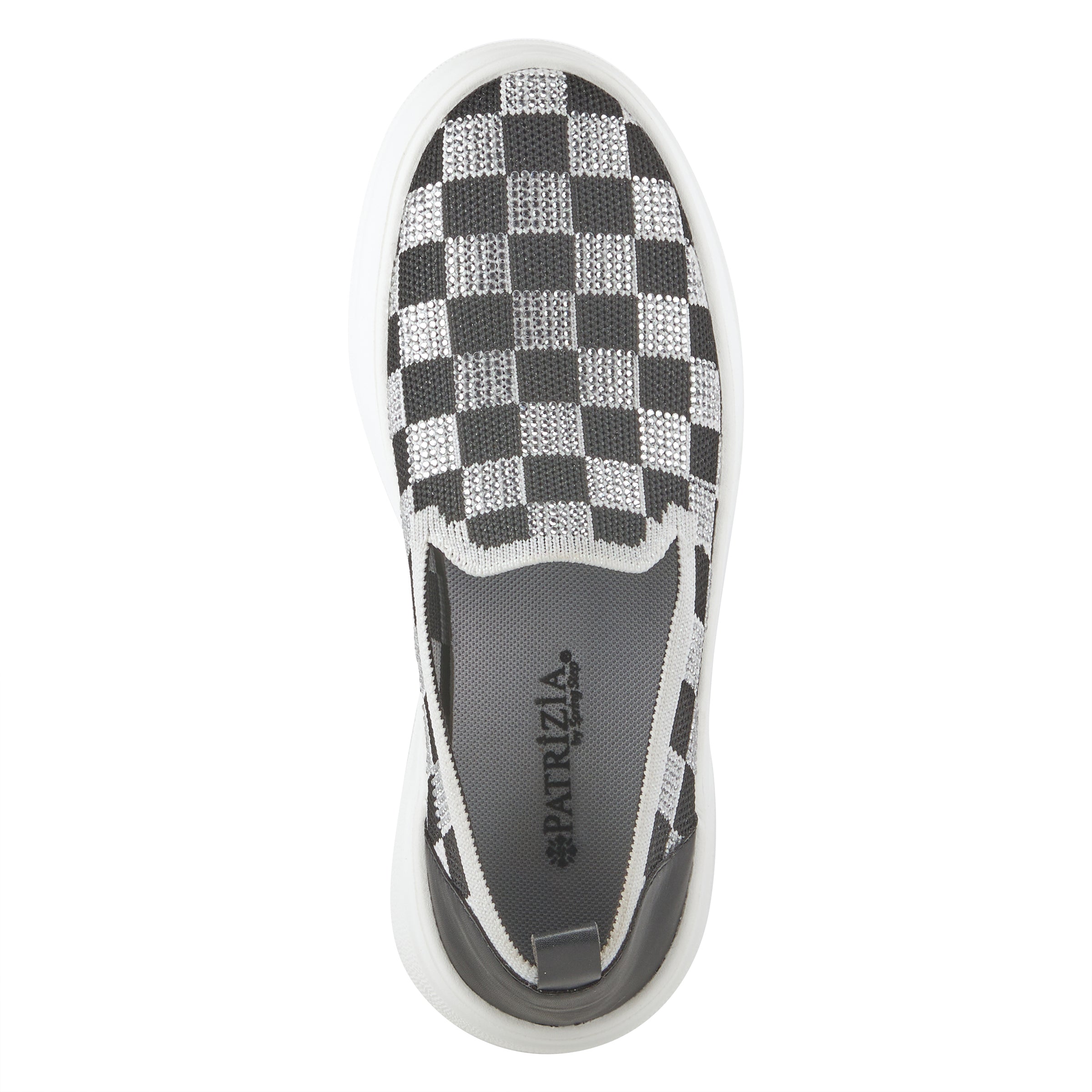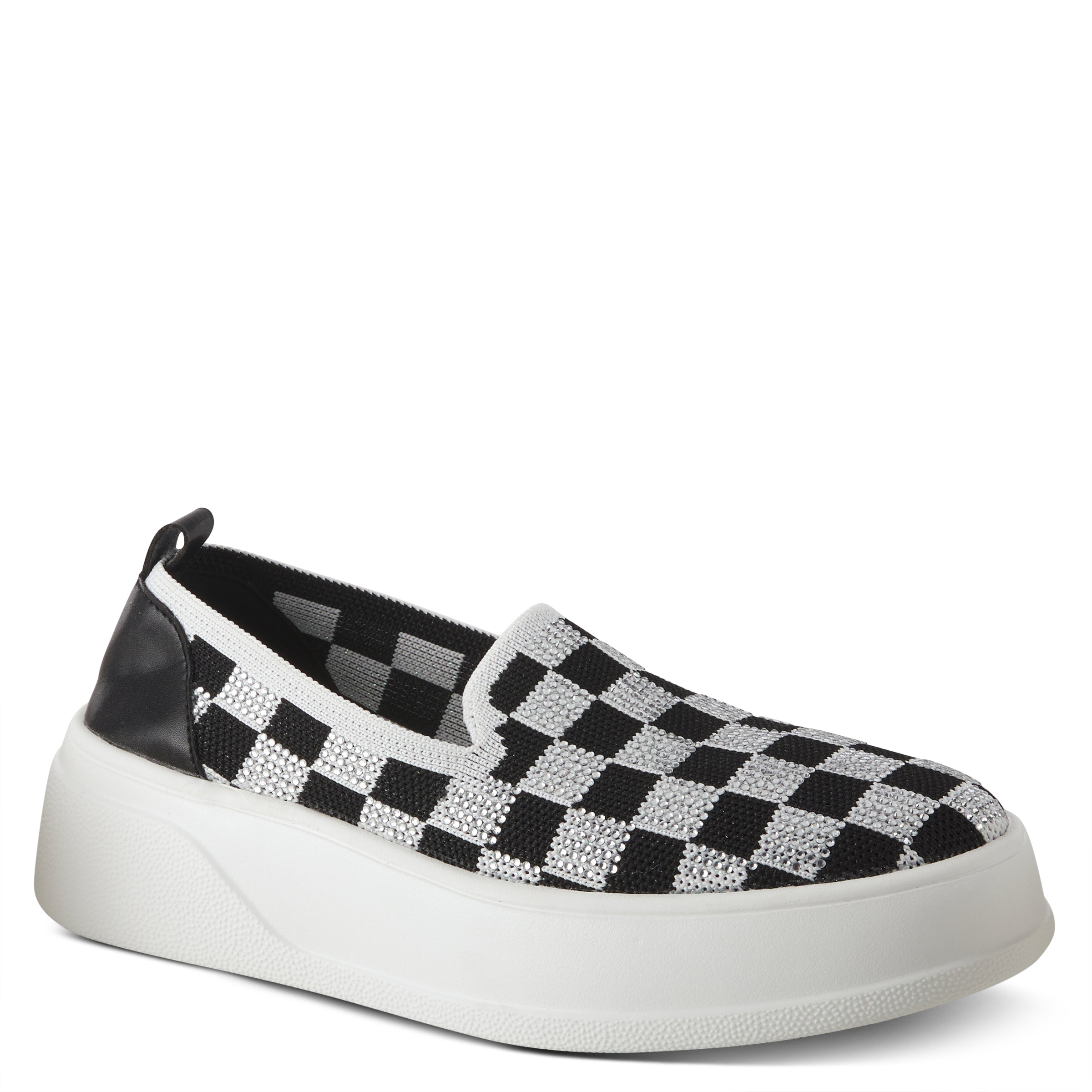 Trendy sparkly slip-on sneakers with a checker pattern made out of rhinestones on a chunky flatform embedded with a cozy outsole.