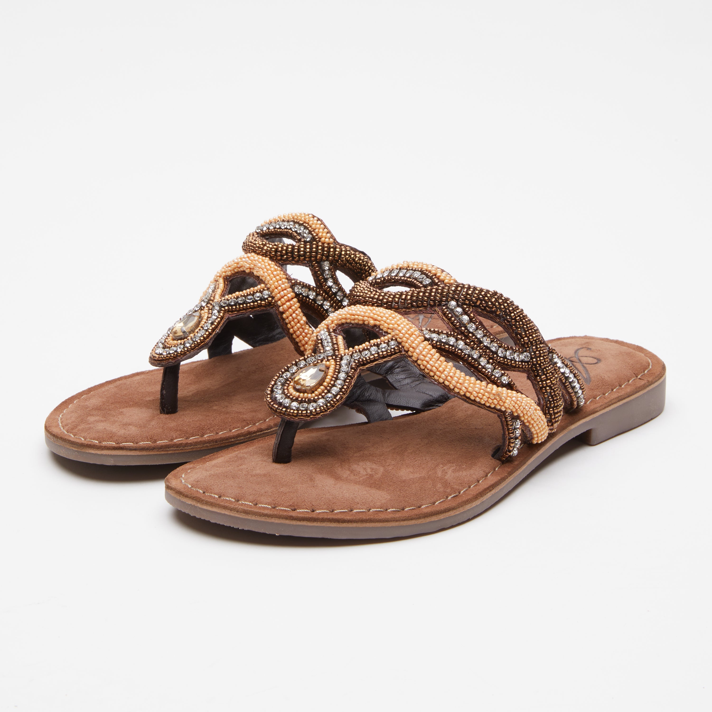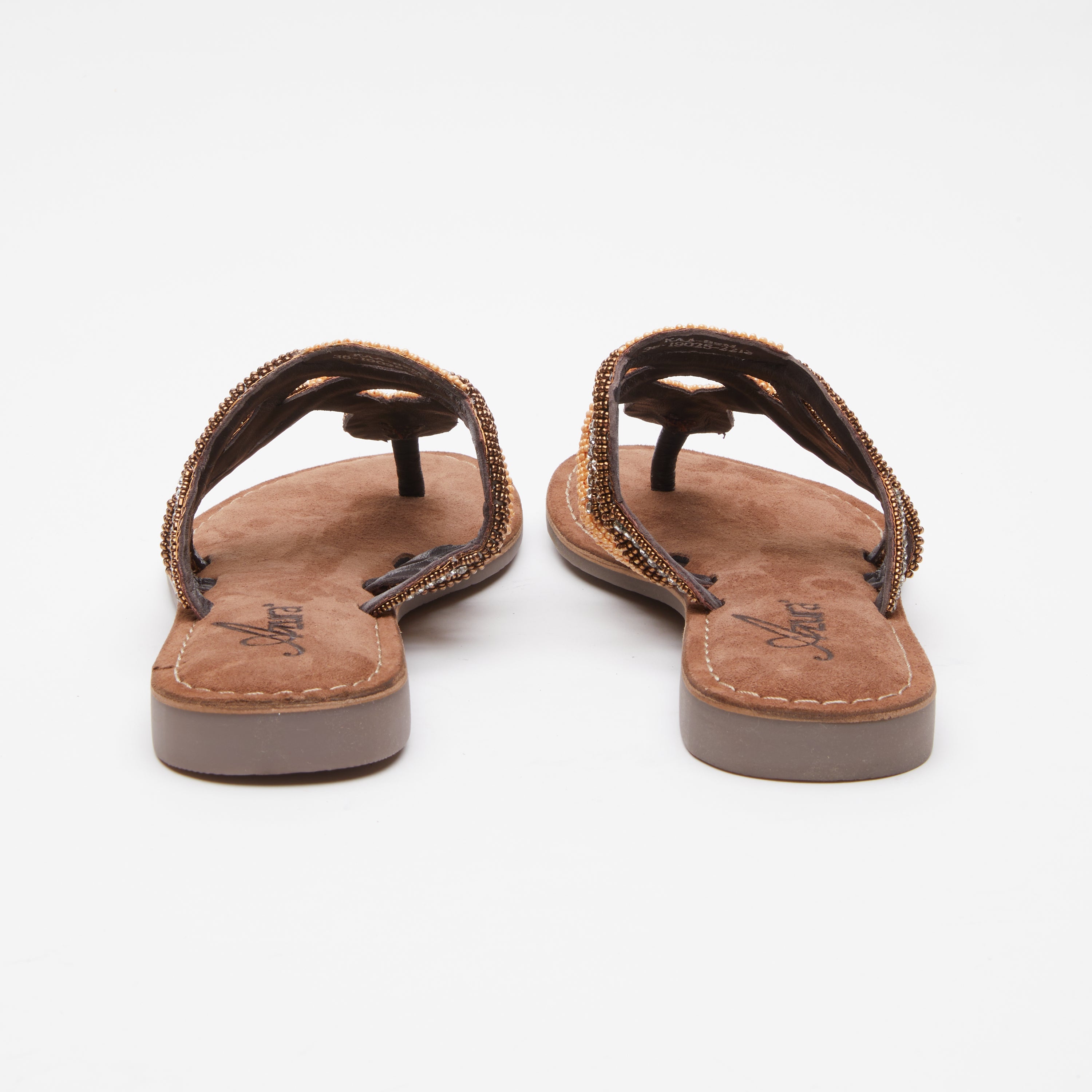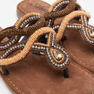 A plethora of extraordinary beaded straps with multicolored swirl designs on the ultimate flexible summer thong. The little heel and jewel at the center of the shoe makes it super unique.