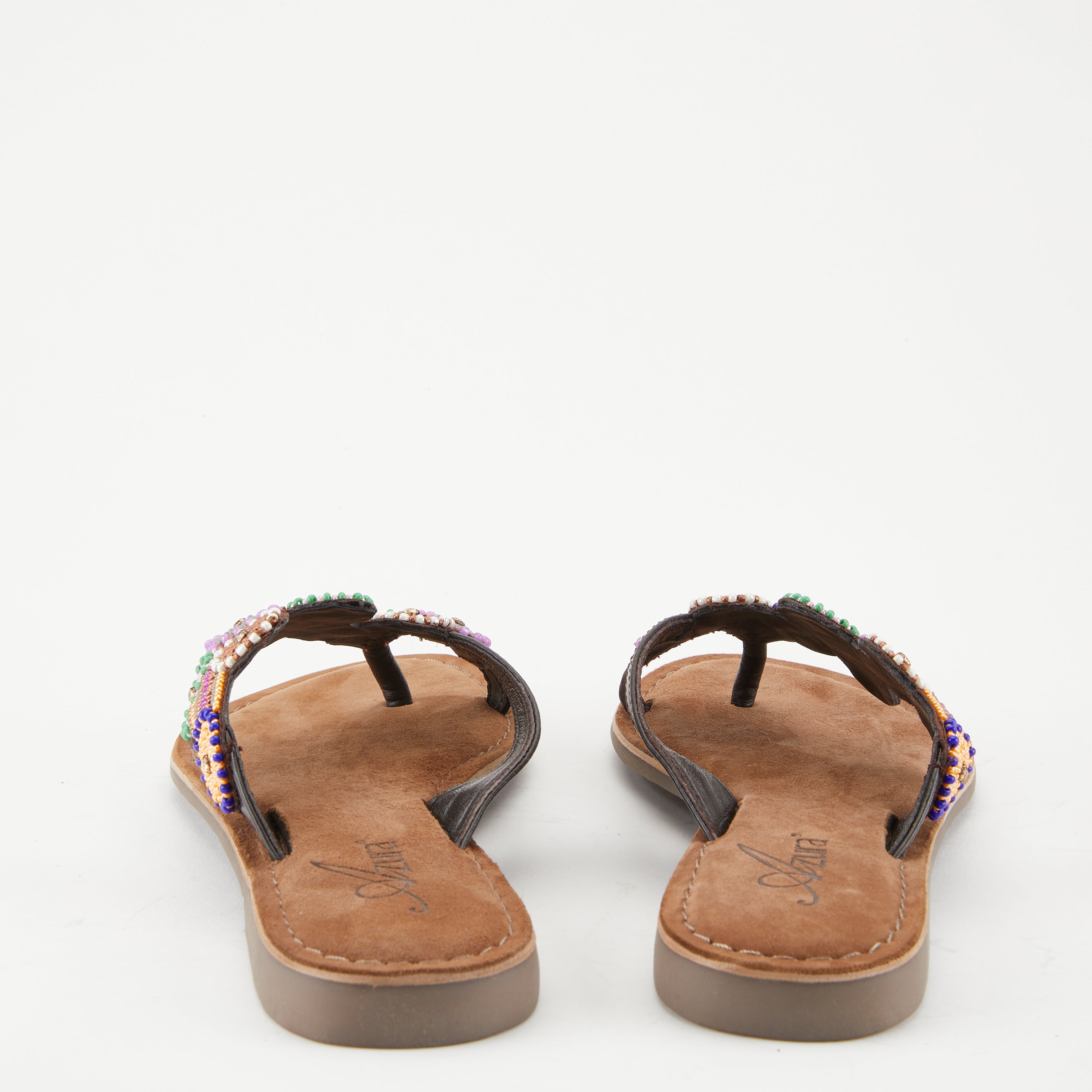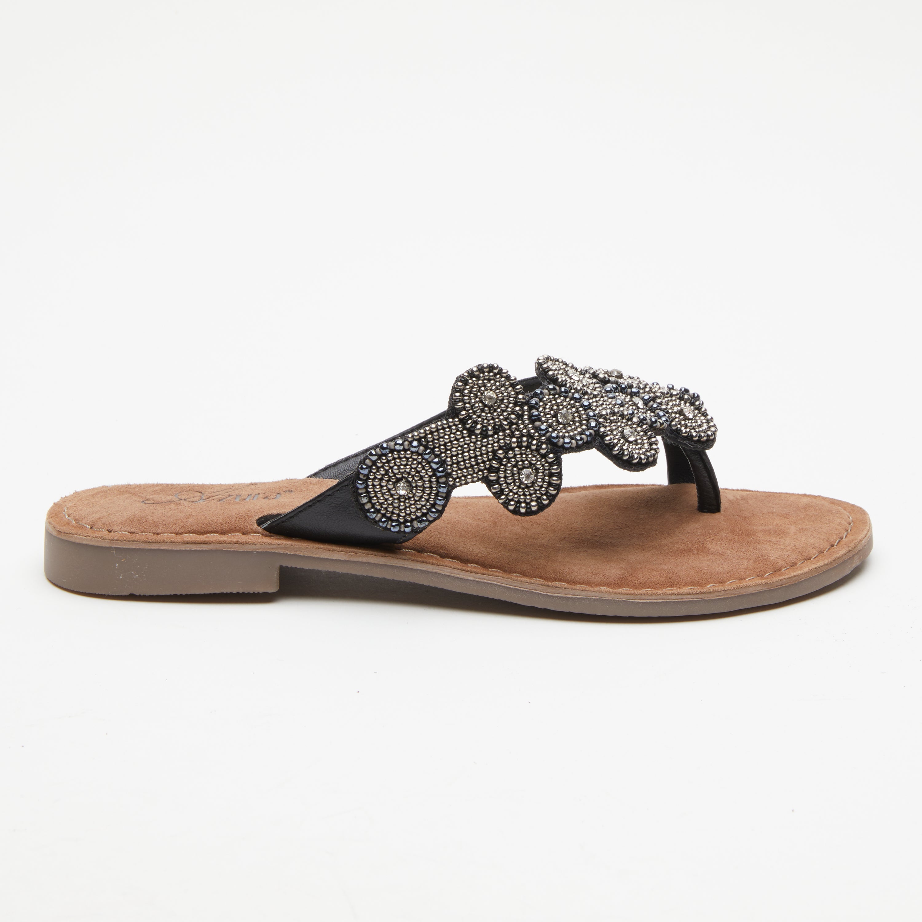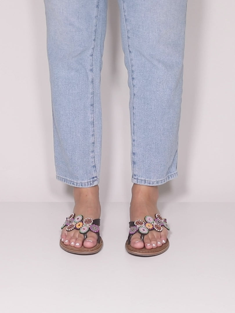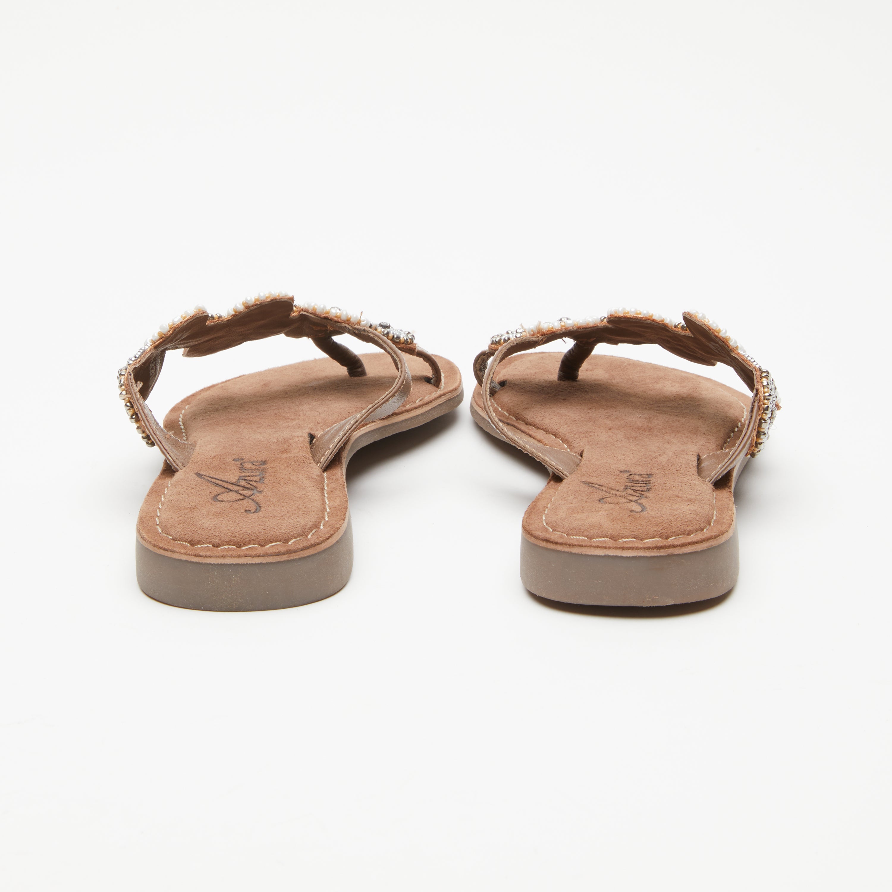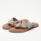 Native American influences on a premium leather toe loop slide sandal, featuring a beautifully handcrafted metallic bead and rhinestone applique. Tonal stitch work all on a flexible forefoot.