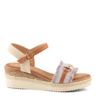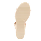 This platform wedge sandal exhibits a charming toe strap band and beautiful ankle strap, all assembled on a structured wedge heel.