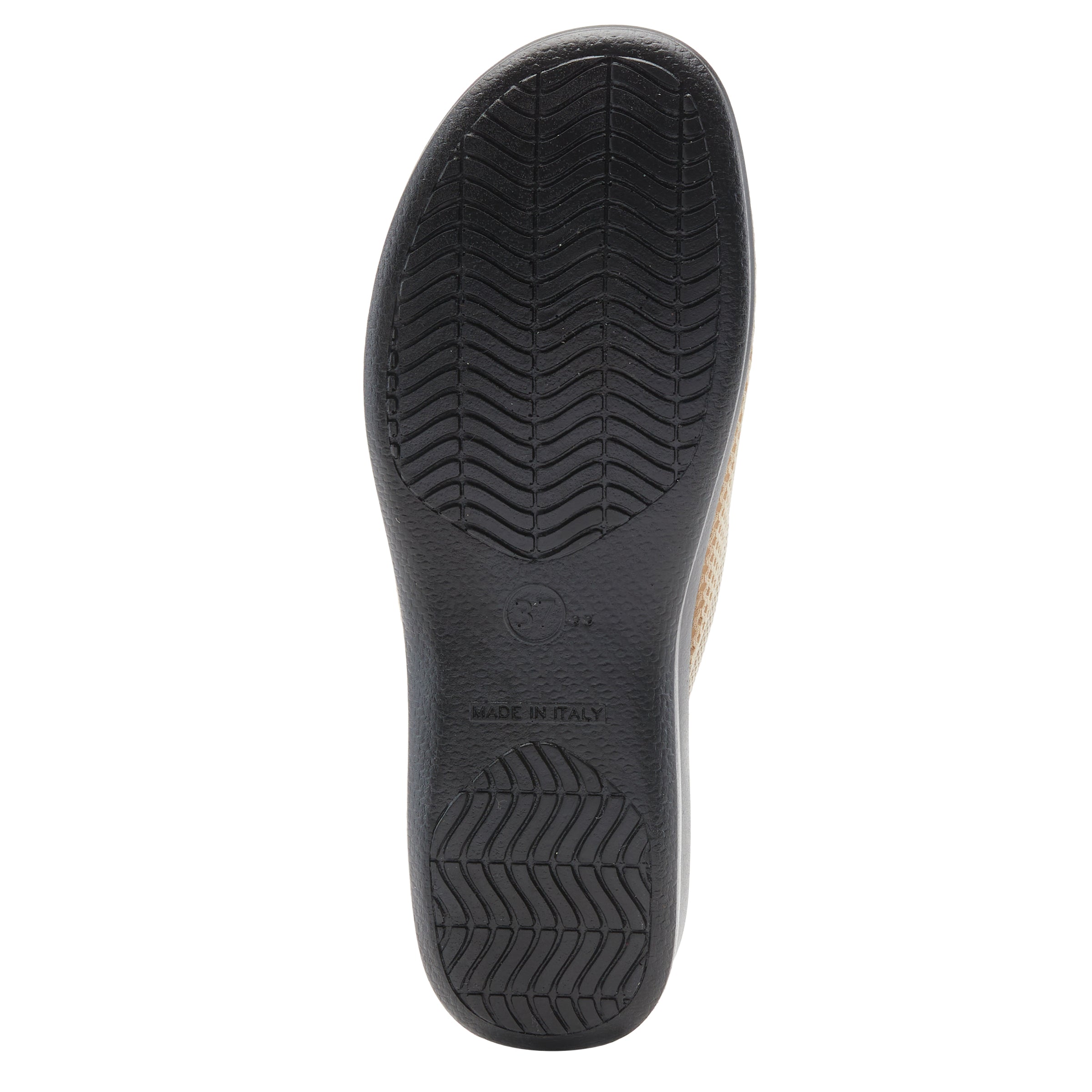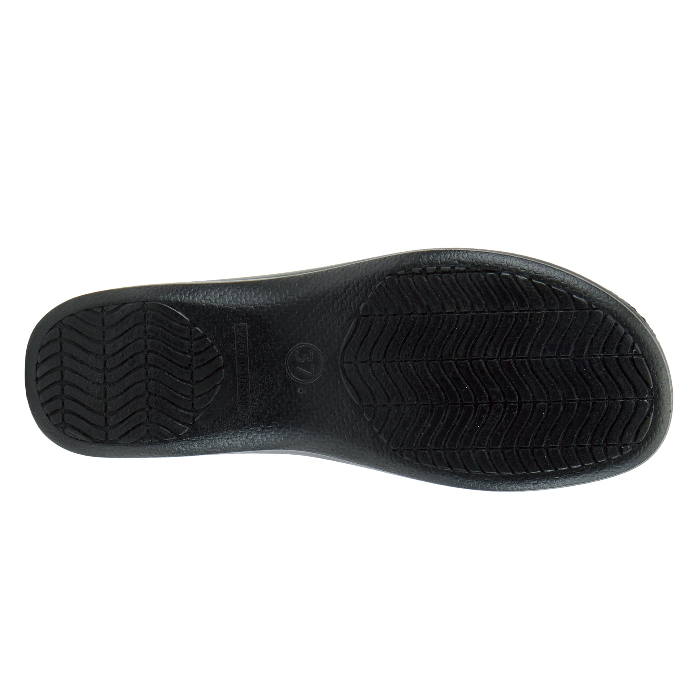 Ultra light weight slipper with mesh textile upper and metal trim design, featuring a full length leather padded footbed all on a flexible direct injection PU wedge sole.