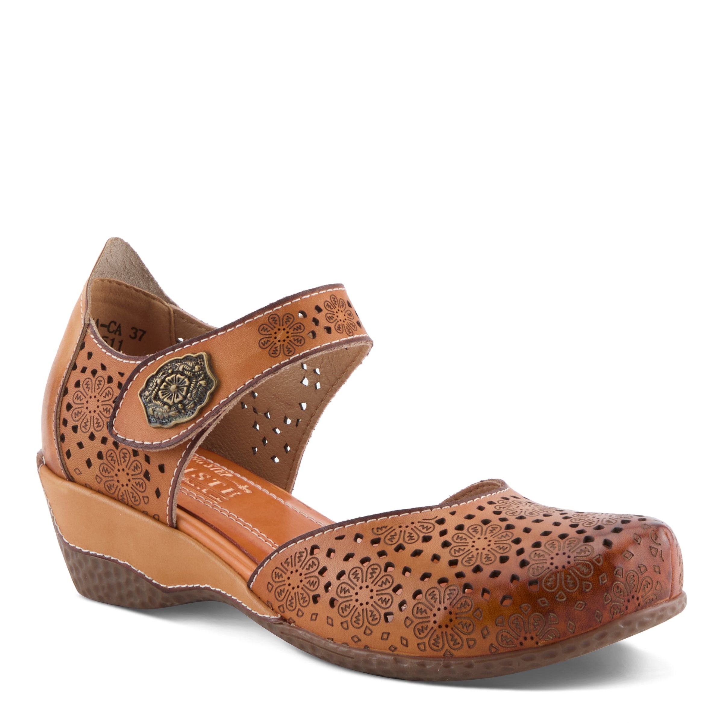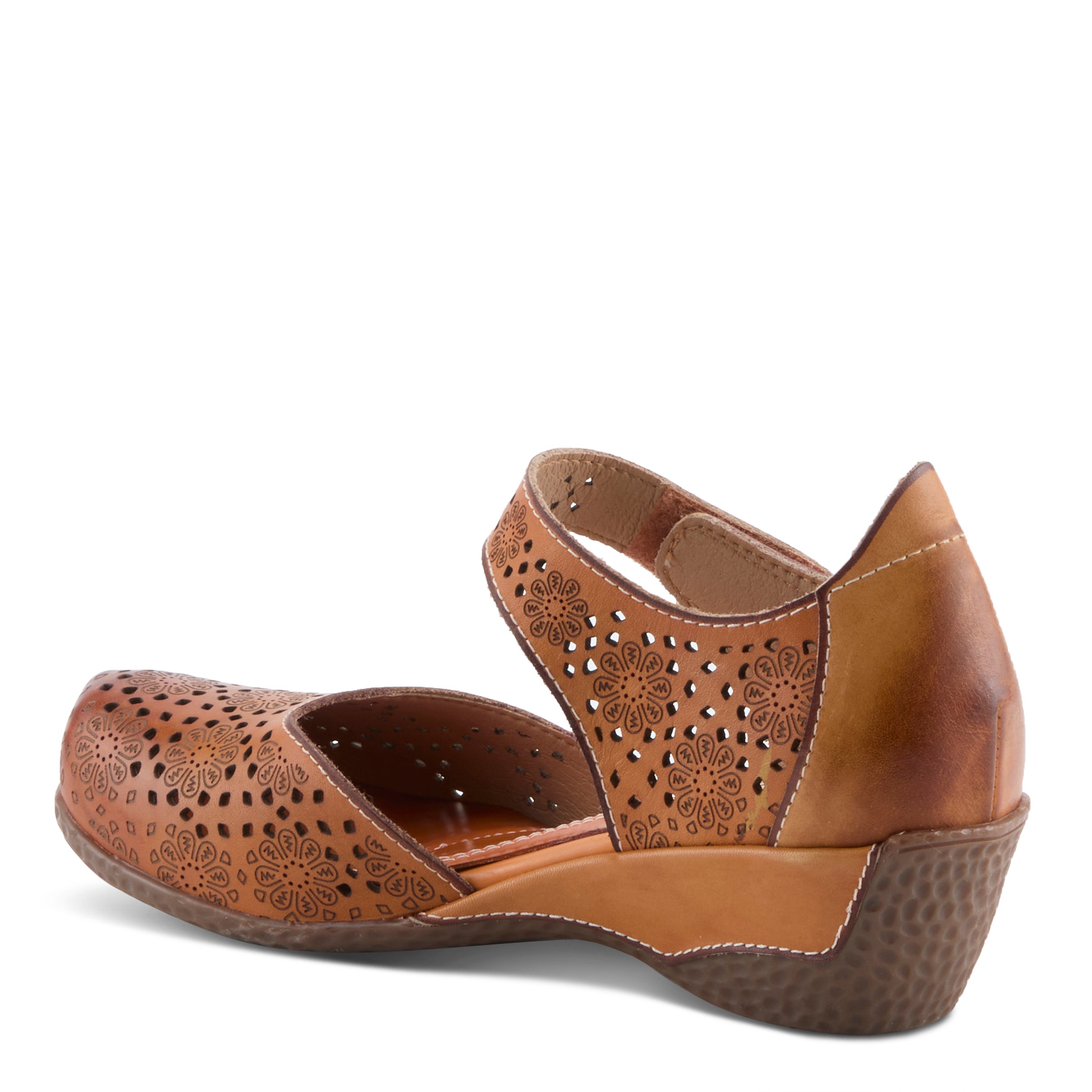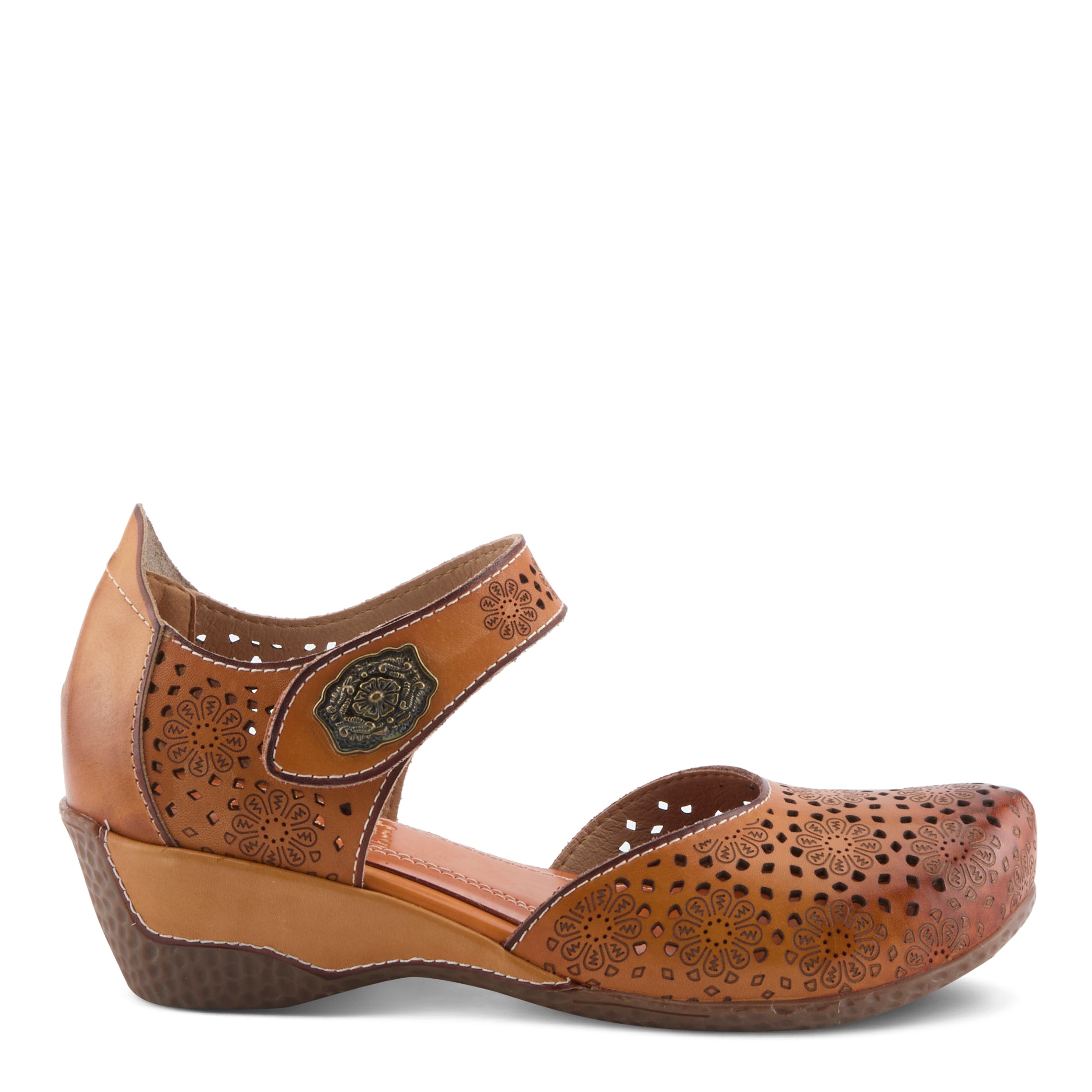 No boring sandals here – the Americana adds a unique flare to your everyday wedged sandal. This embossed floral decorative buckle compliments the shoe as well as the perforated floral pattern and cut-outs.