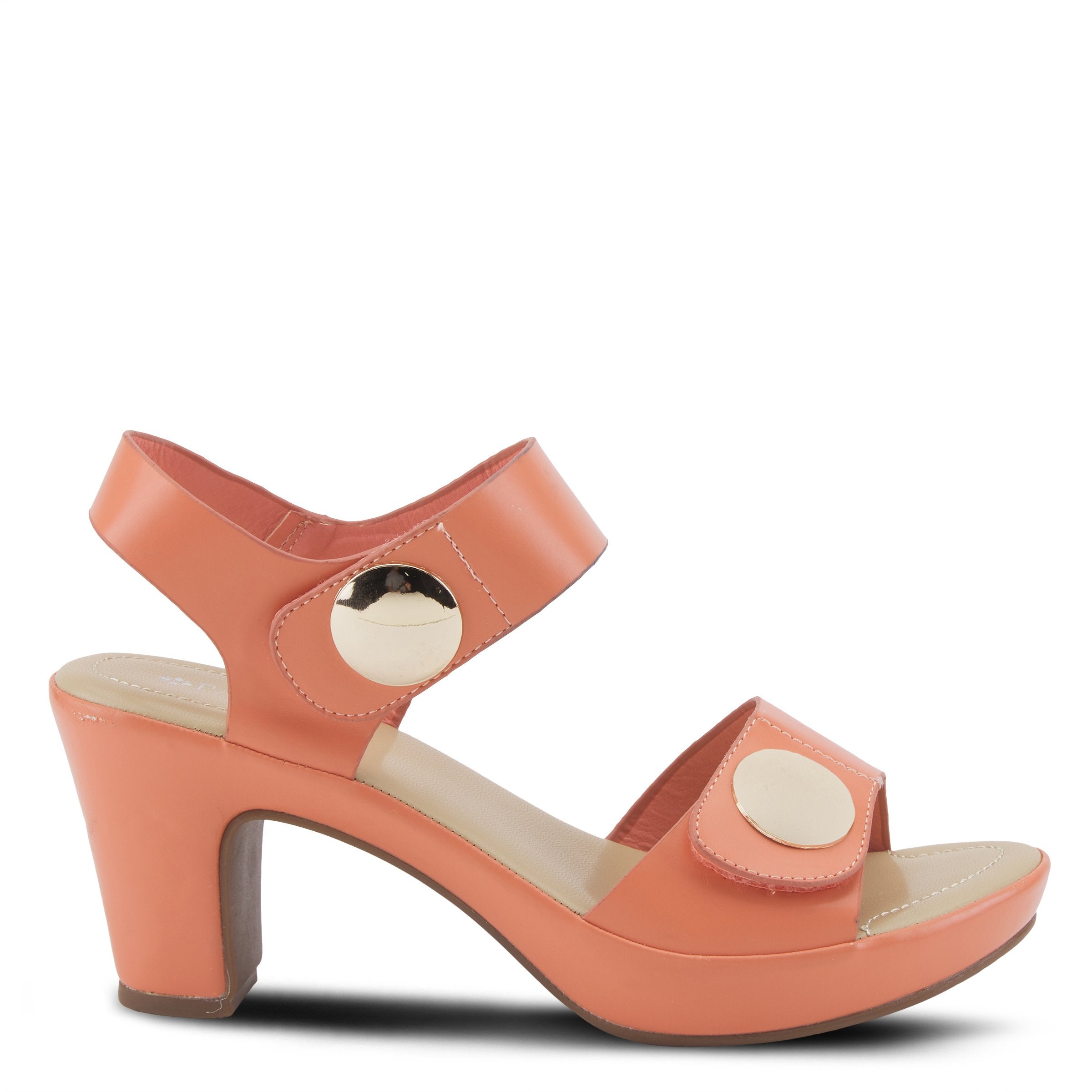 Trendy quarter strap sandal featuring a beautiful wide band design and adjustable hook and loop straps with polished metal ornaments all on a sophistication-inspired, comfort heel with a platform.