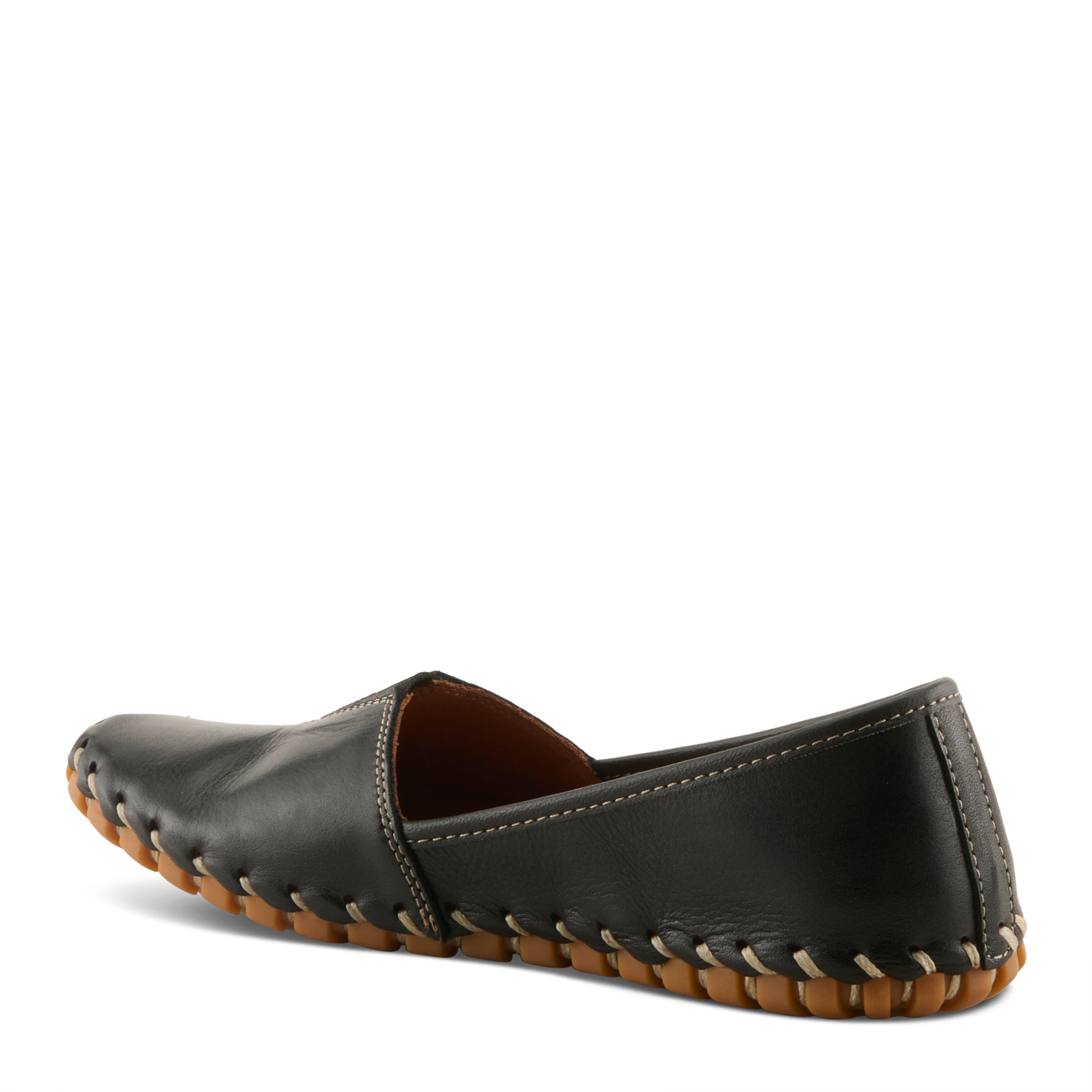 Mediterranean influenced, high quality premium leather slip-on shoe featuring a center notched vamp with a V-shaped stretch elastic insert, and dainty tonal stitchwork all on a strong stitched to sole construction, sculpted, comfort flat with a flexible forefoot and removable insole.