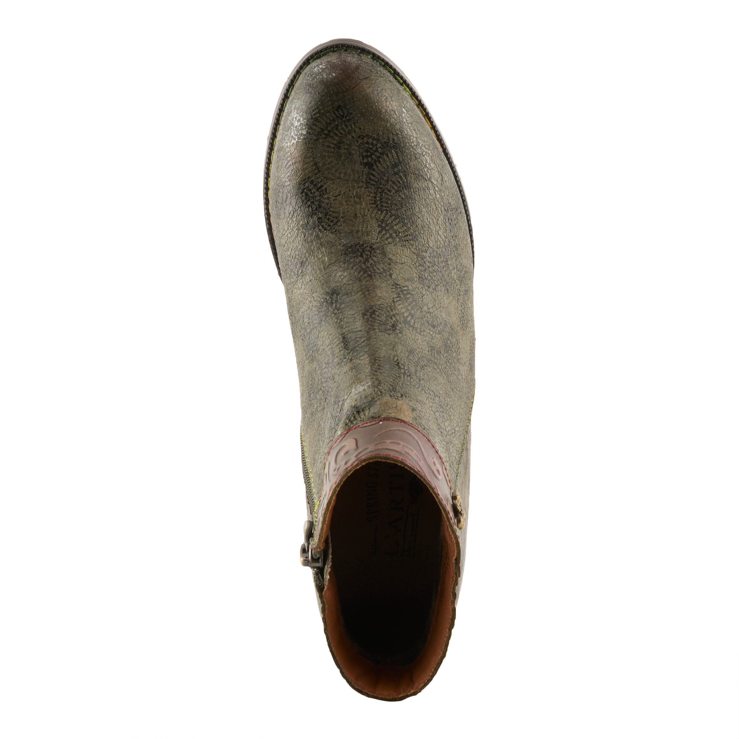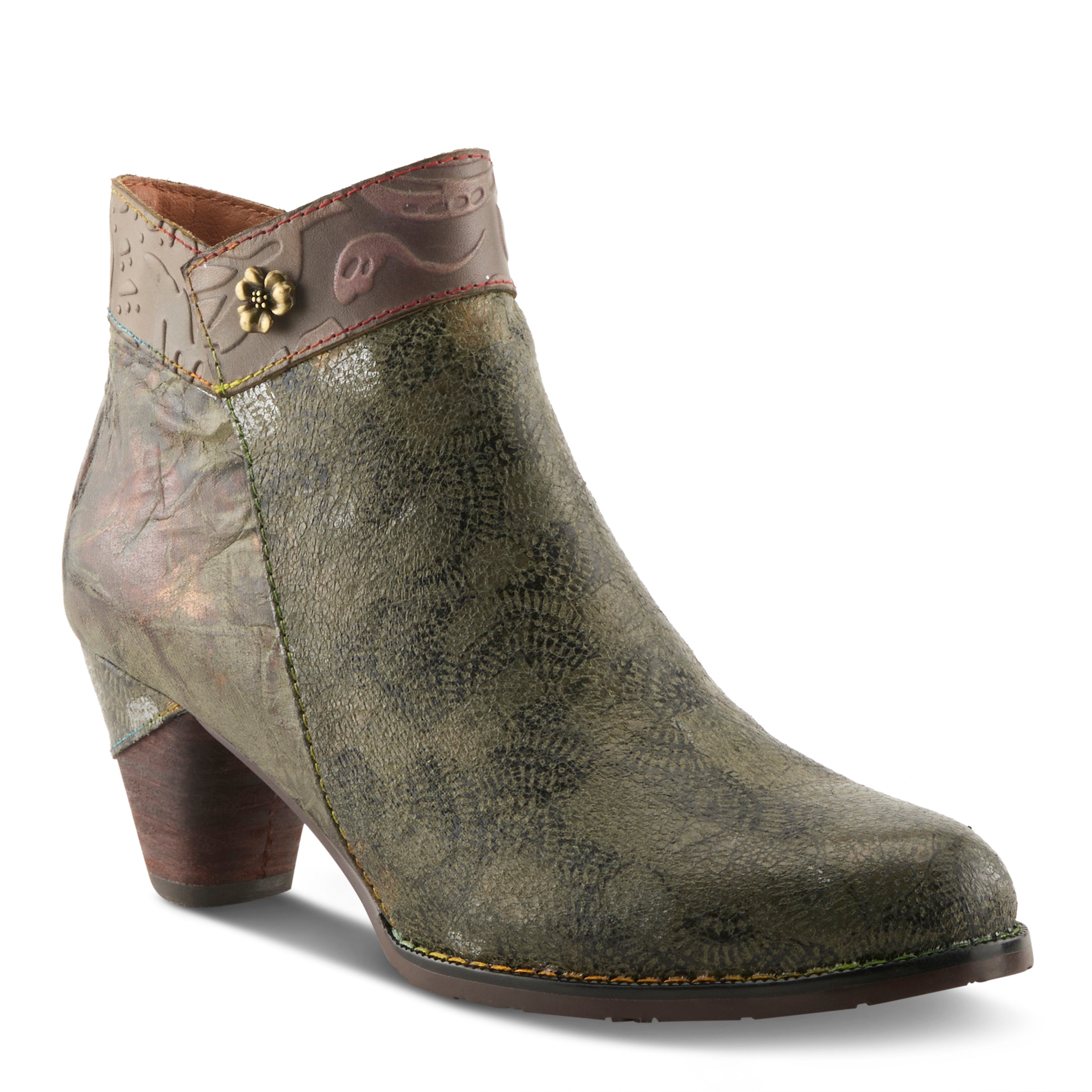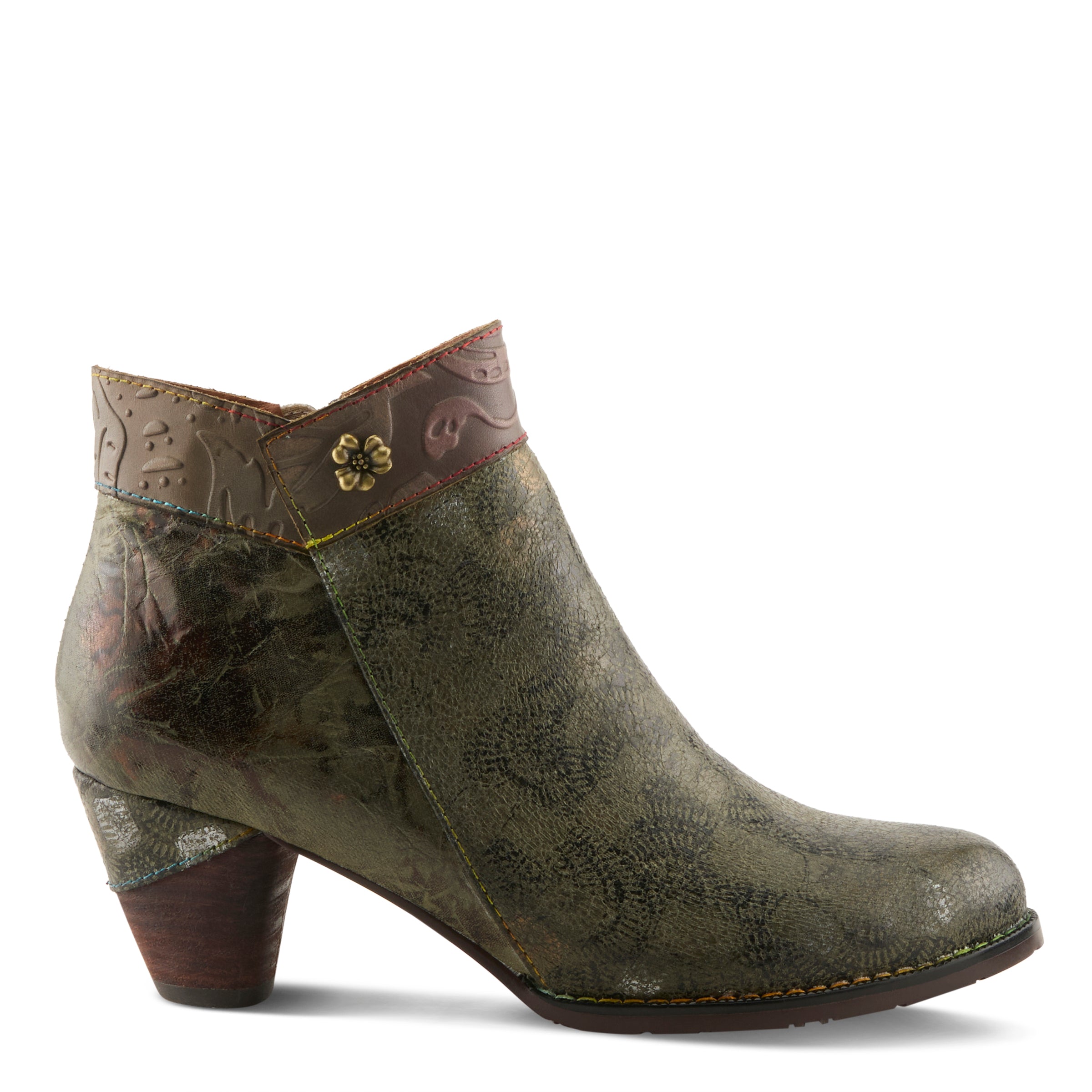 Subtle all-over metallic brush strokes on the front rough-out leather upper, with whispie lightning strike highs and lows on a smooth man made back. Sexy double inside and out dipped embossed leather collar, with inside zipper and outside antiqued brass Pansy floral embellishment. Signature L'Artiste rainbow stitching, stacked leather edged all day comfort pyramid heel, silky printed velvet lining with extra cushiony comfort footbeds.