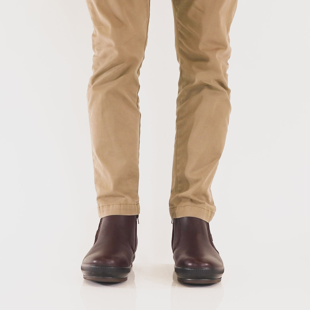 -Round toe, genuine leather, elastic goring, padded heel collar.